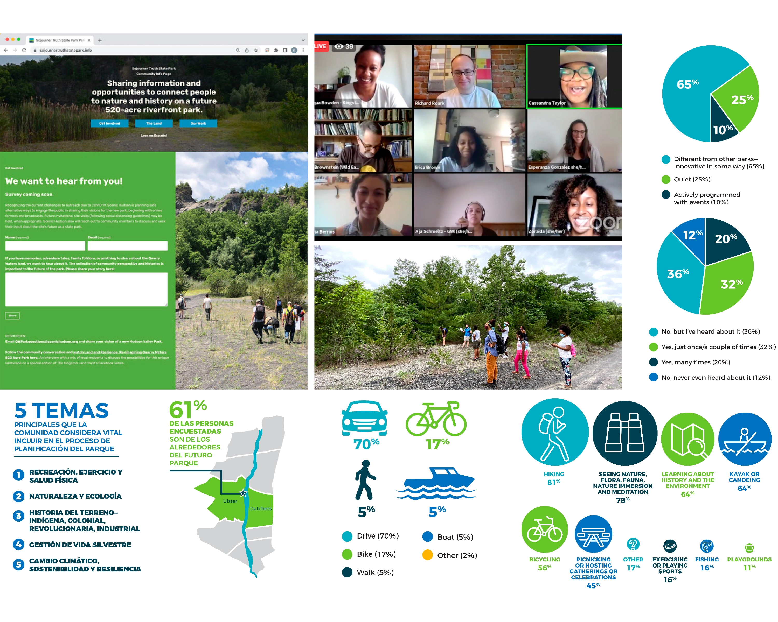Analysis and Planning Effort: The Sojourner Truth State Park Framework Plan was developed according to a comprehensive site inventory and analysis process. This included cultural heritage research, historic structure assessment, site modeling, context mapping, and a rapid ecological assessment (REA), followed by an eight-month natural resources inventory and habitat value assessment. The planning process involved robust engagement with community members, partners, local nonprofits, institutions, indigenous representatives, and government leaders through interviews, site walks, and online events. This multifaceted approach ensured a thorough analysis and planning effort that underpins the framework plan.