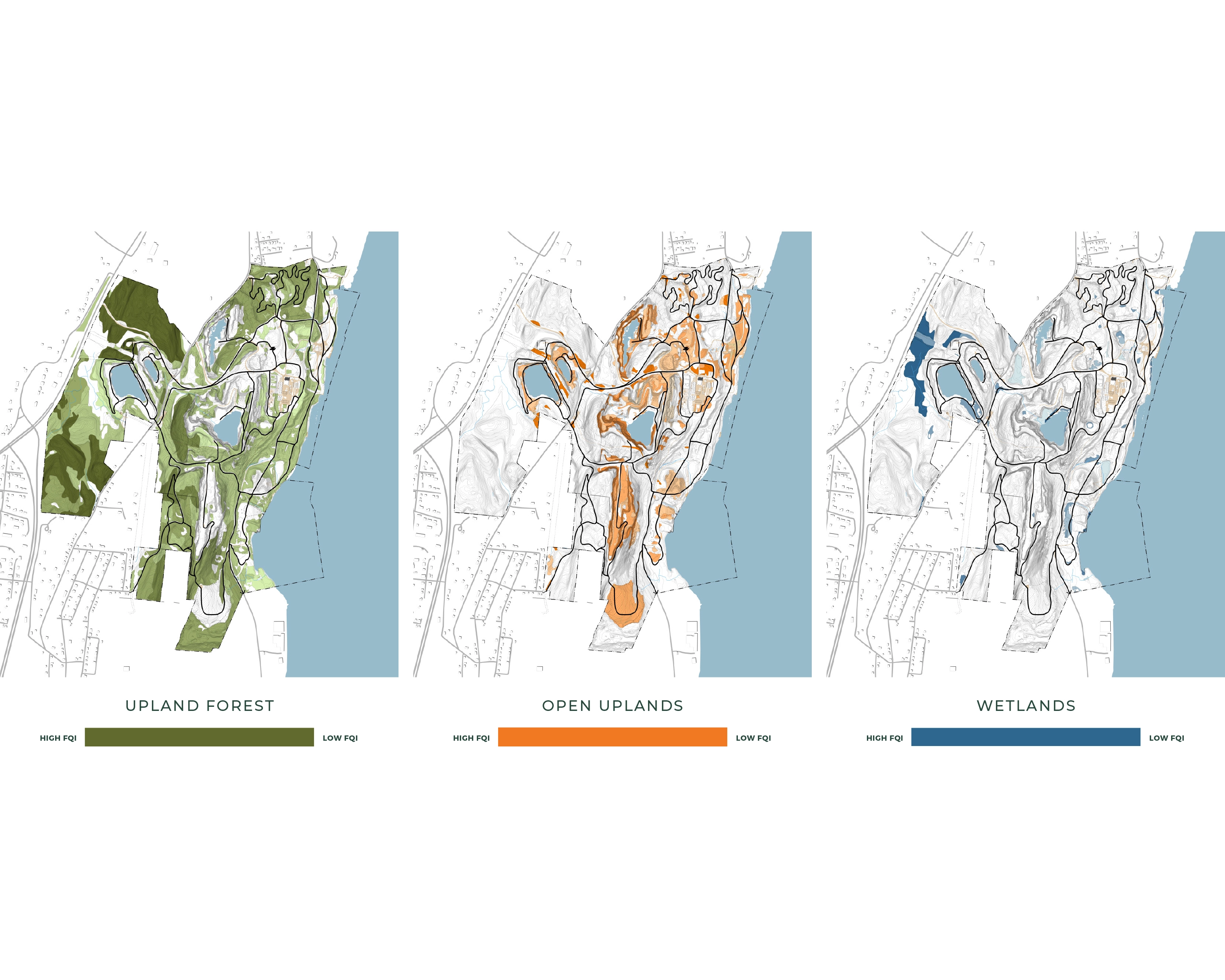 Context: Situated on 520-acres of abandoned quarry land in the City of Kingston and adjacent to the Town of Ulster, the site includes diverse natural features such as woodlands, wetlands, quarry lakes, and Hudson River waterfront. The area's history spans from its pre-industrial home to the Esopus people and later as the "Kingston Commons," and through a century of extractive industry use and abandonment, led to its current state: part wild and heavily degraded. The plan is deeply informed by understanding local communities of the area including diverse Black and Hispanic communities.