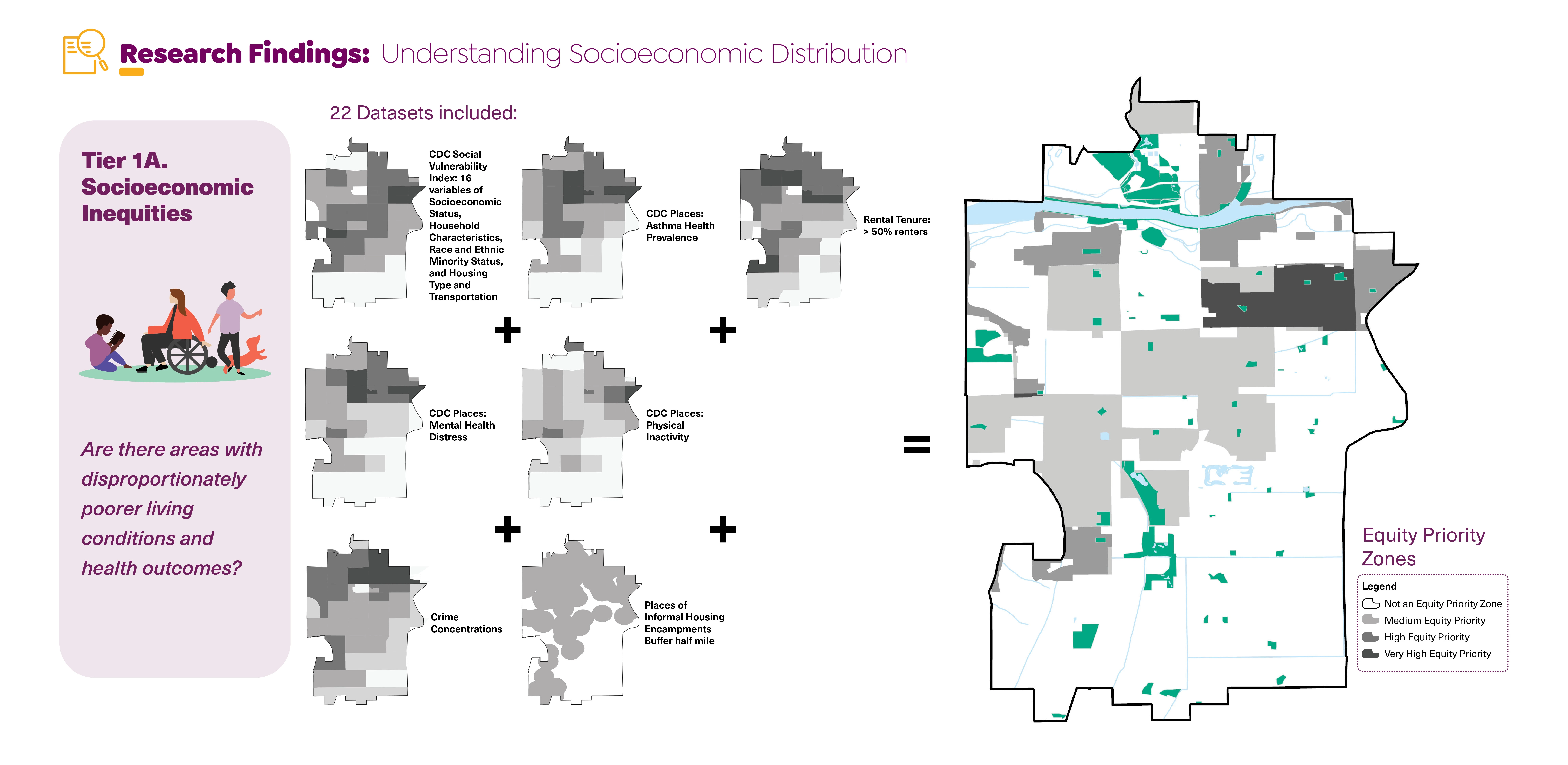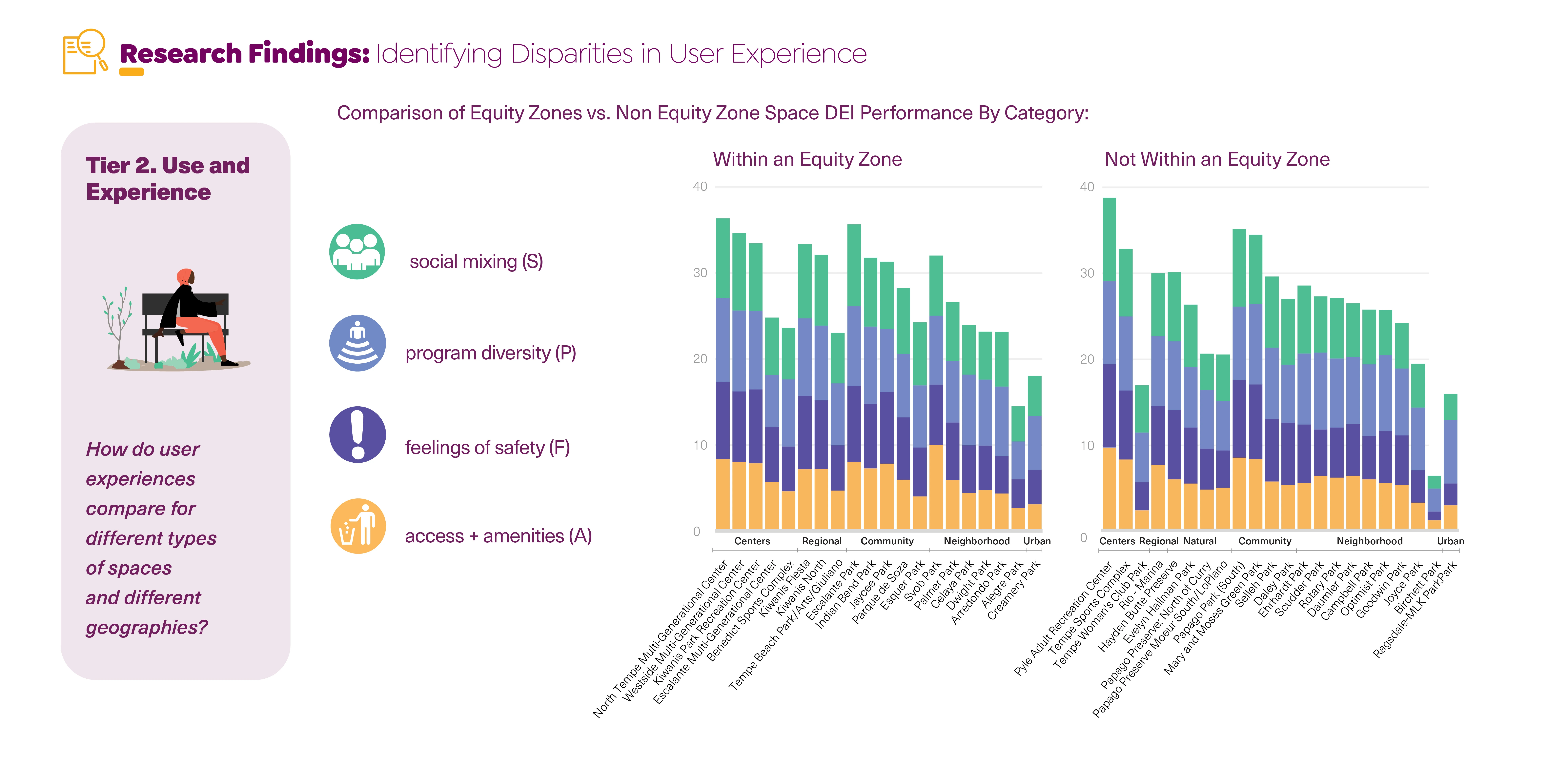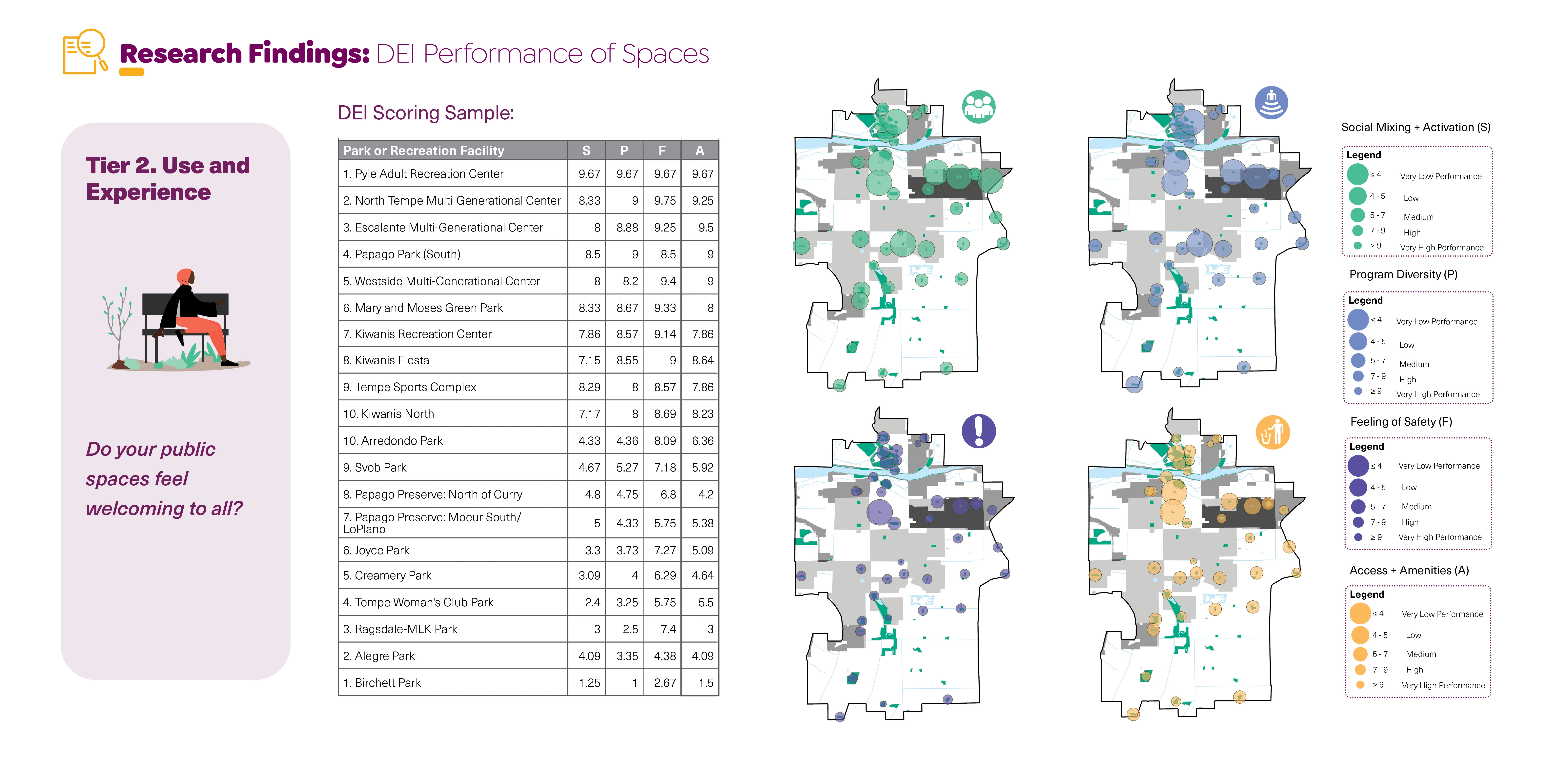 The innovative four-step process designed to investigate such circumstances reveals trends that are then used to help cities secure and prioritize investment for highest-need areas. This study greatly improves current park planning that is limited to measuring parks per total population and geographic service areas. Instead, it provides inventive measures of public space performance including quantifying feelings of safety, climate sanctuary, resiliency, and cultural representation.