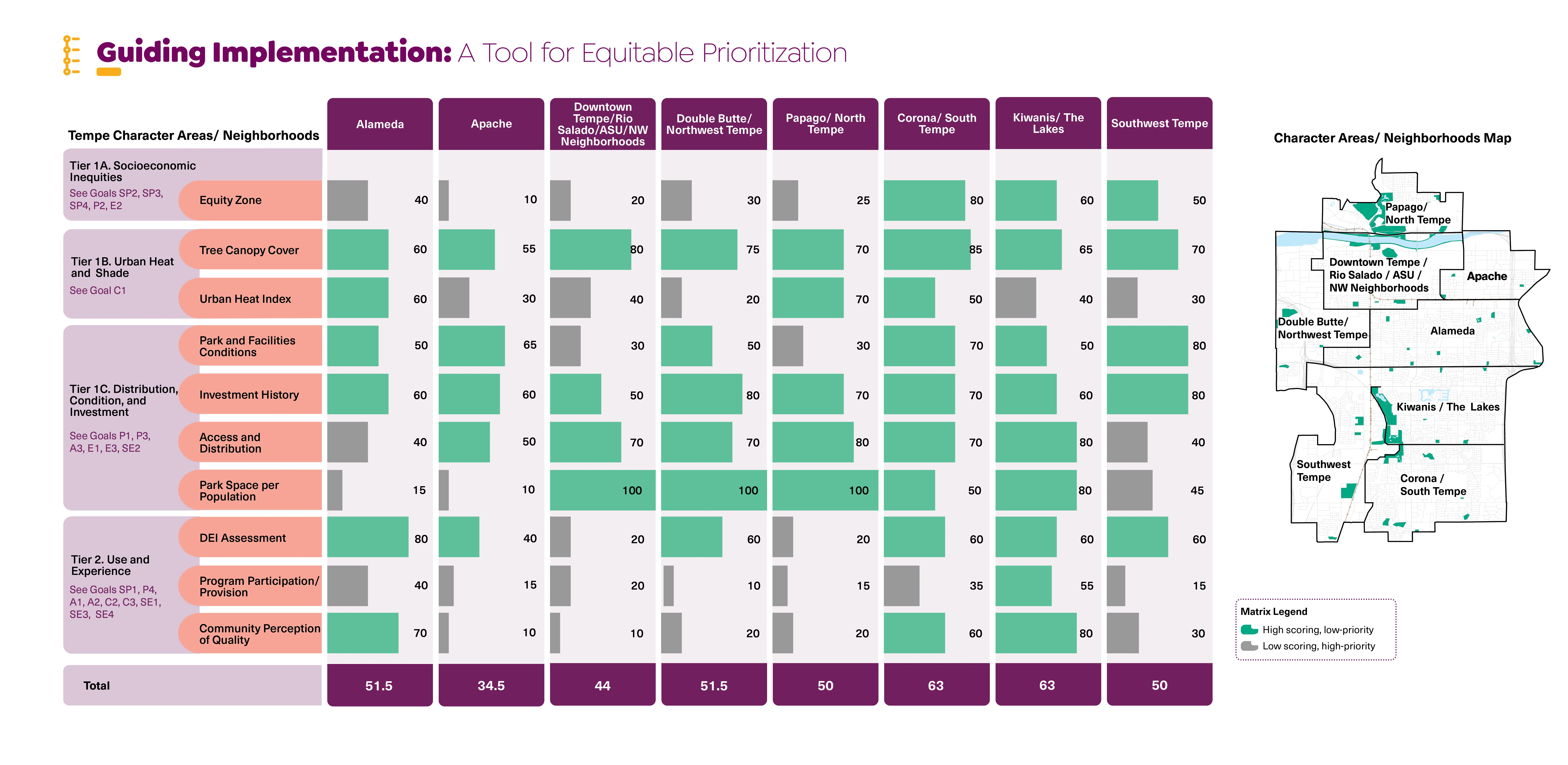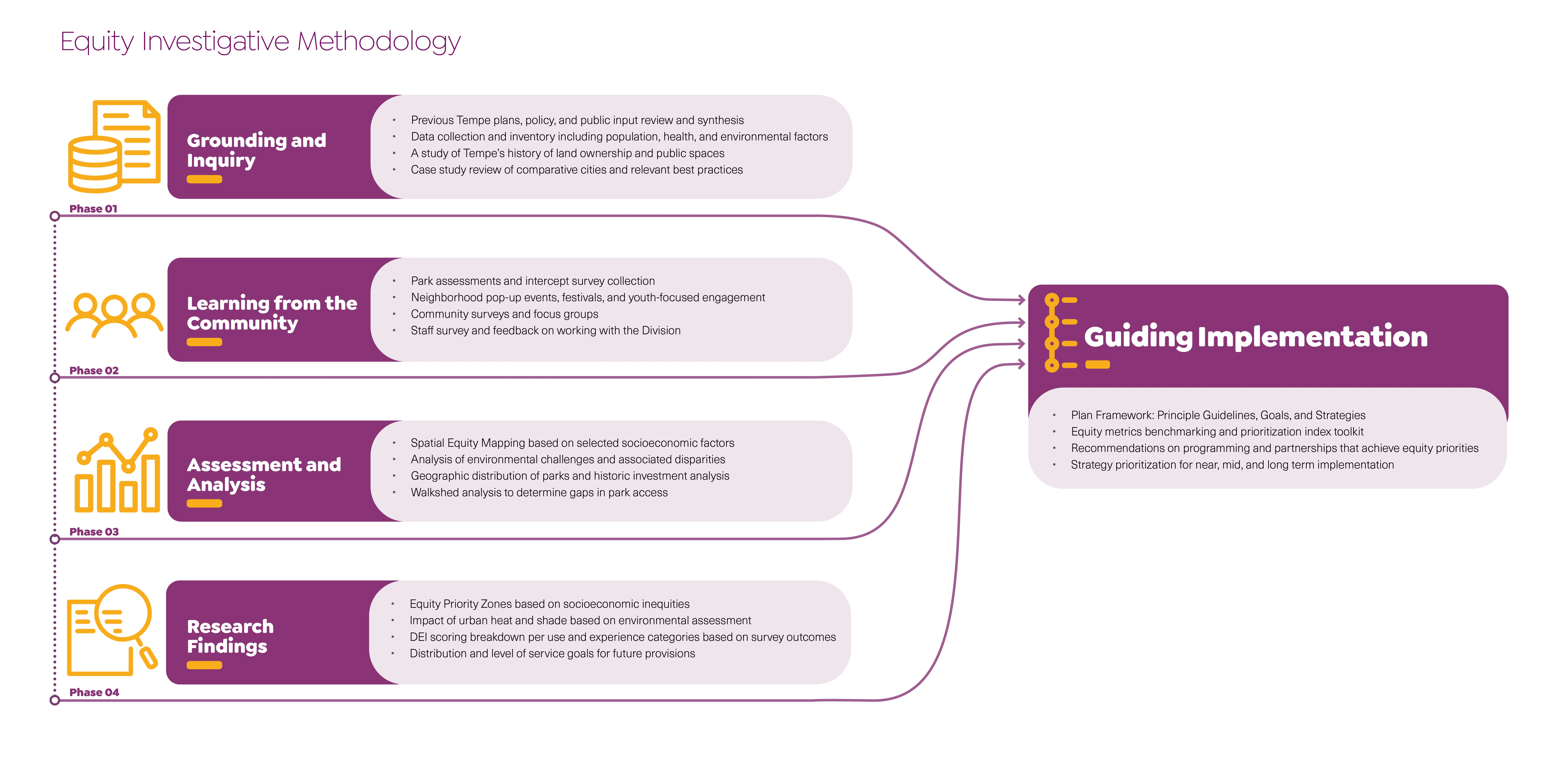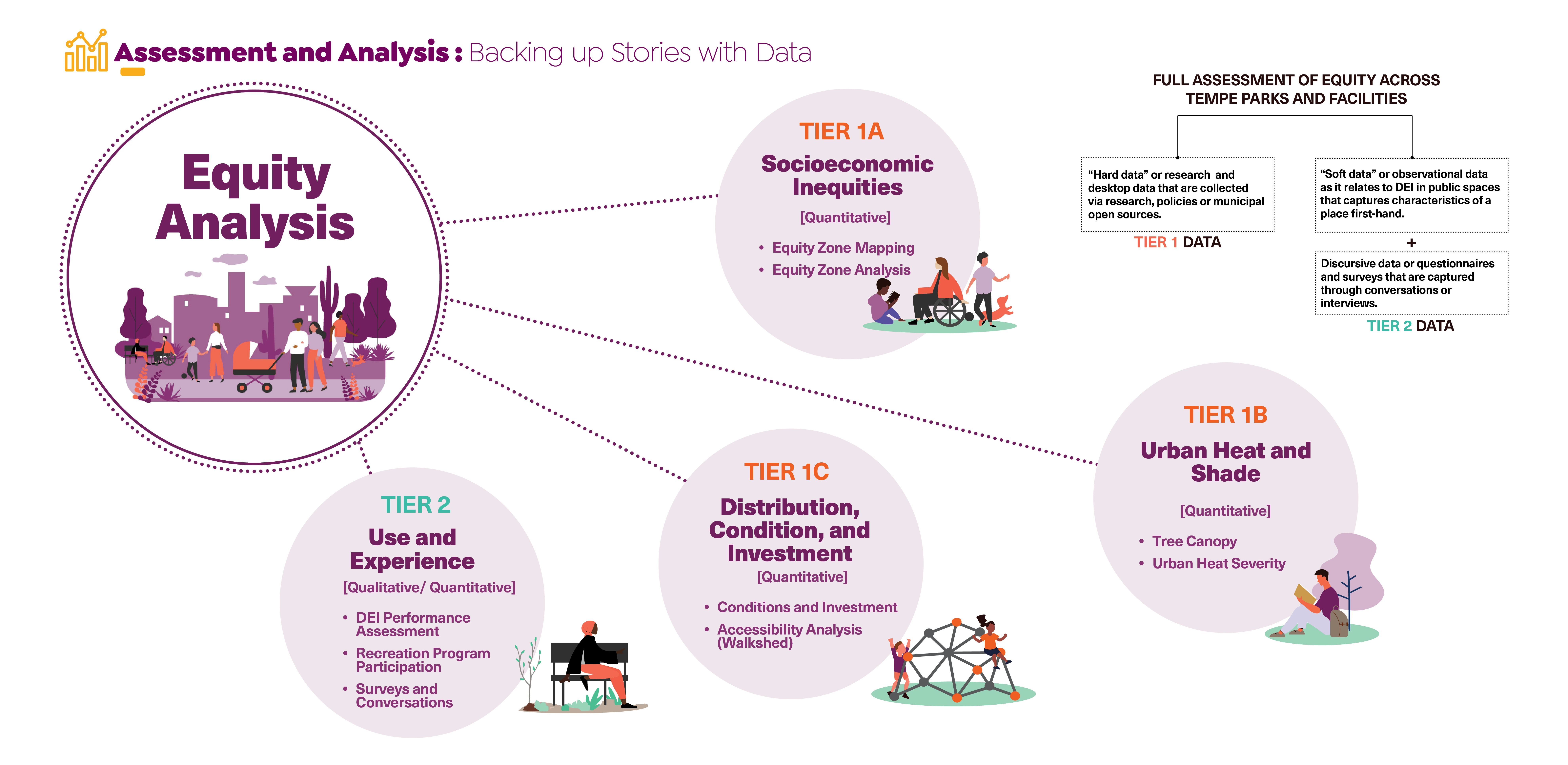 The inquiry phase included a review of Tempe’s existing planning and policy documents, a review of the city’s historic land planning practices, local factors effecting climate resilience, and a synthesized case study analysis comparing equity reports for peer communities and best practices. The second phase focused on generating an equity analysis framework (based on tier 1 data), highlighting systemic inequities around socioeconomic disparity and environmental impact data, and park distribution, condition, and investment trends. The third phase paired with findings from the second phase involved a robust community engagement campaign comprised of community navigator-led park assessments, park intercept surveys, neighborhood pop-up events, topical focus groups, and staff surveys (tier 2 data). This ultimately informed the fourth research phase that translated the rigorous analysis process into actionable next steps for the City to undertake in partnership with local stakeholders.