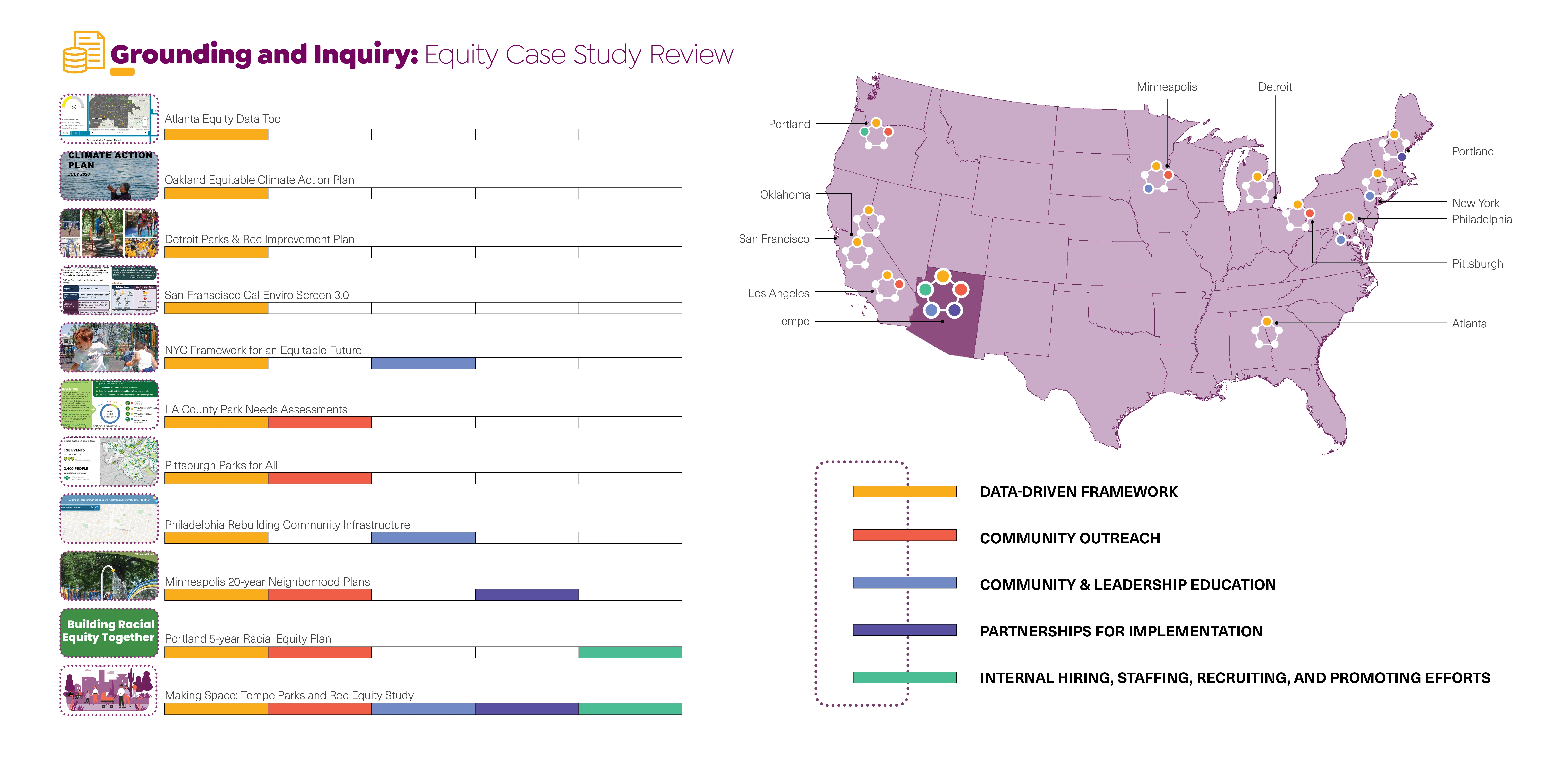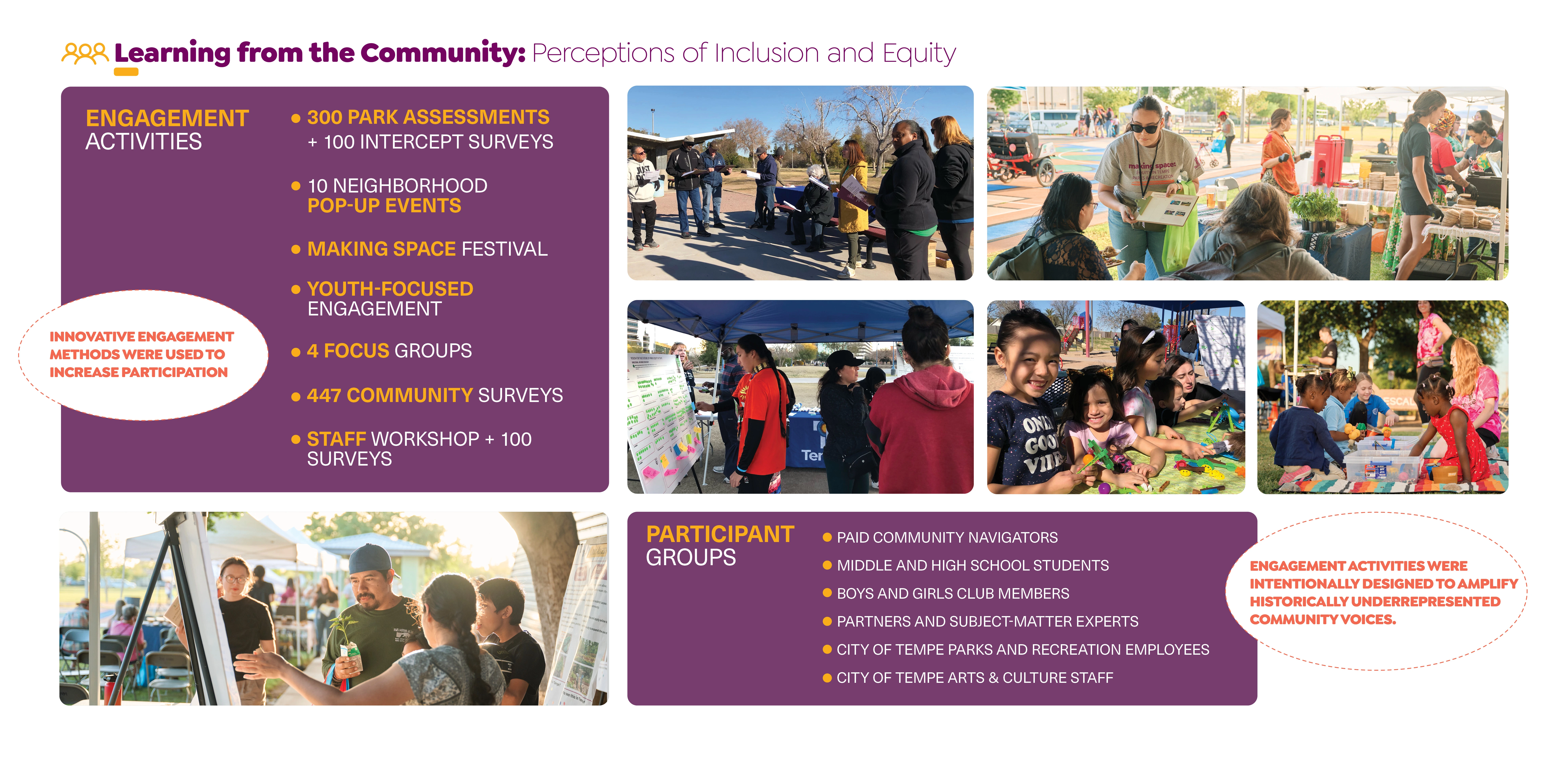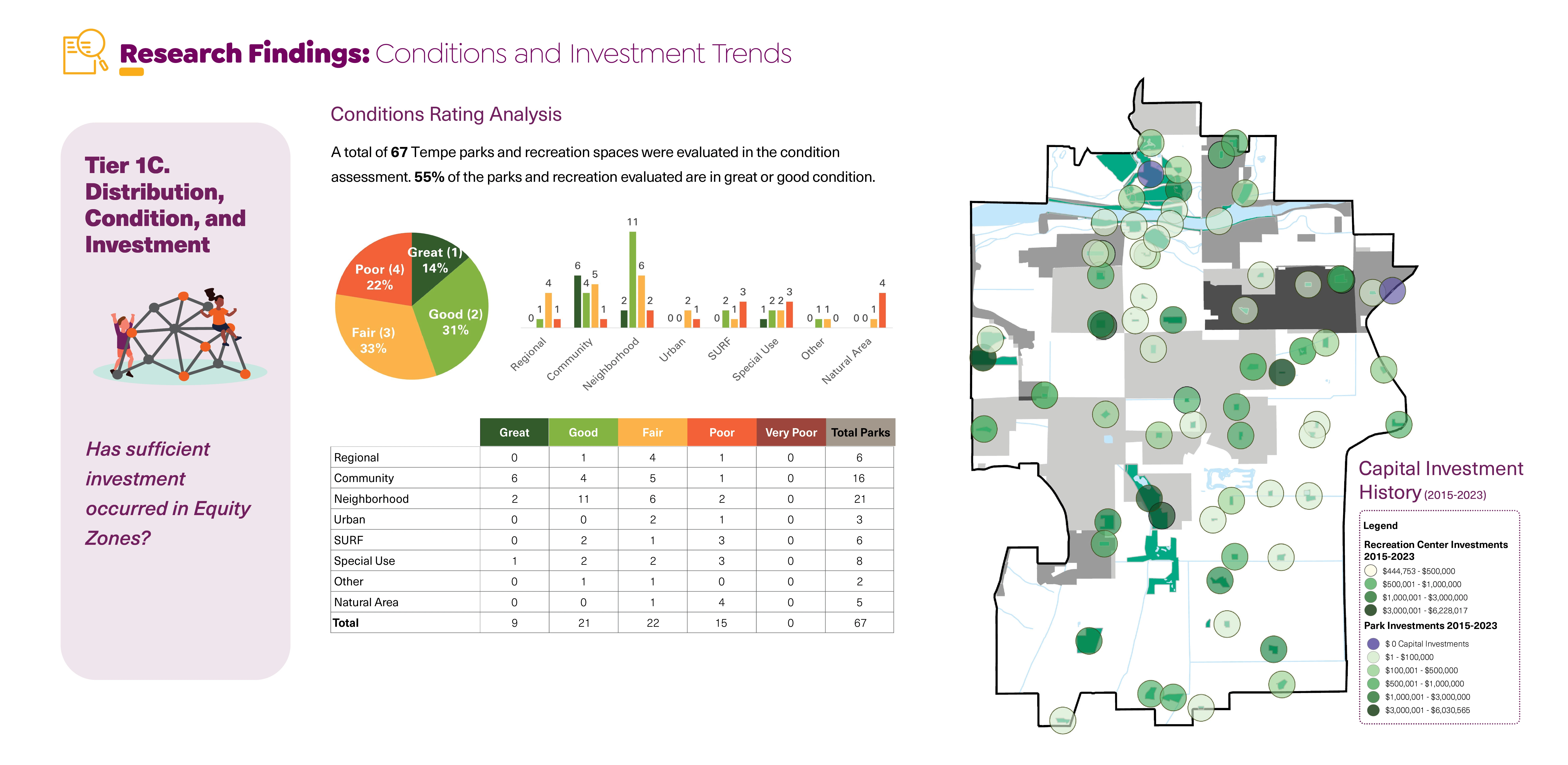 The inquiry phase included a review of Tempe’s existing planning and policy documents, a review of the city’s historic land planning practices, local factors effecting climate resilience, and a synthesized case study analysis comparing equity reports for peer communities and best practices. The second phase focused on generating an equity analysis framework (based on tier 1 data), highlighting systemic inequities around socioeconomic disparity and environmental impact data, and park distribution, condition, and investment trends. The third phase paired with findings from the second phase involved a robust community engagement campaign comprised of community navigator-led park assessments, park intercept surveys, neighborhood pop-up events, topical focus groups, and staff surveys (tier 2 data). This ultimately informed the fourth research phase that translated the rigorous analysis process into actionable next steps for the City to undertake in partnership with local stakeholders.