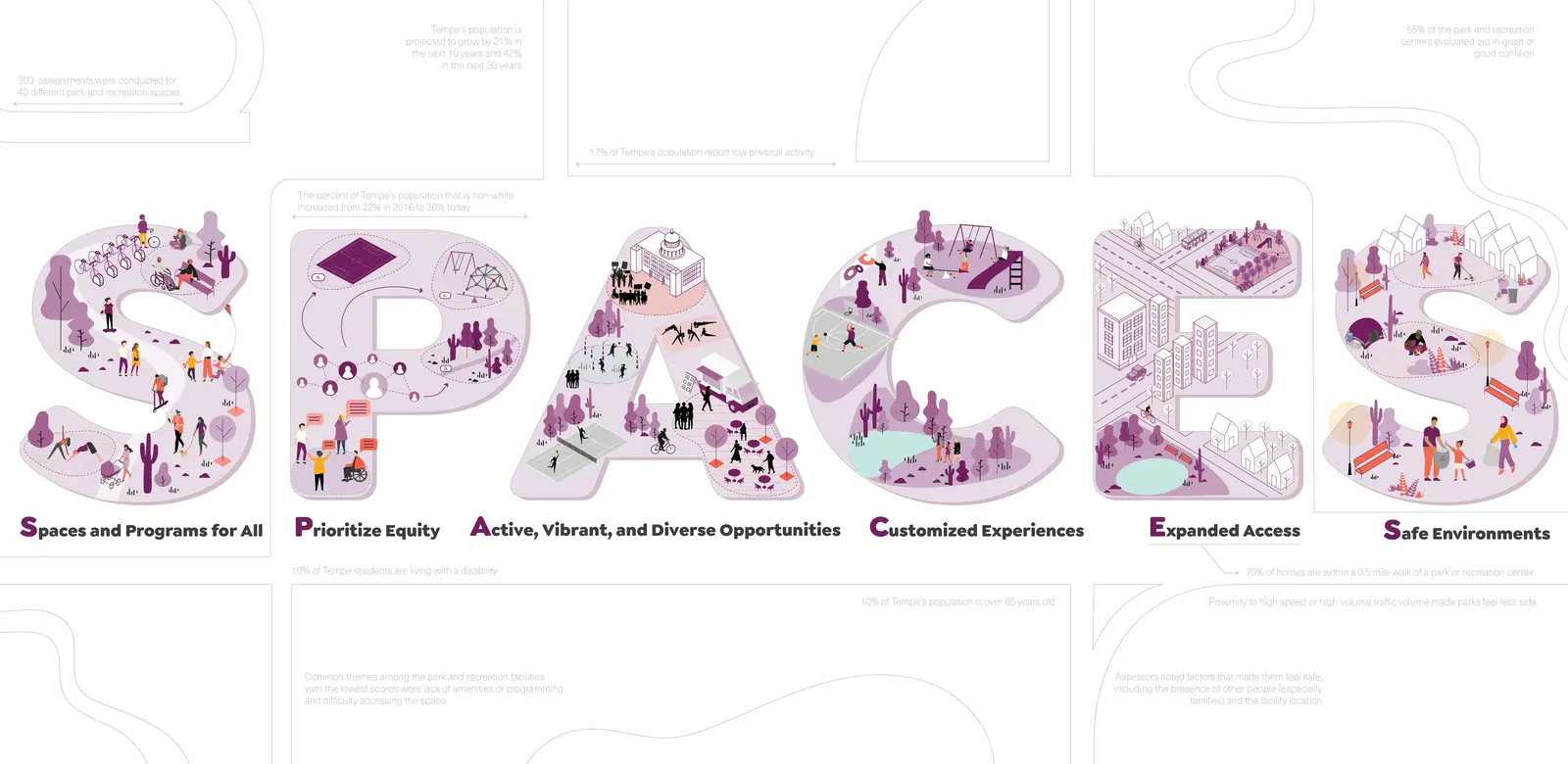 Understanding the history of exclusionary practices in rapidly developed and diverse cities like Tempe gives perspective on the current challenges faced when working toward DEI in public spaces. Traces of ethnic and economic exclusion remain visible in the city today and have influenced feelings of solitude and lack of belonging. The purpose of the S.P.A.C.E.S. equity study is to provide stakeholders with methods for identifying where inequities persist and supplement those findings with tools that guide action for a just future.