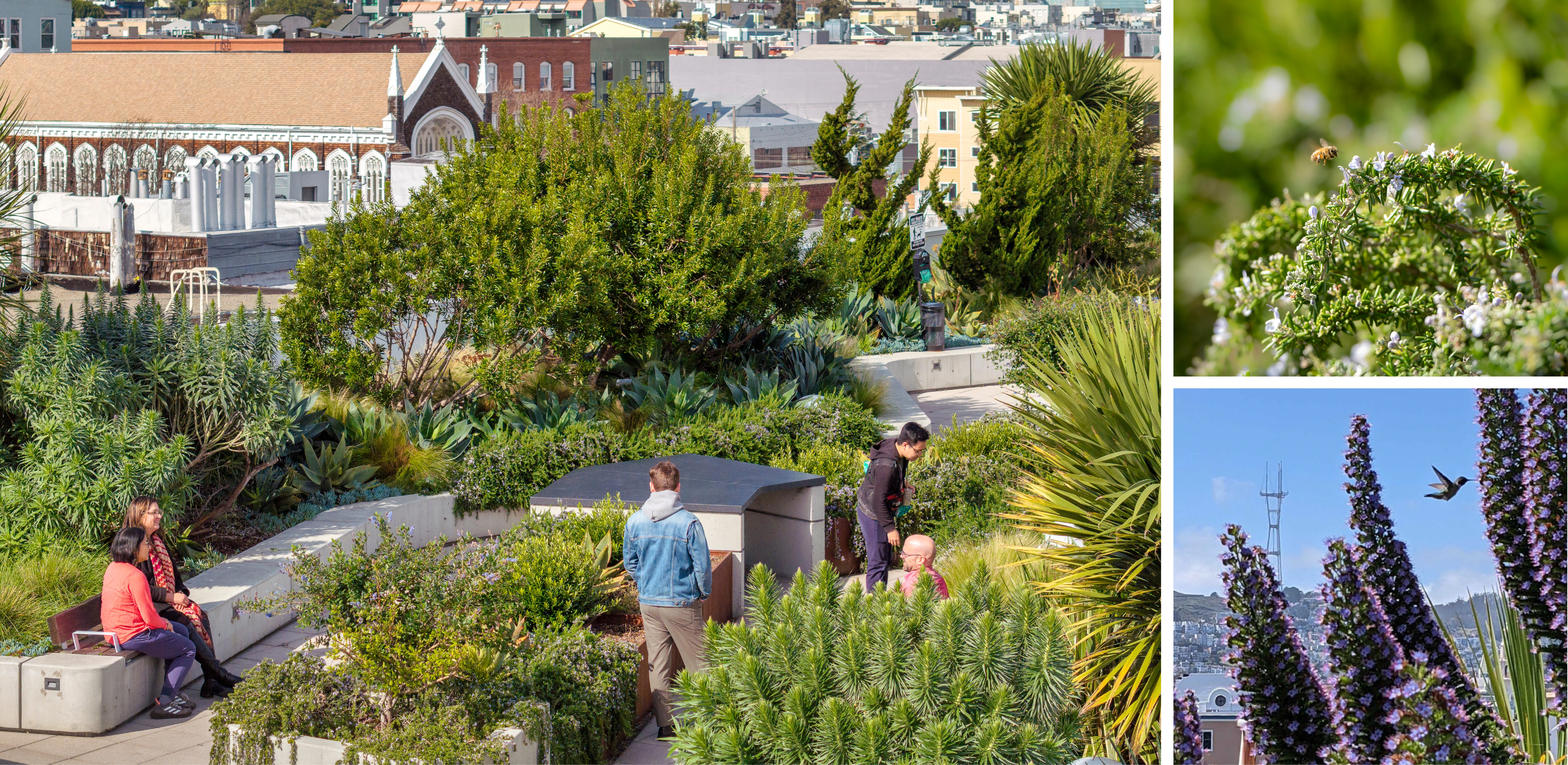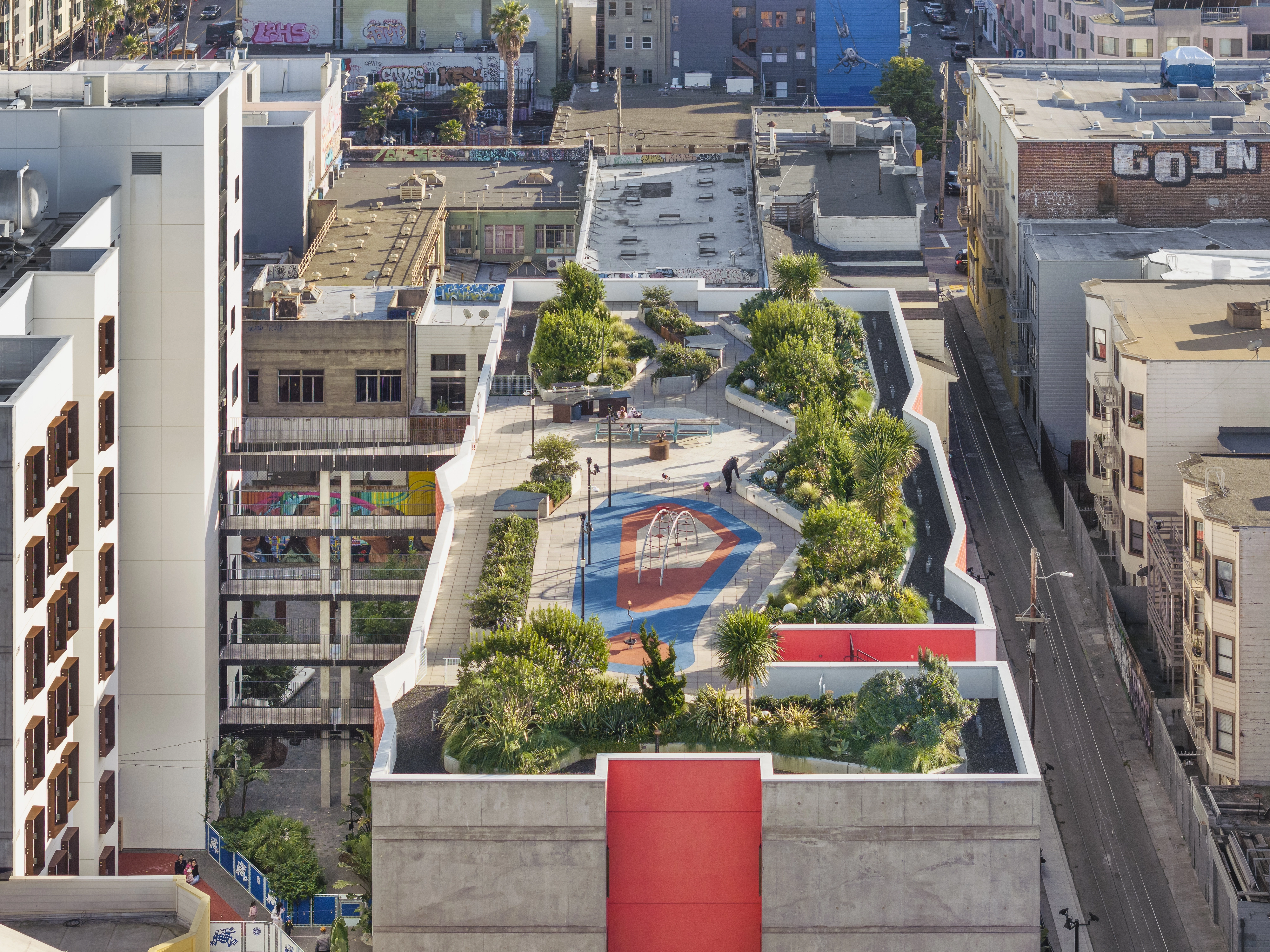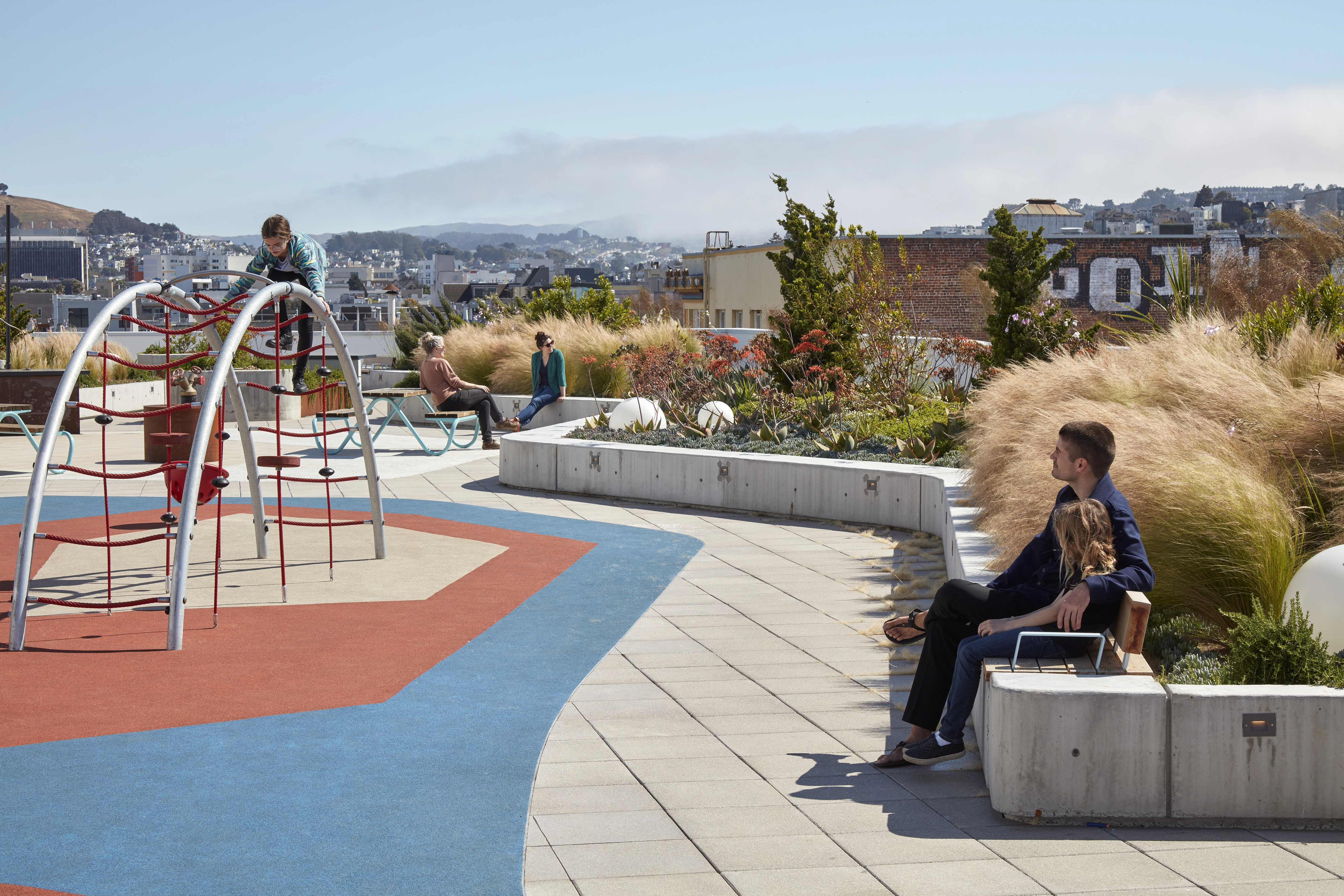 The Jardin de la Familias, or the family garden, is a roof terrace six floors above the hustle of the Mission. With panoramic views to Twin Peaks and Downtown, it creates a safe play space and a respite from the street. Native drought-tolerant and southwest plant species create a verdant subtropical garden and enhance urban biodiversity, with bees and hummingbirds regularly visiting the rooftop.