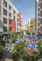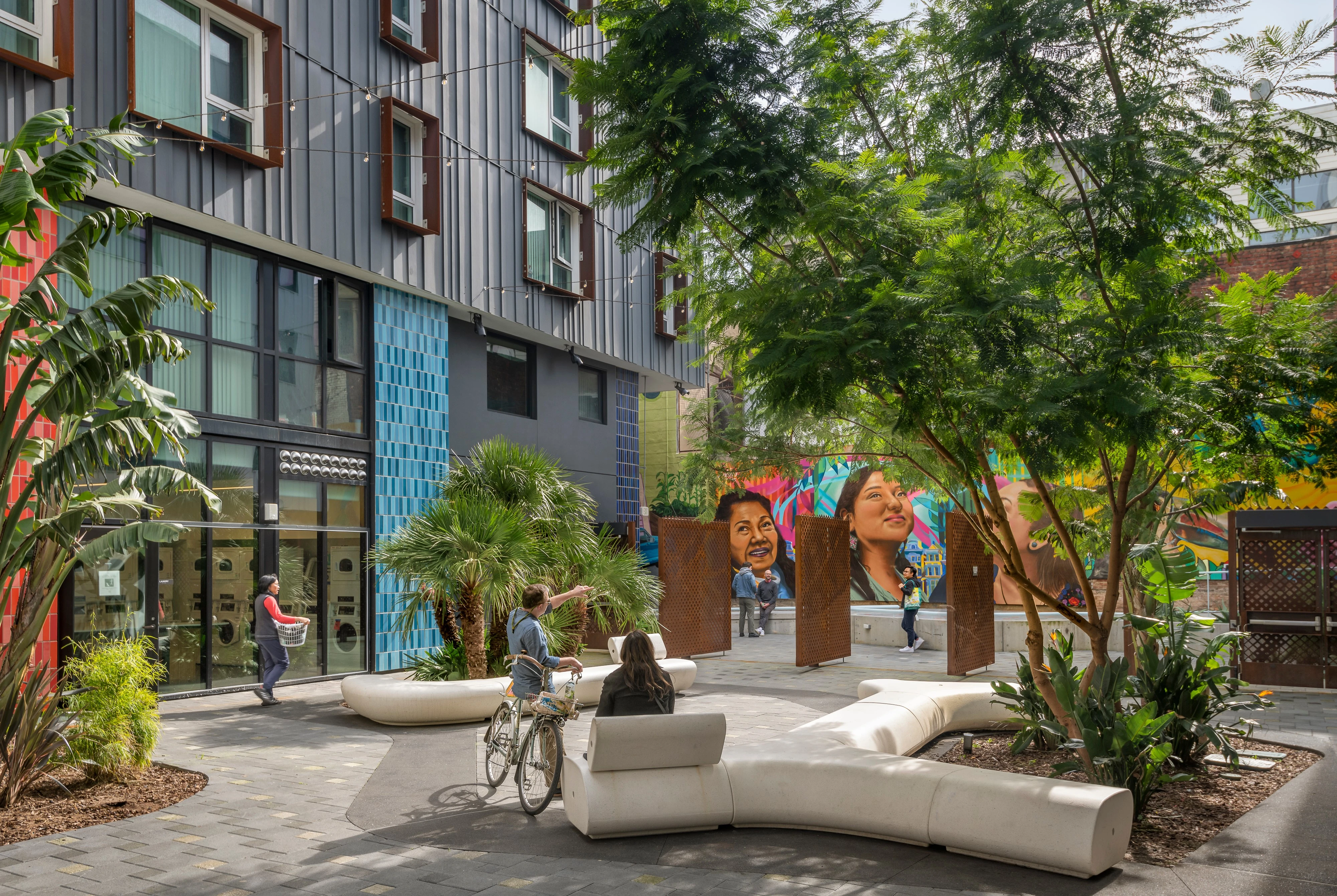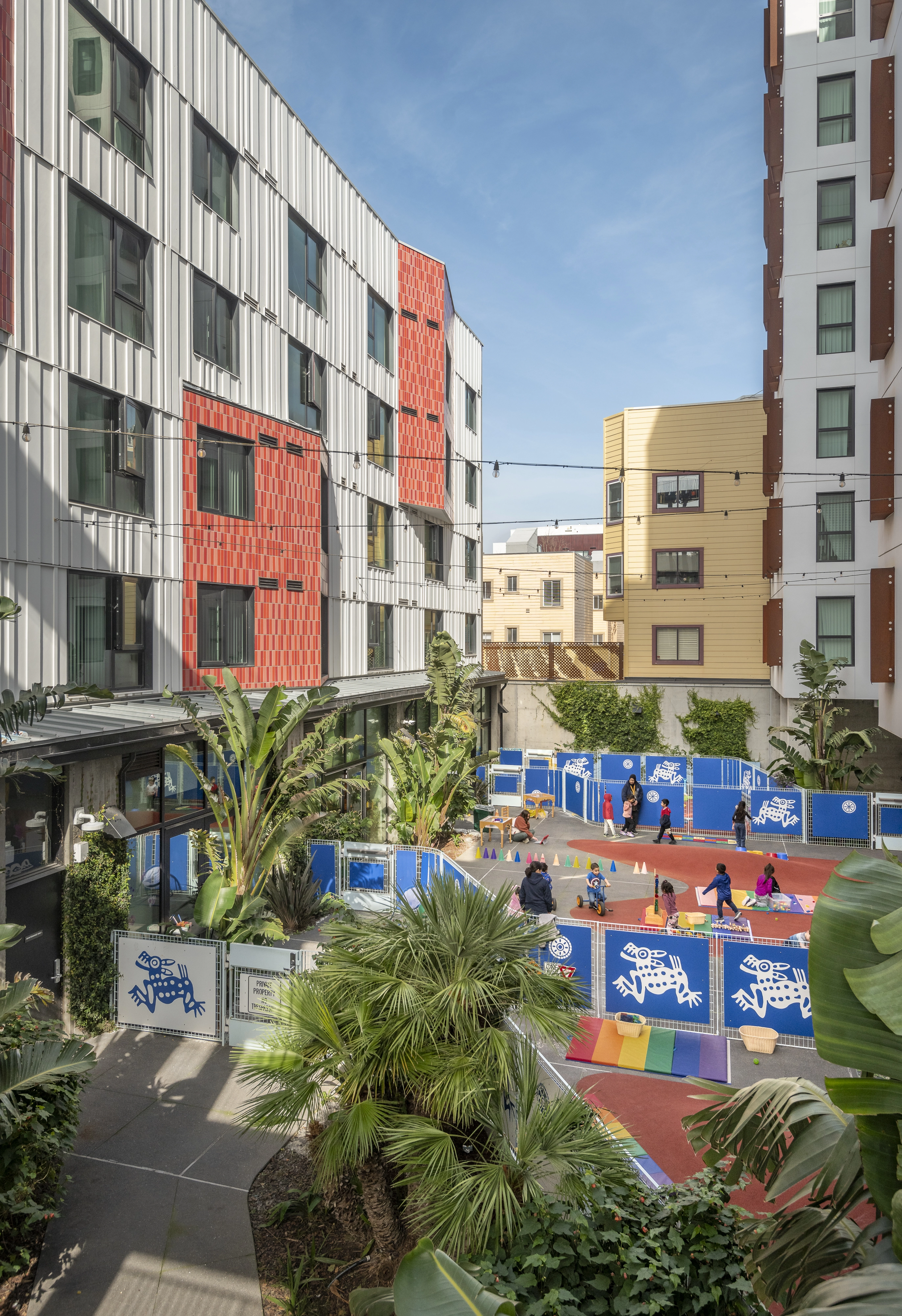 San Francisco’s Mission District has been an epicenter of gentrification for 25 years. La Fénix at 1950 provides 157 affordable homes for displaced and unhoused families in the Mission, as well as a home for nonprofit service providers. The ground level courtyard, or Zócalo, links amenities to encourage community building. The Paseo de Artistas opens to the street and is lined with murals, low-cost artist studios, and classrooms for free art education. At the Jardin de las Familias, a roof deck planted with natives and southwest plantings provides a play area with panoramic city views. A partnership of community nonprofits led the engagement process, allowing the design to be guided by long-term neighborhood constituents.
