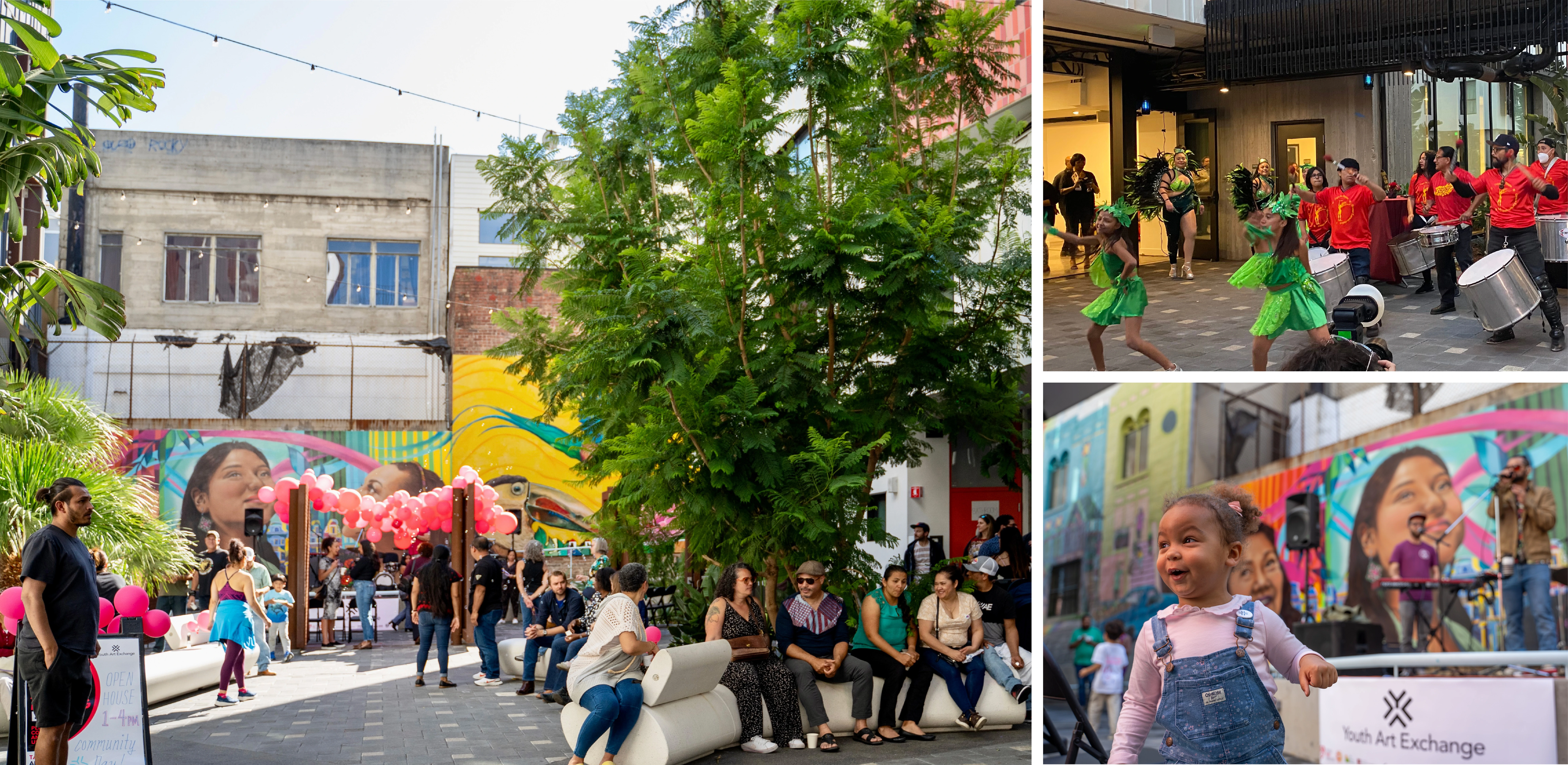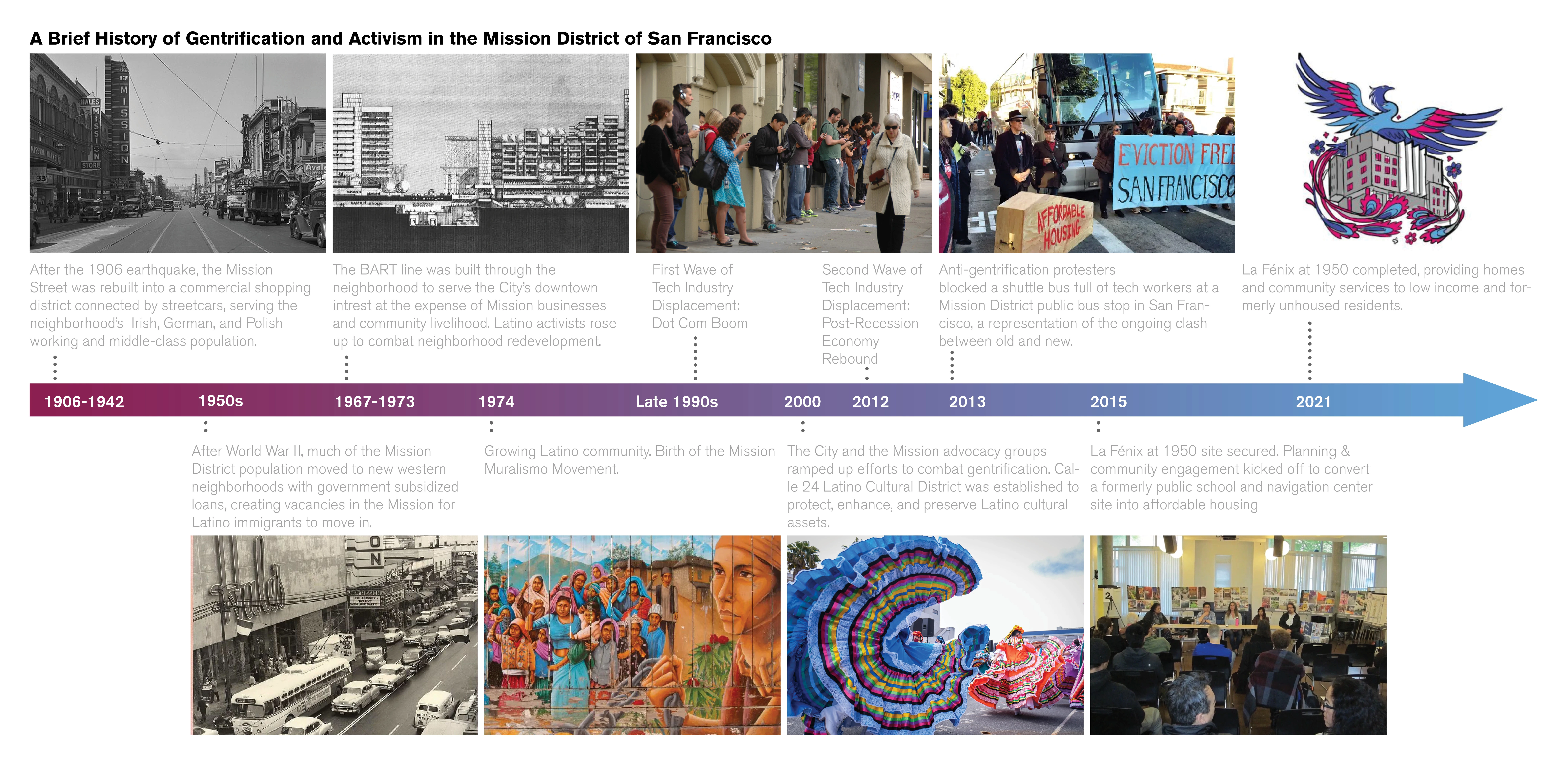 The Mission District has a diverse cultural history. Historically, it has been home to Irish, German, and Polish immigrants, and it served as a theater district during the 1920s and 1930s. Since the 1940s, it has housed the City’s highest concentration of Latin American immigrants. The dot-com boom of the late 1990s displaced 50% of Latino constituents. Alarmed by the lack of local voices in the planning process, neighborhood nonprofits formed the Mission Anti-Displacement Coalition (MAC) to engage neighbors in workshops to articulate their vision for their neighborhood. A direct result of this grassroots planning is La Fénix at 1950, a 100% affordable community with an active ground floor supporting artists and local services.