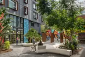 The Zócalo, or central courtyard, links shared amenities such as the community room, kitchen, laundry room, and youth media lab. It’s also an extended living room for residents to connect and socialize. It opens to the Paseo de Artistas, a new mid-block passage lined with low-cost artist studios and space for the Youth Art Exchange. The Paseo functions as an outdoor workshop and gallery featuring a three-story mural by local artists, and continues the network of plazas and alleyways that characterize the Mission District. The connected Zócalo and Paseo de Artistas host social events, performance art classes, and festivals.