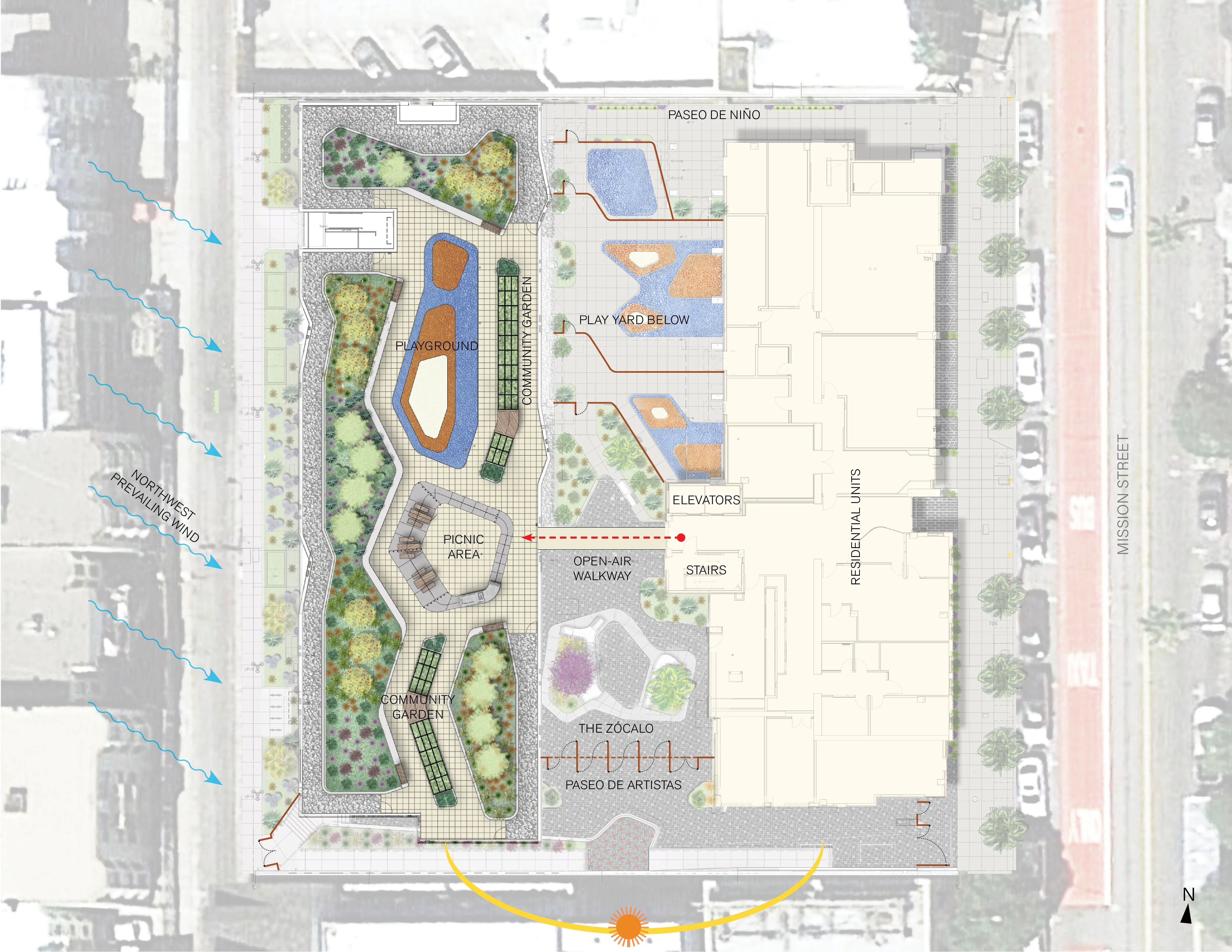 North of the Zócalo is the outdoor play area for the Mission Neighborhood Center’s Early Childhood Education Center (ECE), accessed through the Paseo de Niño. Subtropical plantings reminiscent of Latin American landscapes fill the courtyard, and the fence is adorned with symbols inspired by mesoamerican hieroglyphs.