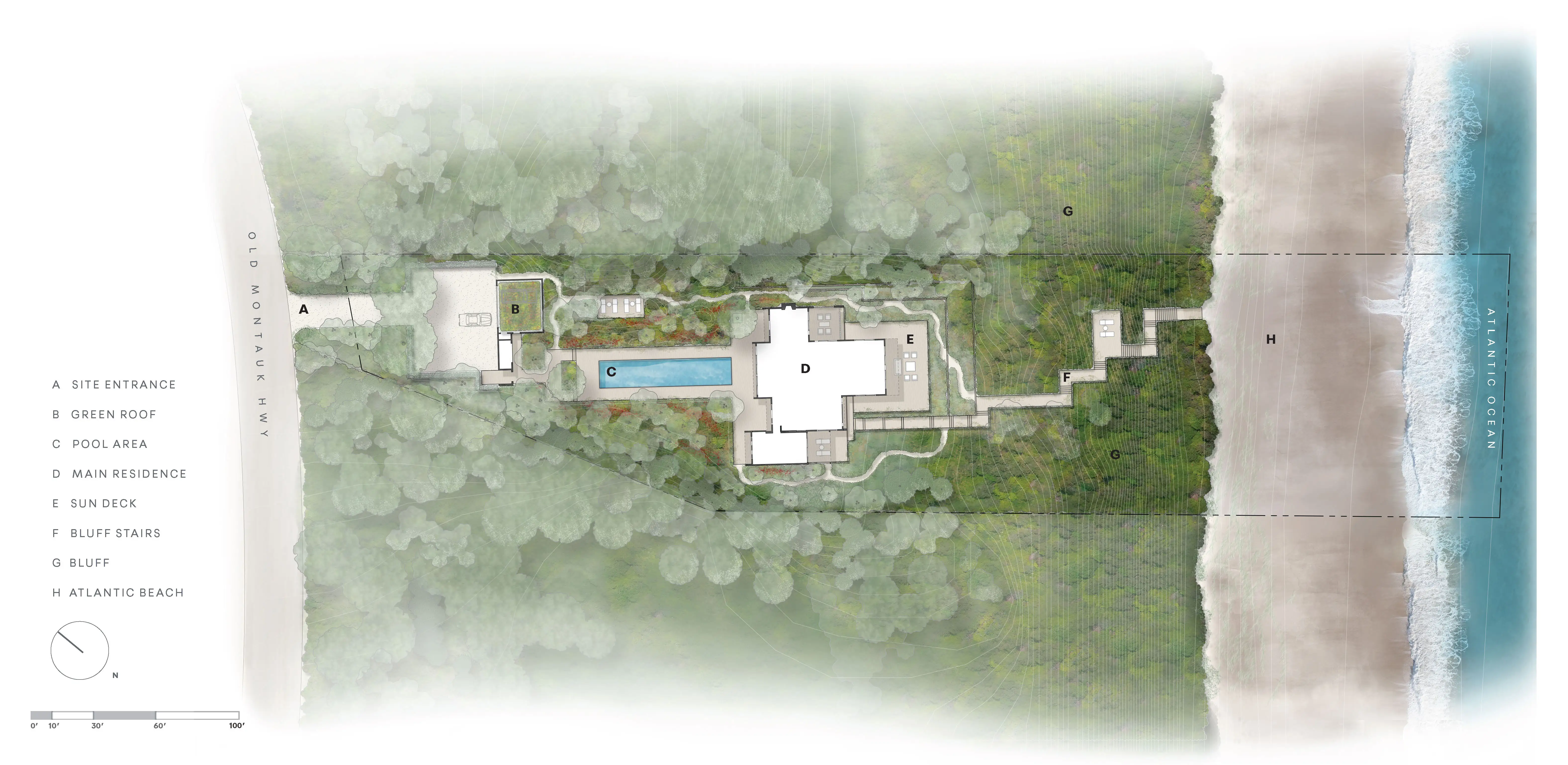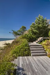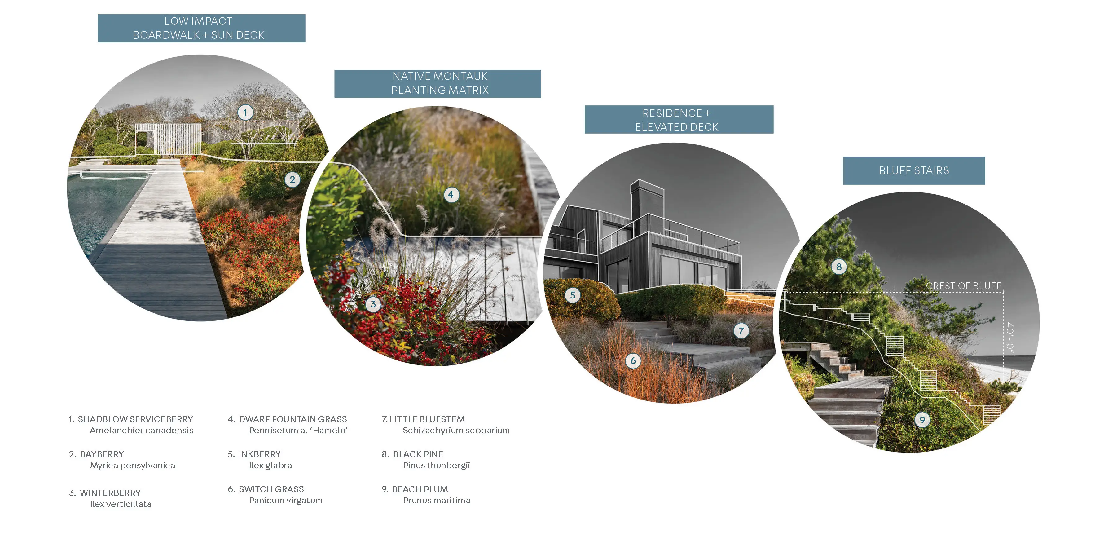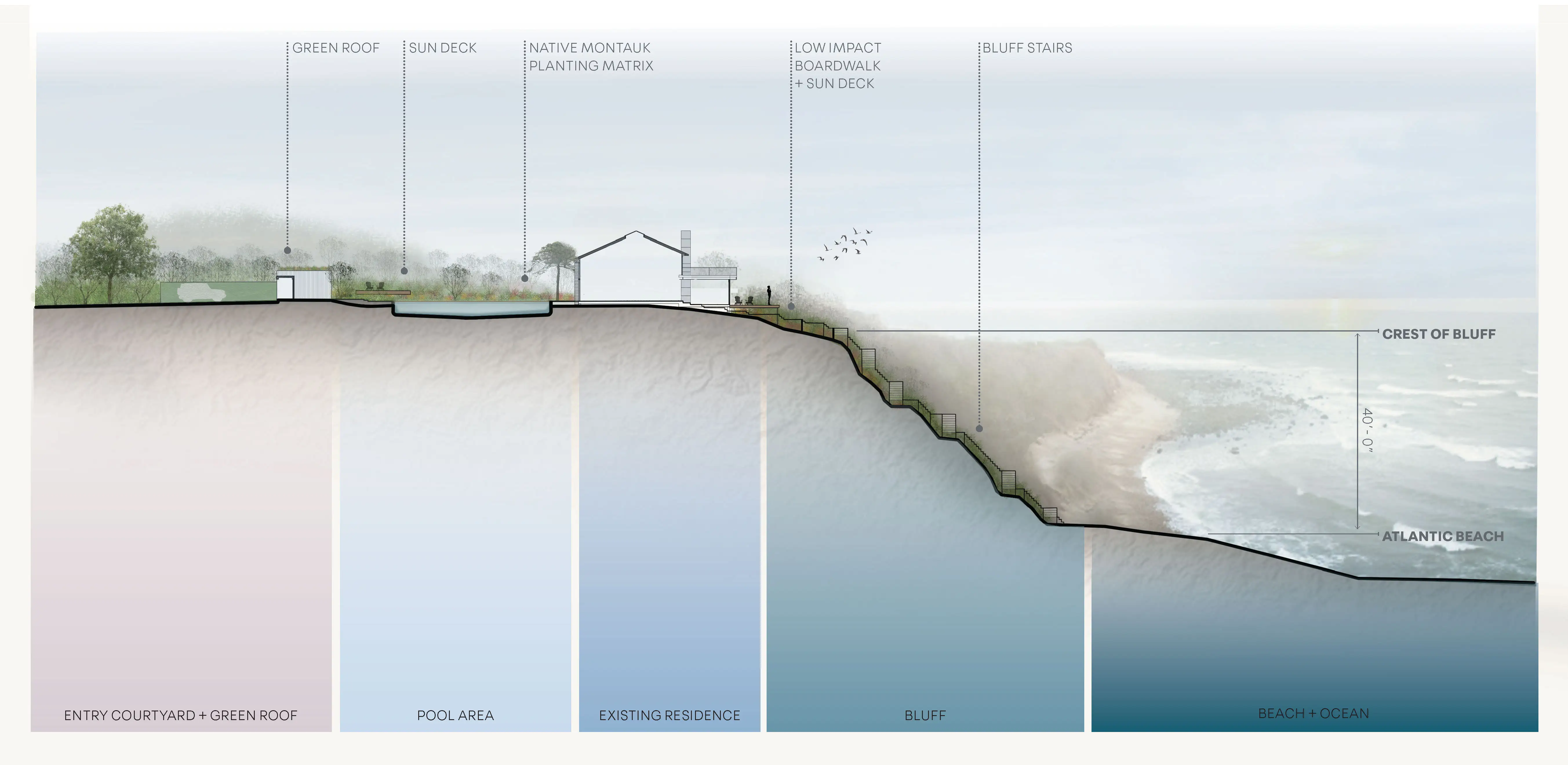 Sensitive interventions such as elevated walkways and the use of native vegetation, provide amenities to the site while preserving the bluff. The use of plants native to the Montauk bluffs, stitch the site into the larger ecological context of the East End.