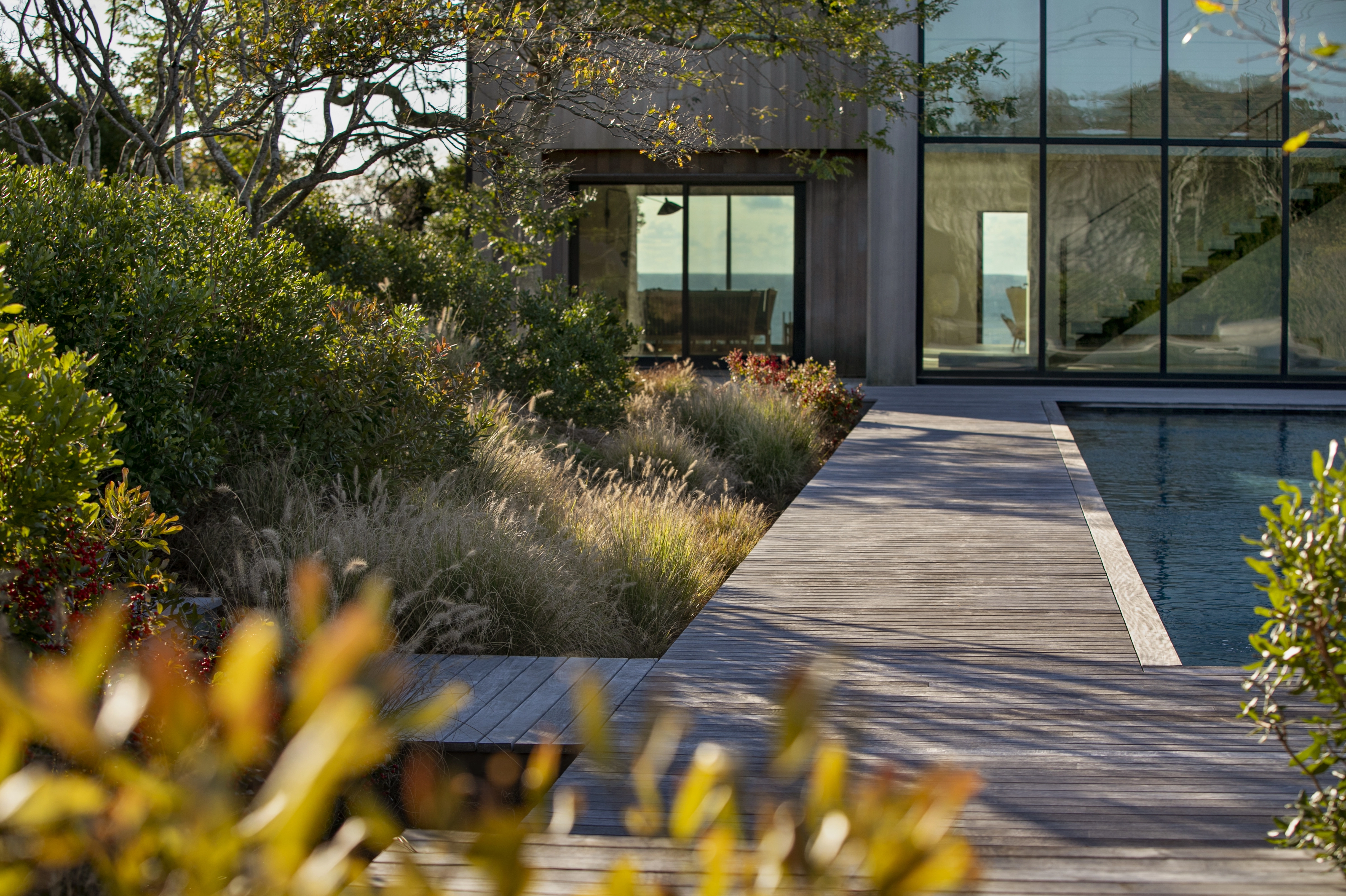 The house renovation included a facade of glass overlooking the swimming pool, which was designed with sculptural intent to reflect its lush native surroundings. A planting palette of Shad trees, Bayberry, Winter Berry, Inkberry, and massing’s of Switch Grass, Little Bluestem and Dwarf Fountain Grasses were used to enhance and stabilize the bluff. These all work together to additionally provide not only a pleasing aesthetic, but also offers habitat and forage for the migrating bird population.