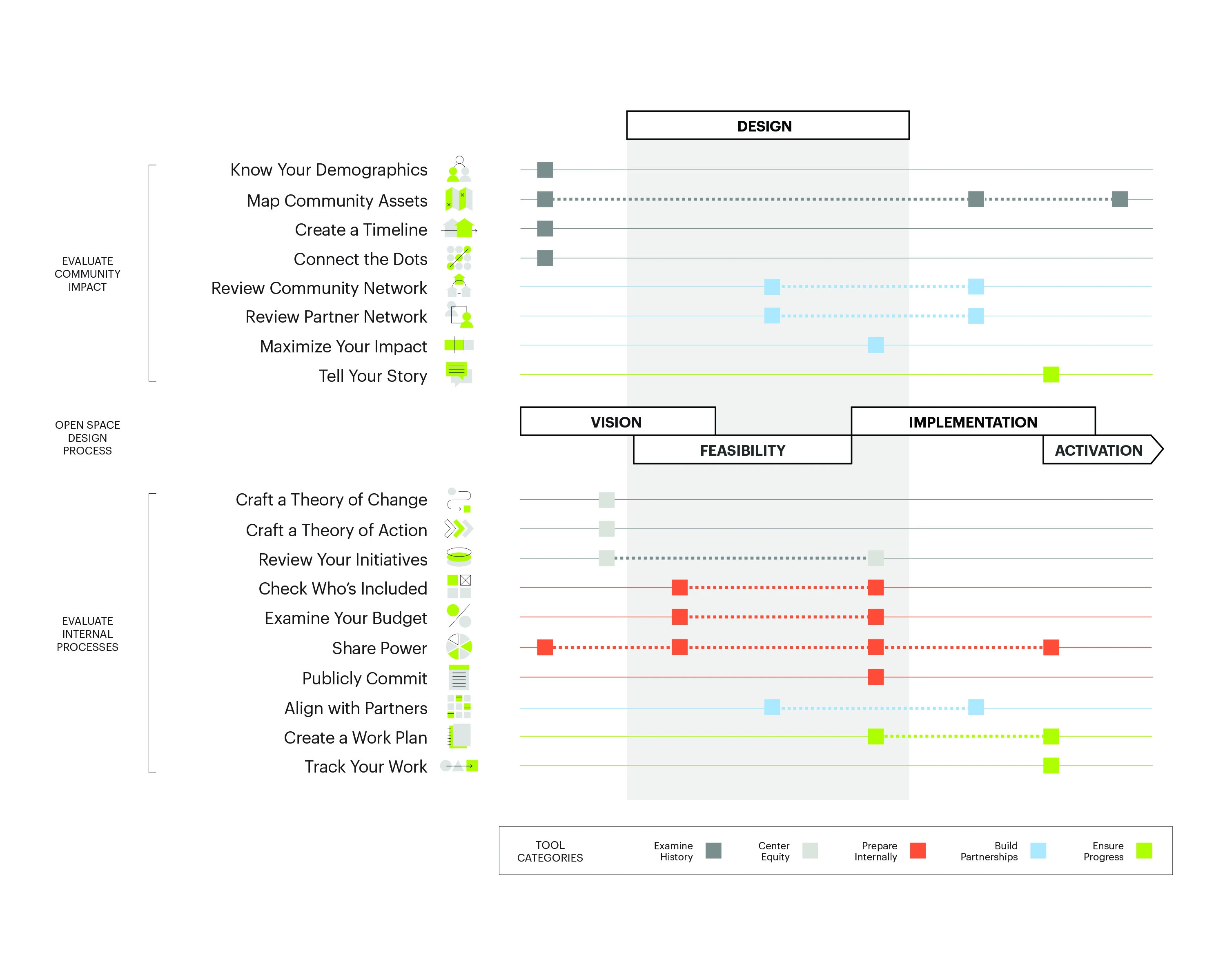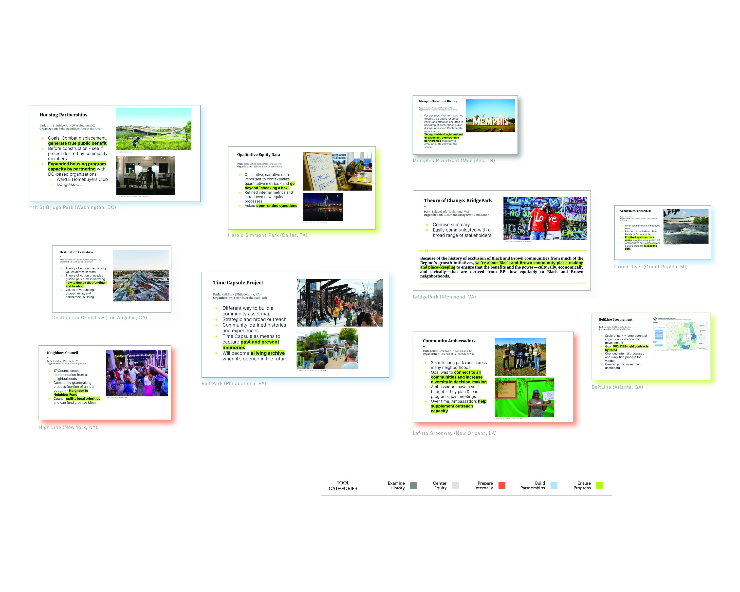 The tools are broken into 5 sections - Examine History, Center Equity, Prepare Internally, Build Partnerships, Ensure Progress - covering both internal practices and public-facing programs. As a result, the impacts have been broad-ranging. Different projects have applied the tools to fit their specific needs: in Dallas, the Trinity Park Conservancy created park-based equity metrics for budgeting and programming; Philadelphia’s Rail Park developed an archive of community histories representing the 10+ surrounding neighborhoods; the Richmond BridgePark comprehensively restructured internal priorities and external programs to support place-keeping efforts by Black and Brown communities.