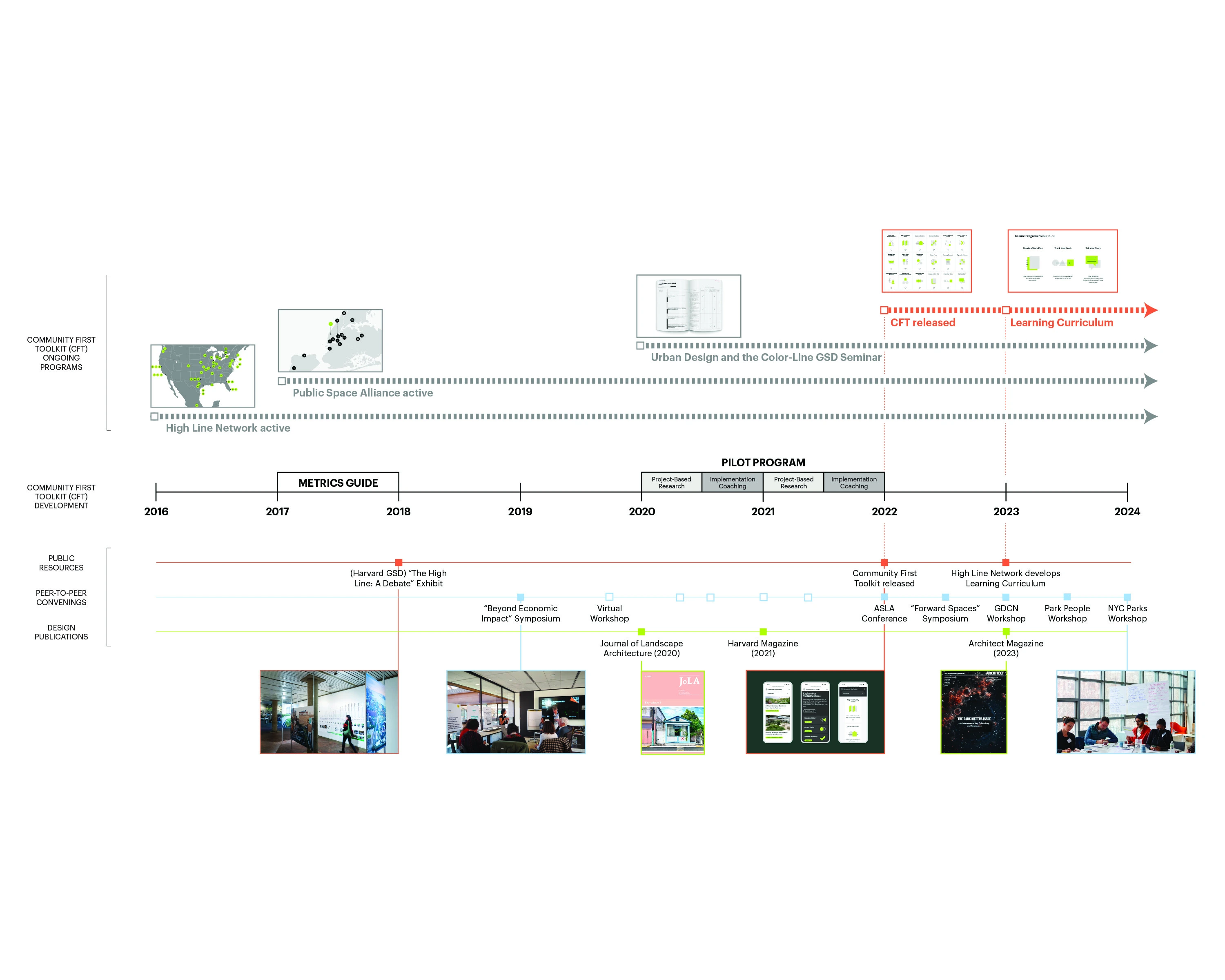 Landscapes sit at the intersection of some of today’s most critical issues: 1) uneven access to quality public spaces, often along lines of race, class, and ethnicity; 2) underutilized, disconnected, or abandoned infrastructures from shifting industries and investment patterns; and 3) ever-increasing needs for spaces that support environmental resilience and social connection. The Community First Toolkit (CFT) was developed for the High Line Network, a program of Friends of the High Line that convenes equity-focused landscape organizations. The New York High Line is widely regarded as both an icon of landscape design and a symbol of “green gentrification.” Building on lessons learned, the CFT’s core message is that parks and public spaces are not incidental to broader issues of equity and access - they can be drivers of equitable community development. The Toolkit breaks down why, for whom, and how public realm projects can mitigate the negative impacts of past developments while ensuring positive outcomes for as many people as possible, particularly for those previously harmed.