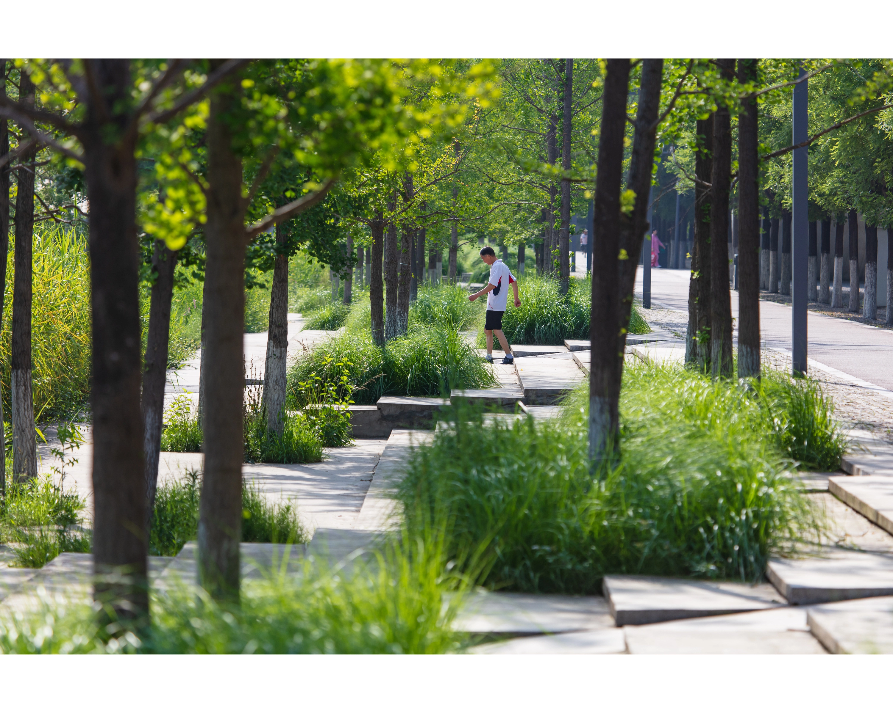 (4) Path Network: An intricate path network, raised above ground and weaving through tall grass, offers a nature-immersive experience. The paths, made of prefabricated concrete slates, are designed for efficient installation and aesthetic variation.