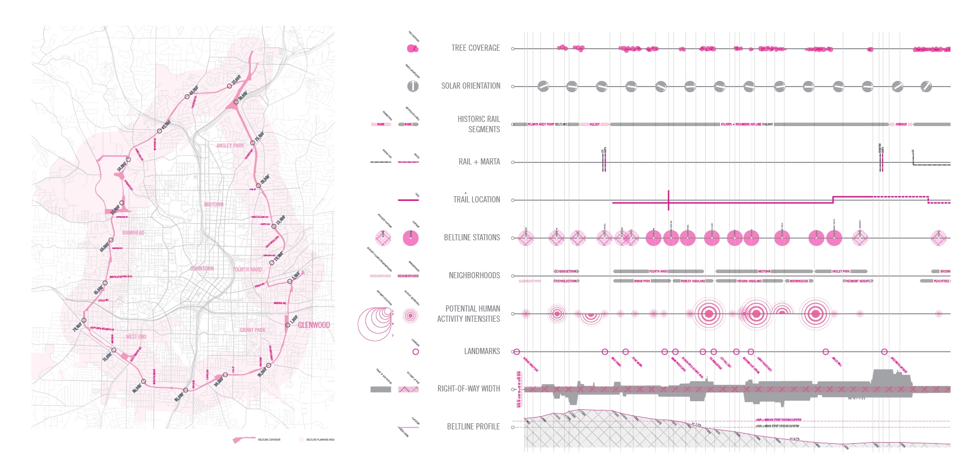 The corridor comprises the tracks of several linked 19th-century railroad lines, encircling the city center. Originally intended to enable the railroads to bypass the city center, the integrated system of rail lines has found a second life by connecting intown neighborhoods to each other and restoring unity and cohesion to the urban fabric.