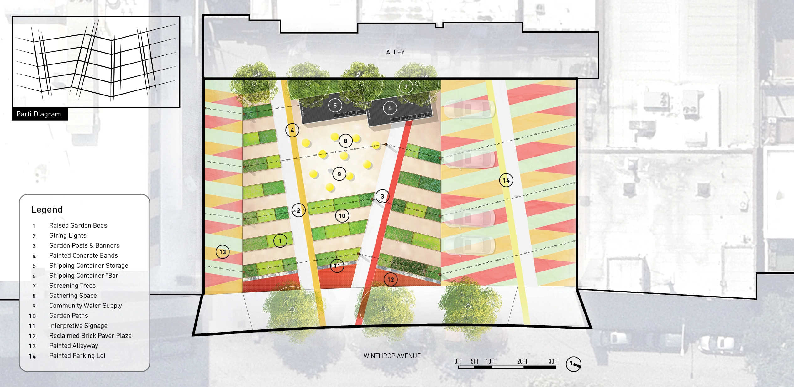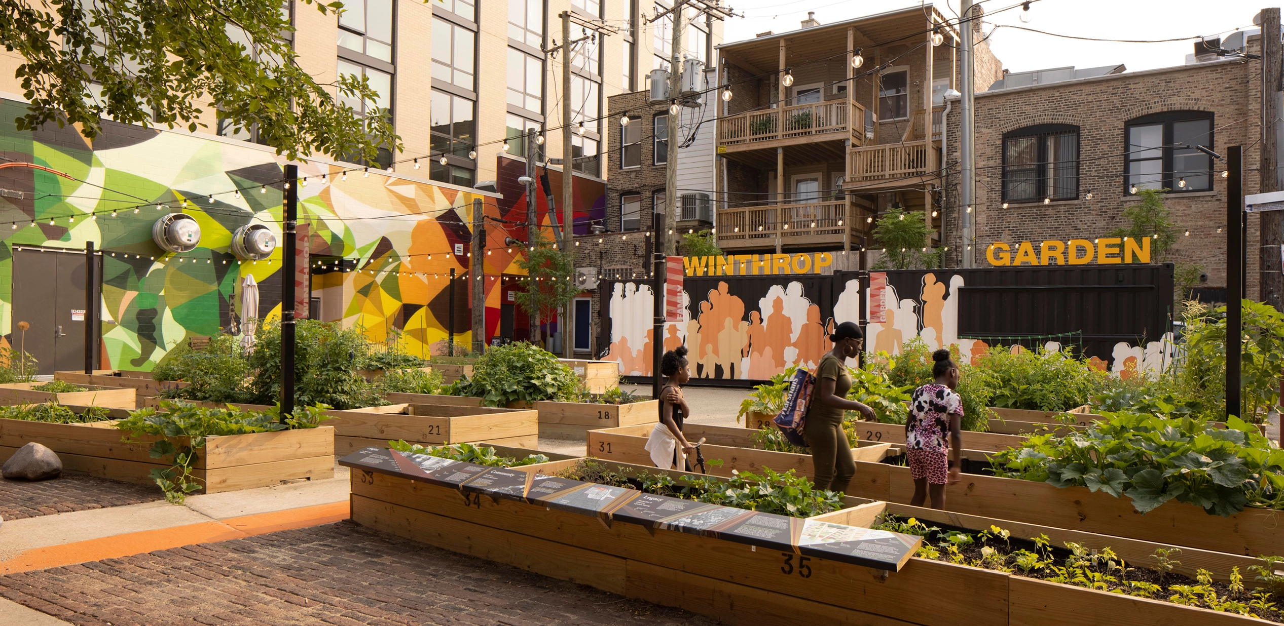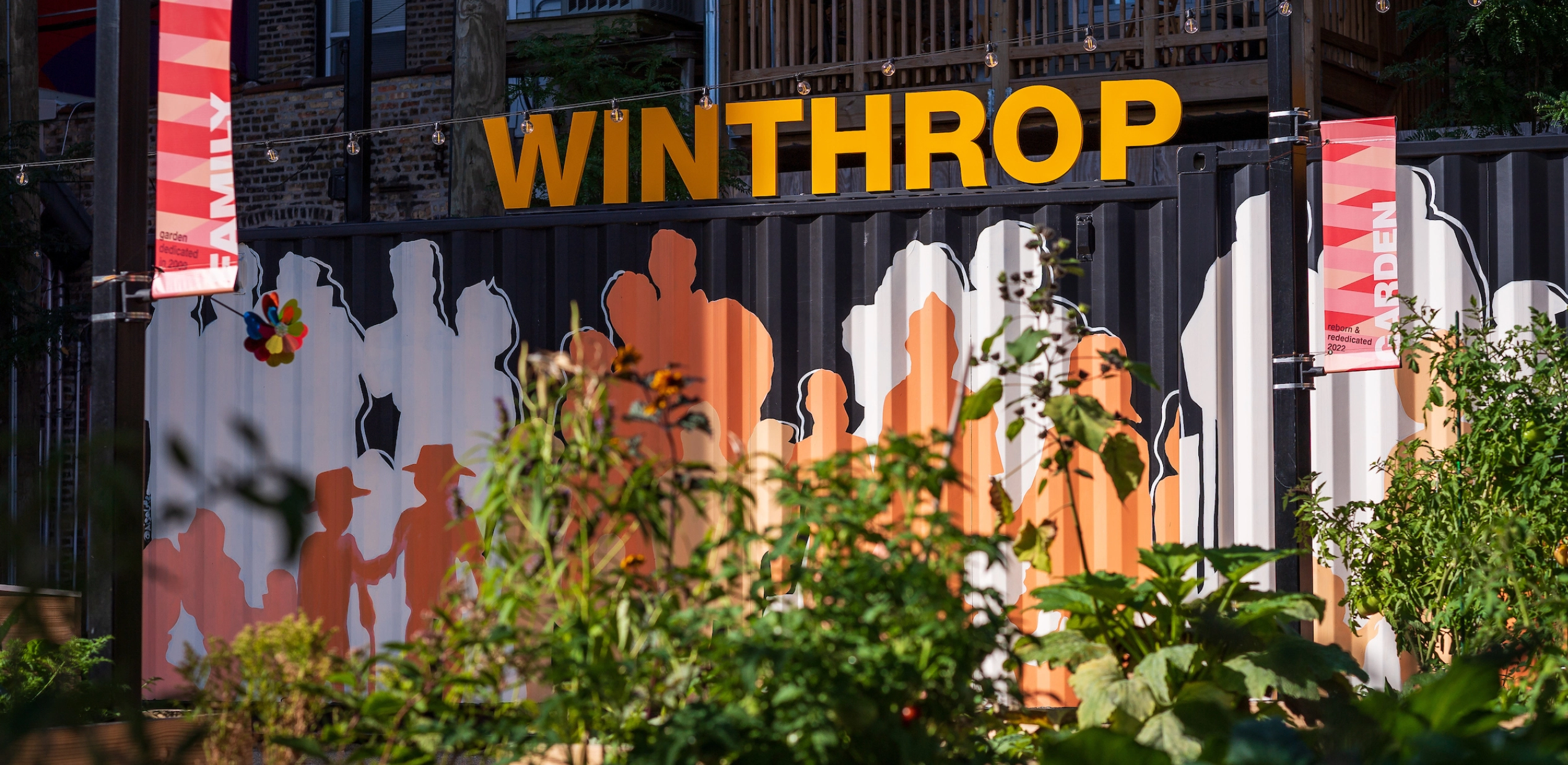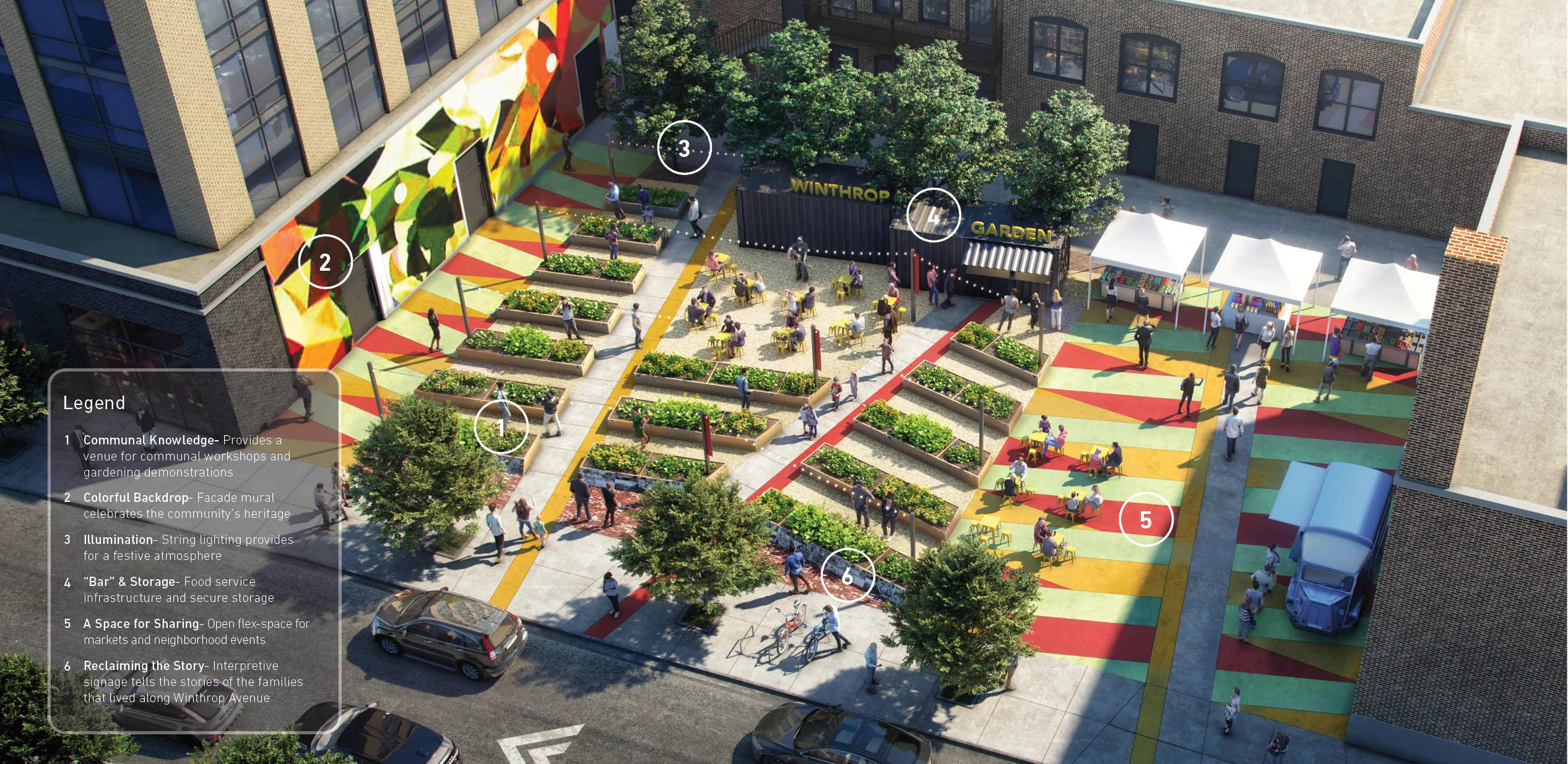Neighborhood desires for local food production and communal space following the pandemic in 2022 prompted the need to reinvest in this once beloved space. The development of a new design for the renovated garden held fresh opportunities to share the untold story of the Winthrop families while visually representing the community through the design; as individual threads, woven together, forming a rich tapestry rooted in the neighborhood through its past heritage and rich cultural diversity. Vibrant colors and patterns on the site are inspired by the featured facade mural by local artist, Mauricio Ramirez entitled, "Uptown in Bloom". Community garden plots shape the space and provide opportunities for local food cultivation in addition to featuring a central gathering space for community programming and activities.