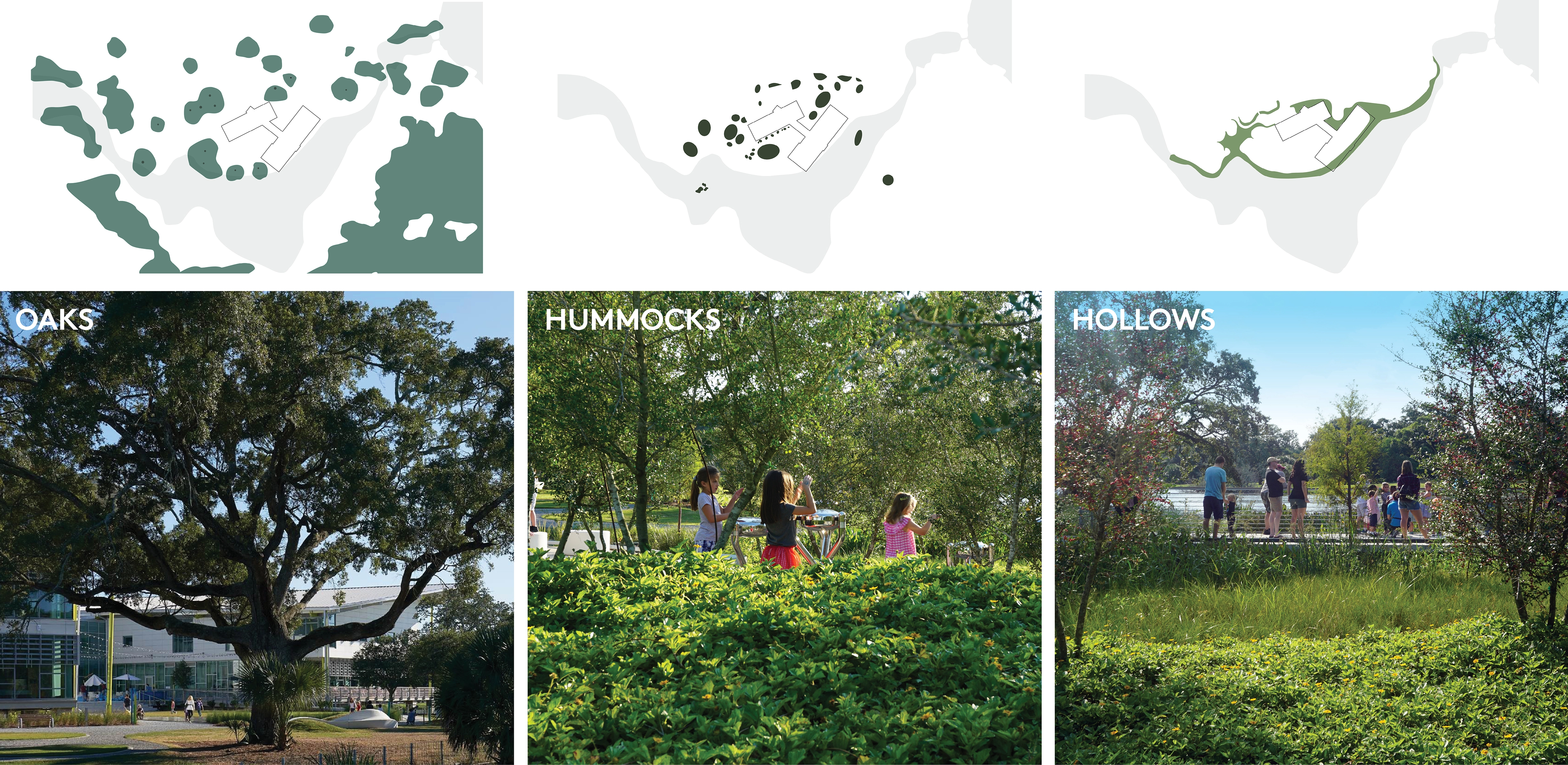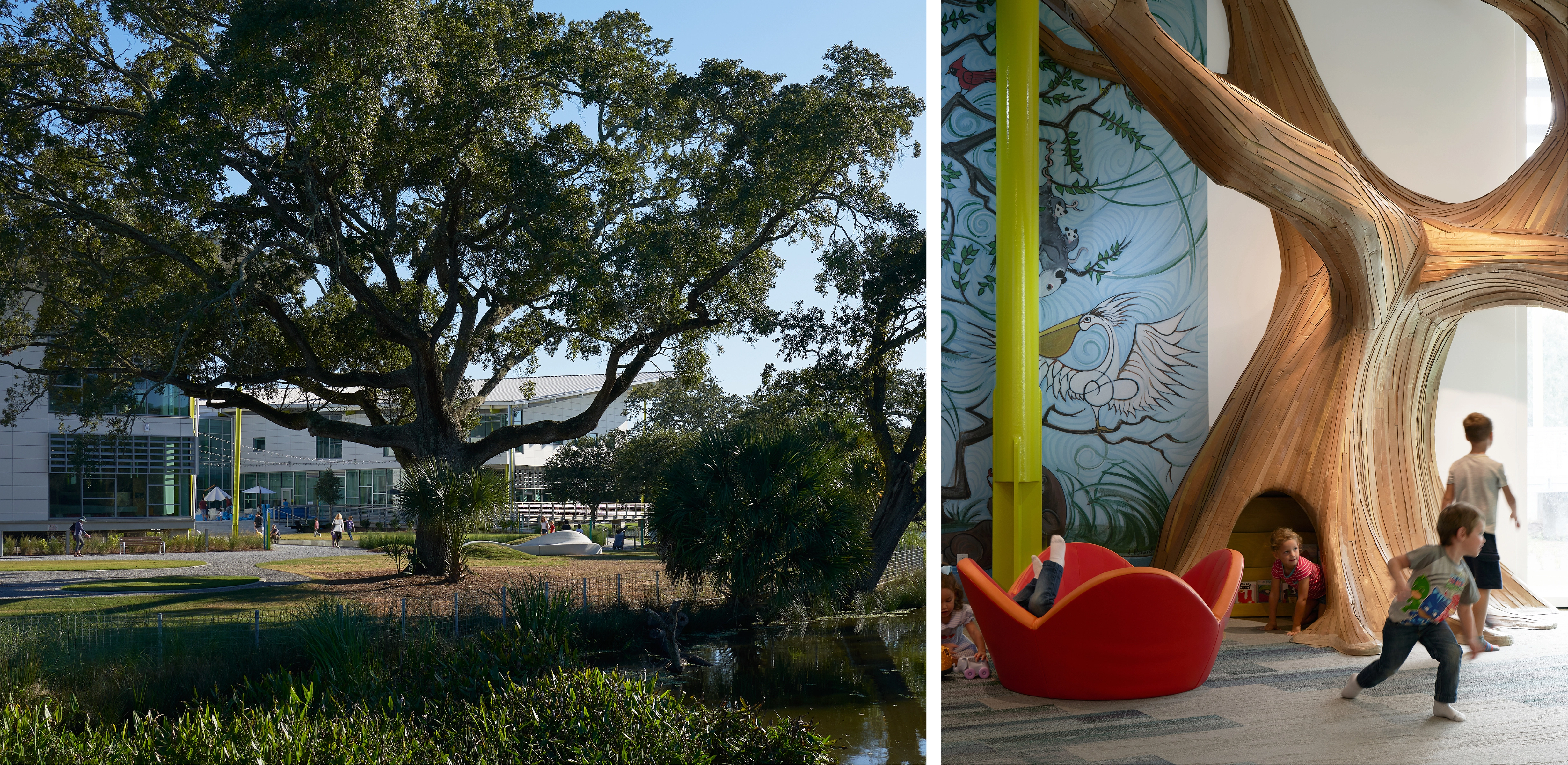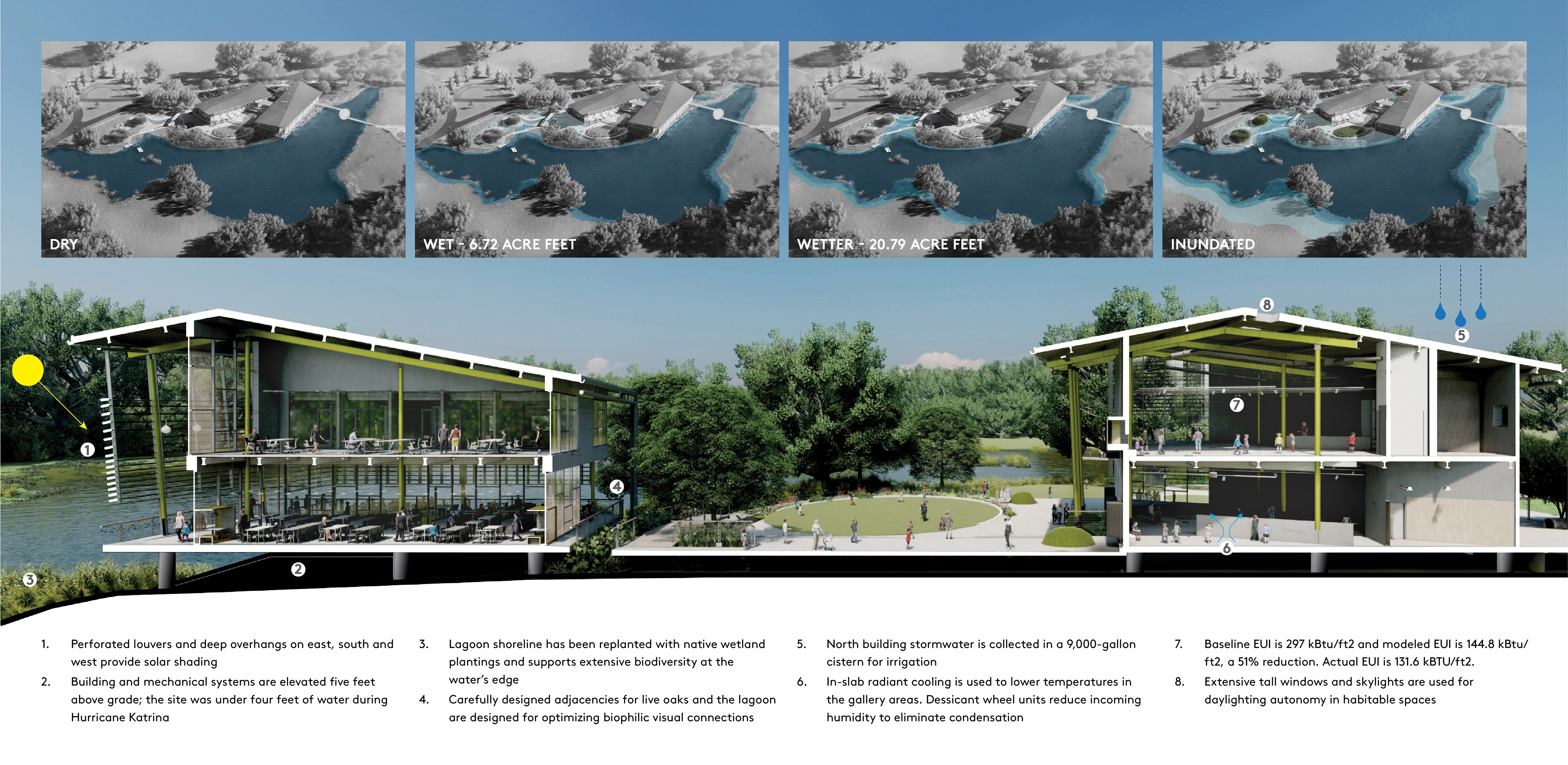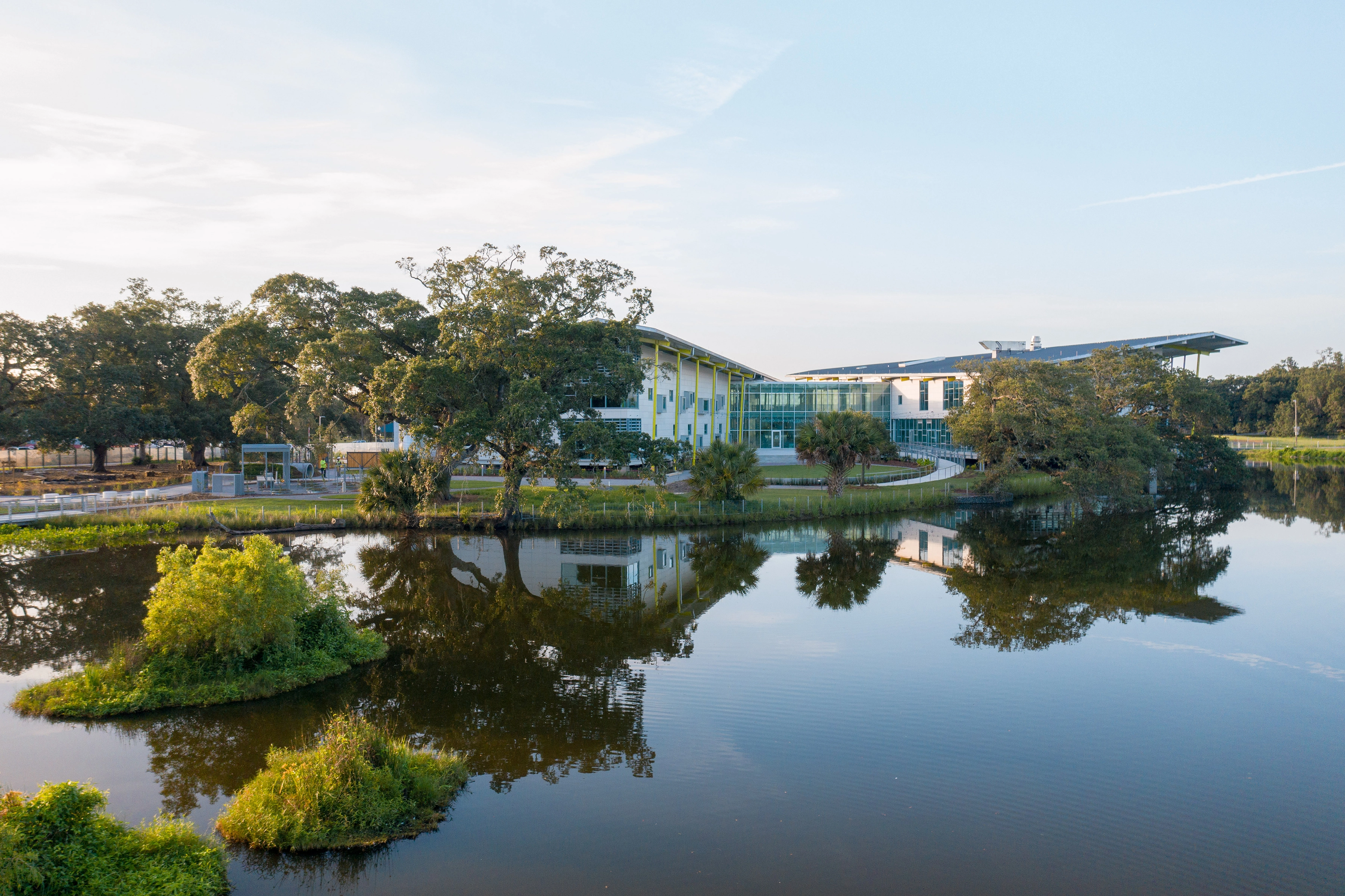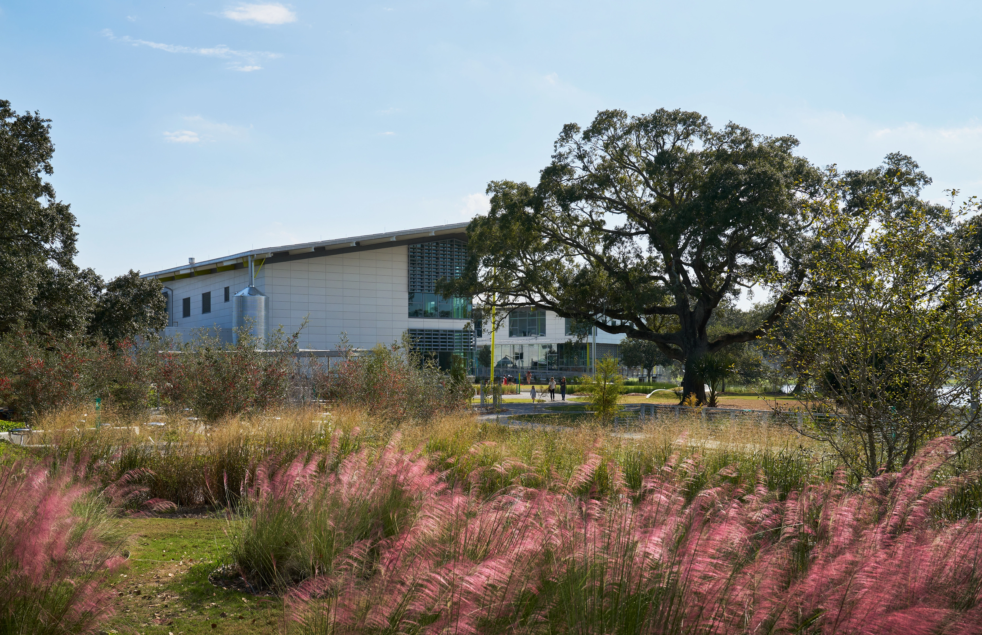 The building and site were designed to accommodate periodic flooding, and mitigate the hot, humid climate. The integrated design optimizes the shade of mature live oak trees, the world’s largest grove of live oaks, and the flow of a freshwater lagoon as a local stormwater receiving area that relieves flooding in downtown neighborhoods. The choreography of the visitor experience connects families with these nature-based systems—moving through groves of live oaks, across water, through immersive exhibits and into a courtyard and sensory gardens.