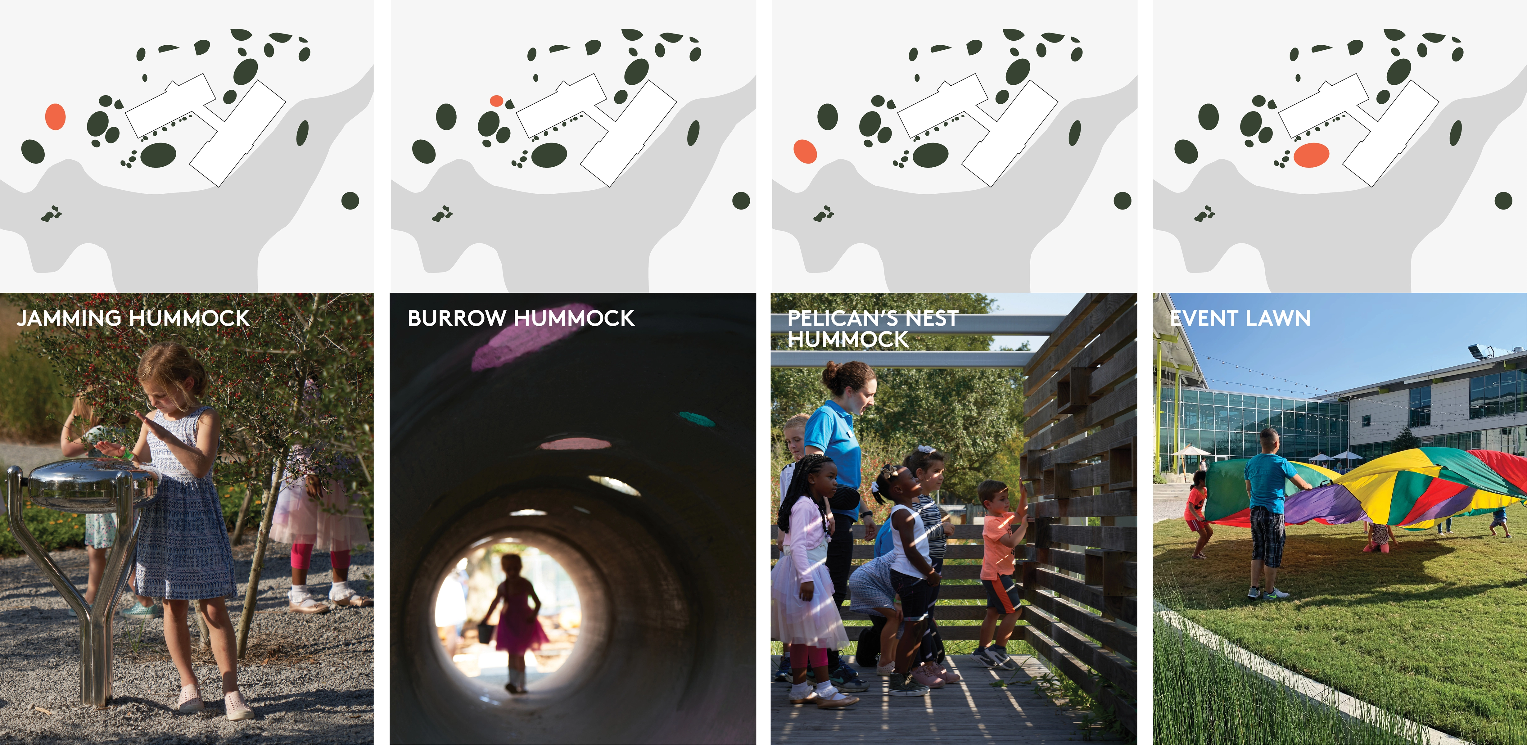 The magic of child-centered play is reinforced with a simple expression of the local landscape—the oaks, the hummocks and the hollows. In the delta landscape, a six-inch topographic change enables a wholly different ecosystem. These slight variations in topography and dramatic ecosystem change are the backbone of the design concept. The hummocks and hollows concept unfolds in multiple ways across multiple scales—as small, medium, and large program and outdoor exhibit areas create varied play experiences and build healthy habitat. The International Living Future Institute recognized the project with the 2021 Stephen R. Kellert Biophilic Design Award.