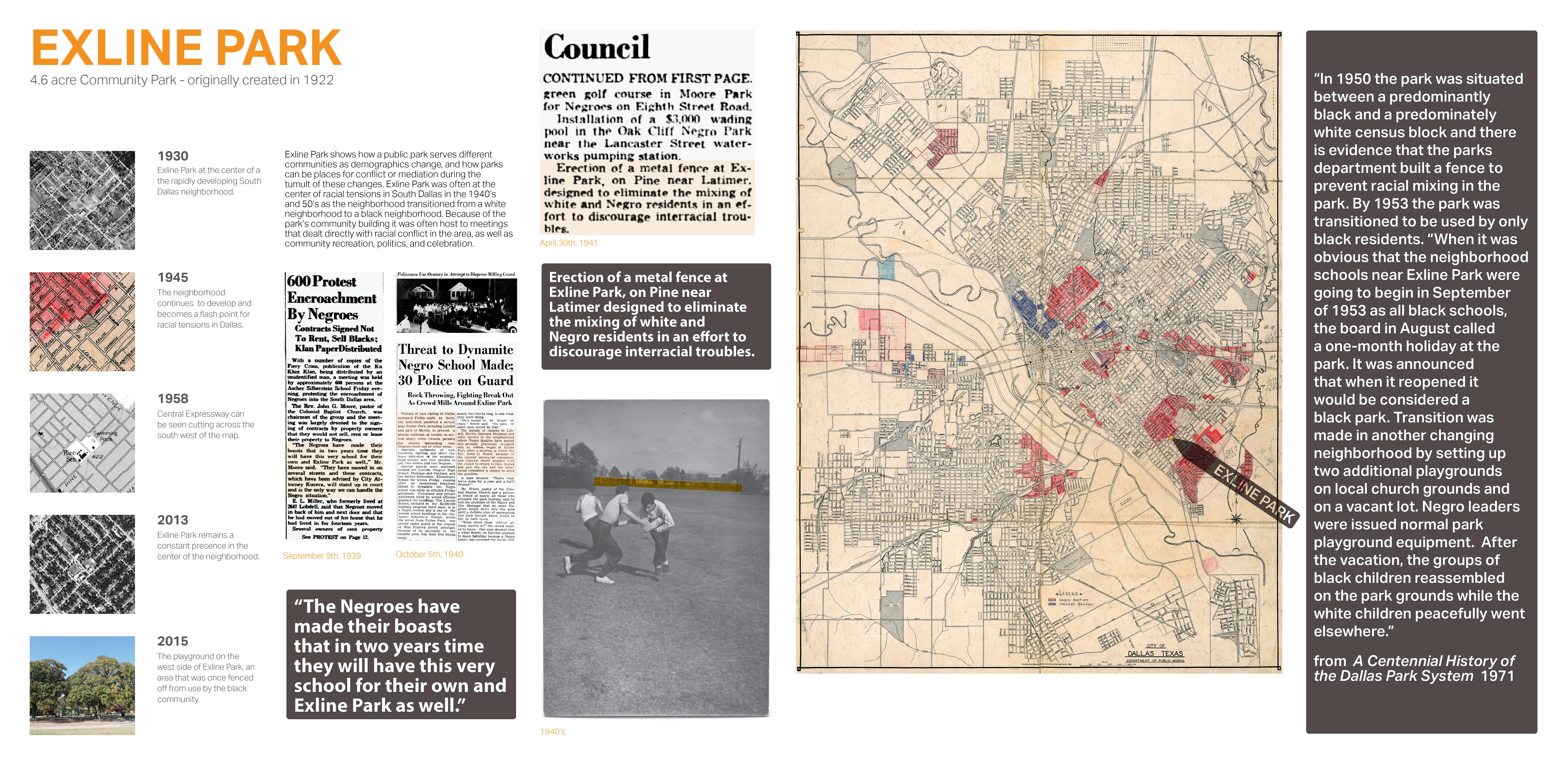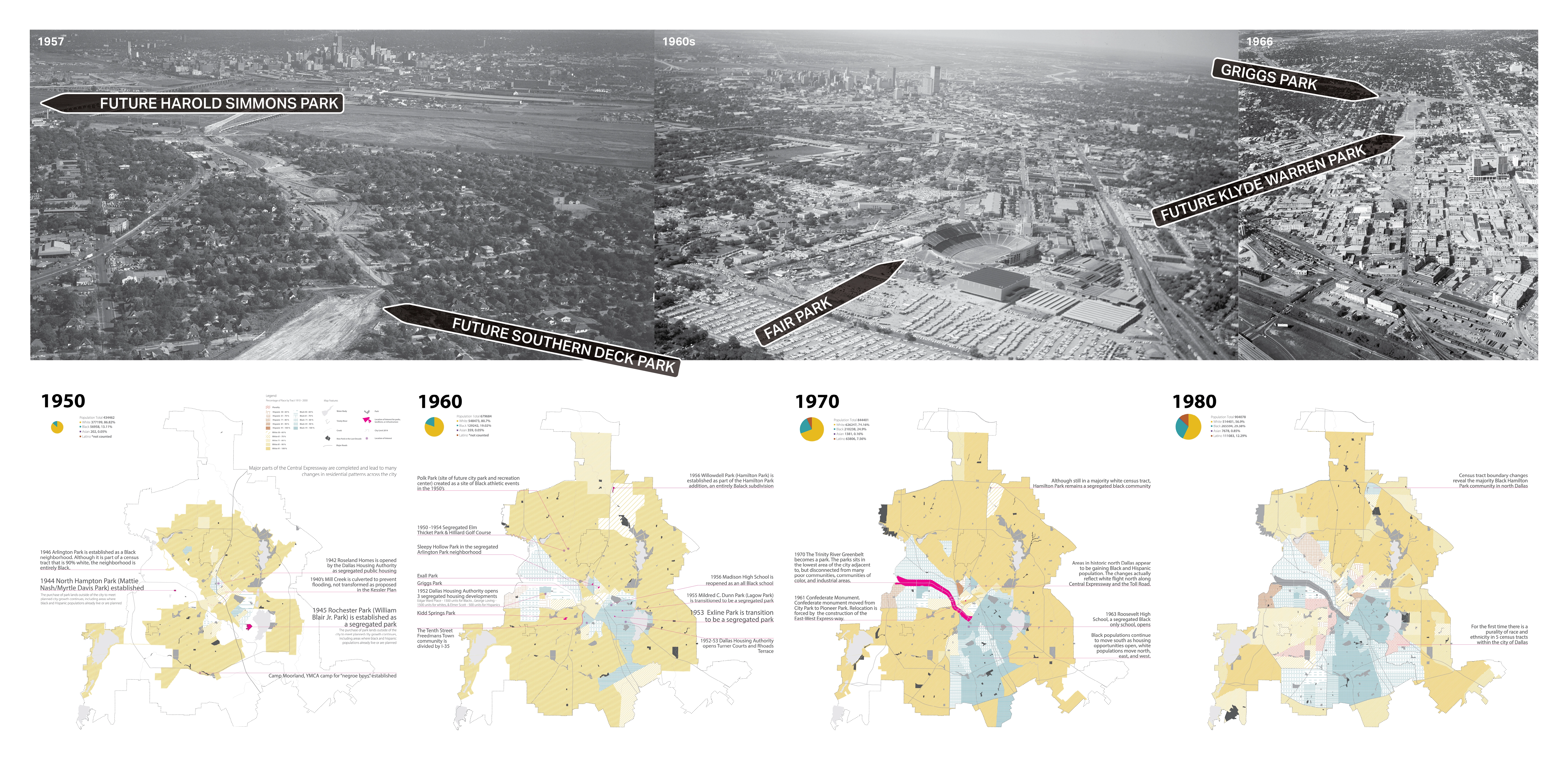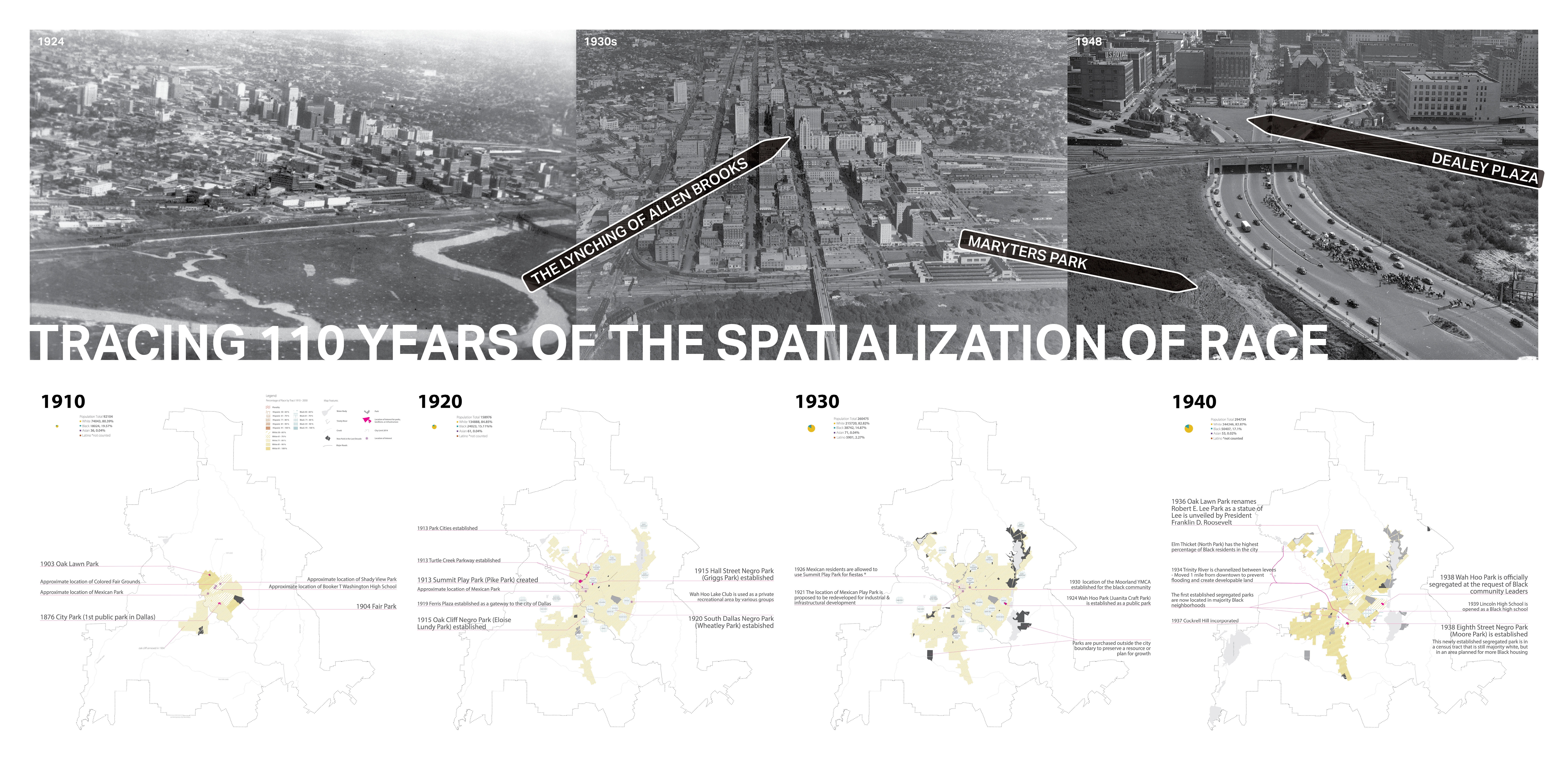 This research uses a century long historical analysis of the public park system in Dallas, Texas, USA to uncover the physical and psychological ways in which public landscapes and the works of landscape architects have segregated urban spaces and how we might fight against these design practices. Through reframing past practice this work seeks to create a method for informing design thought and practices that seek to create a more just built environment. Overlaying the mapping of demographic data with the development of the public park system and incidents of segregation and violence; the research creates a clear link between the social and economic process of racial injustice and the process of park design and urban development.