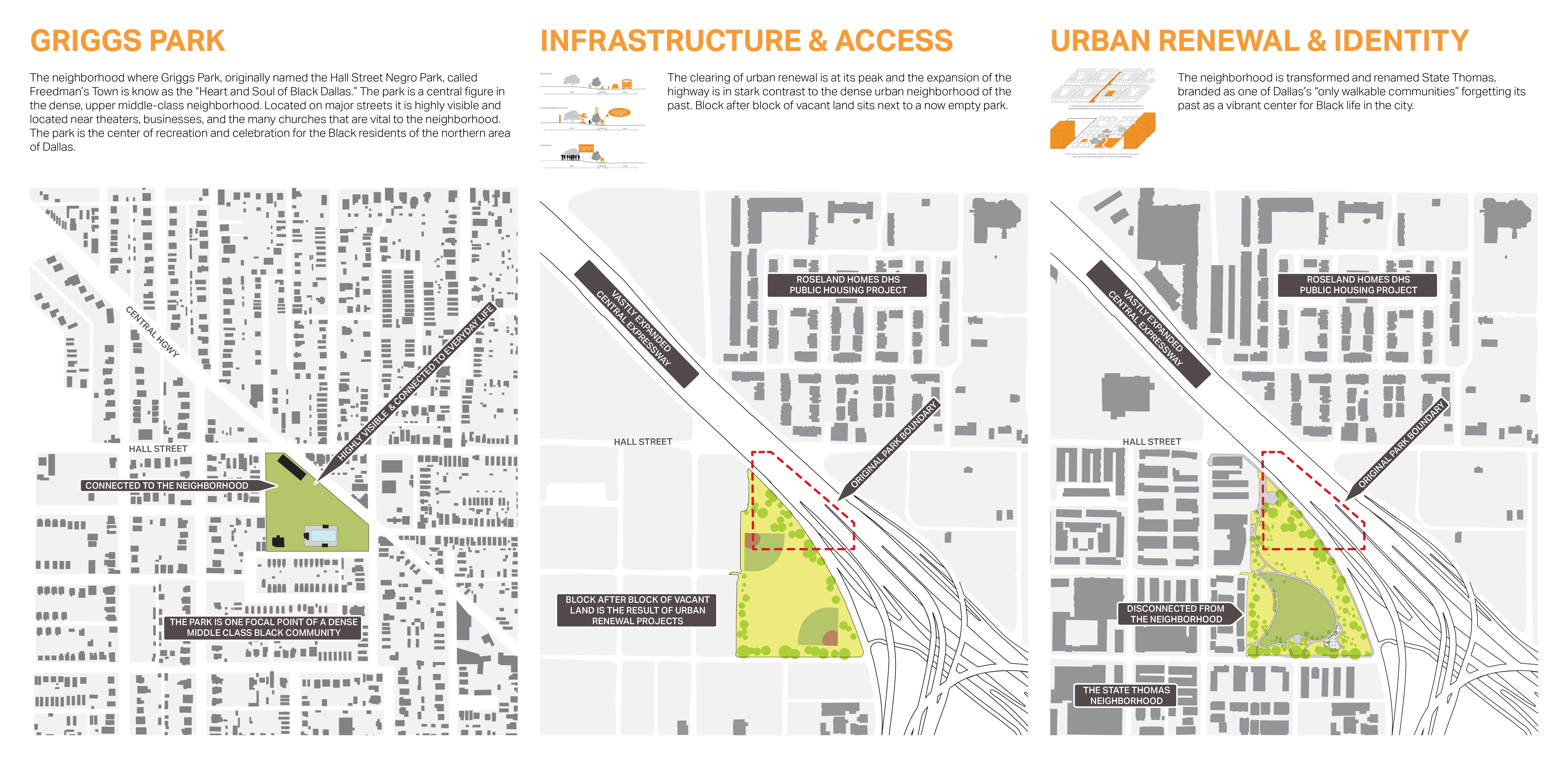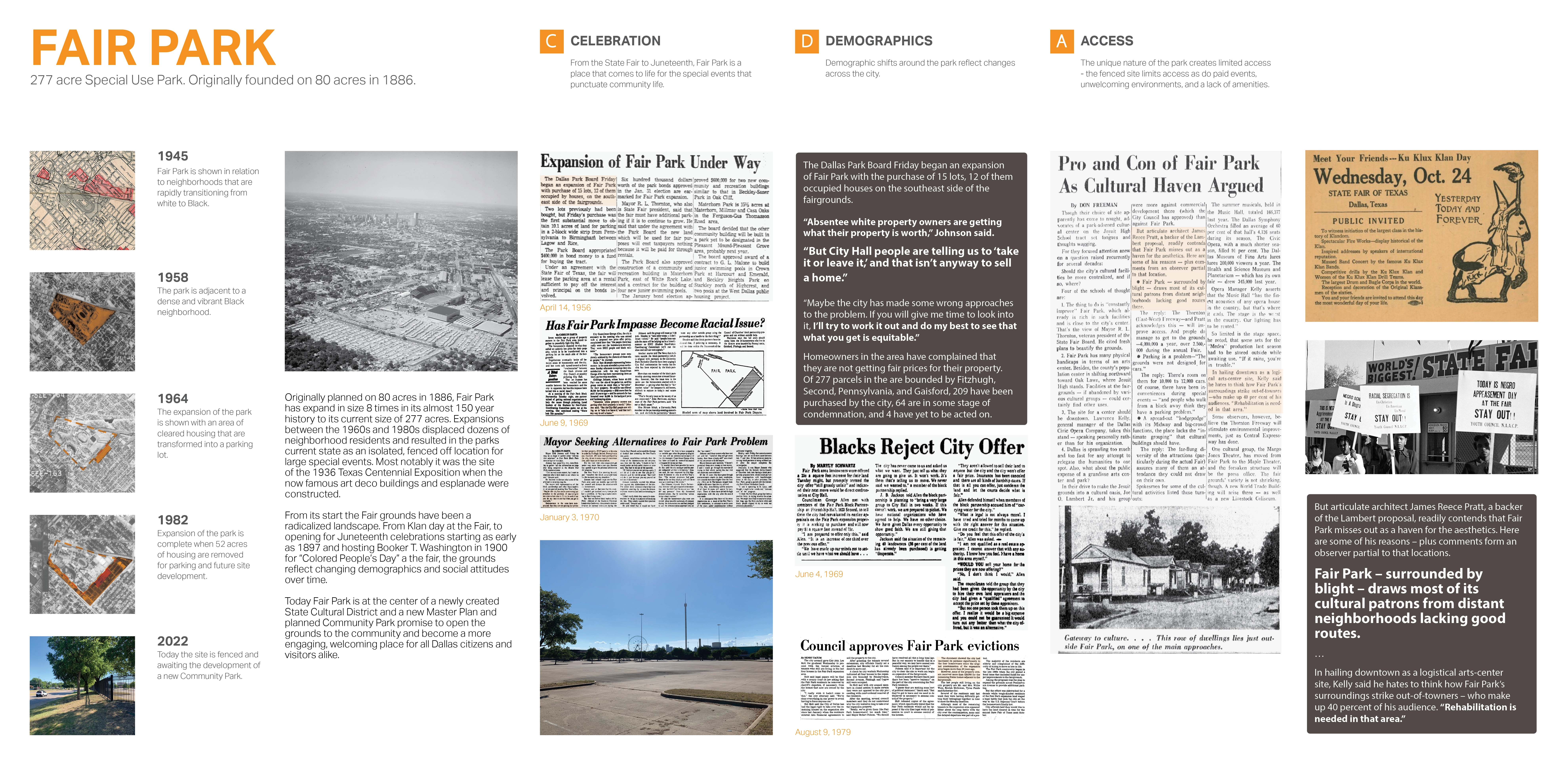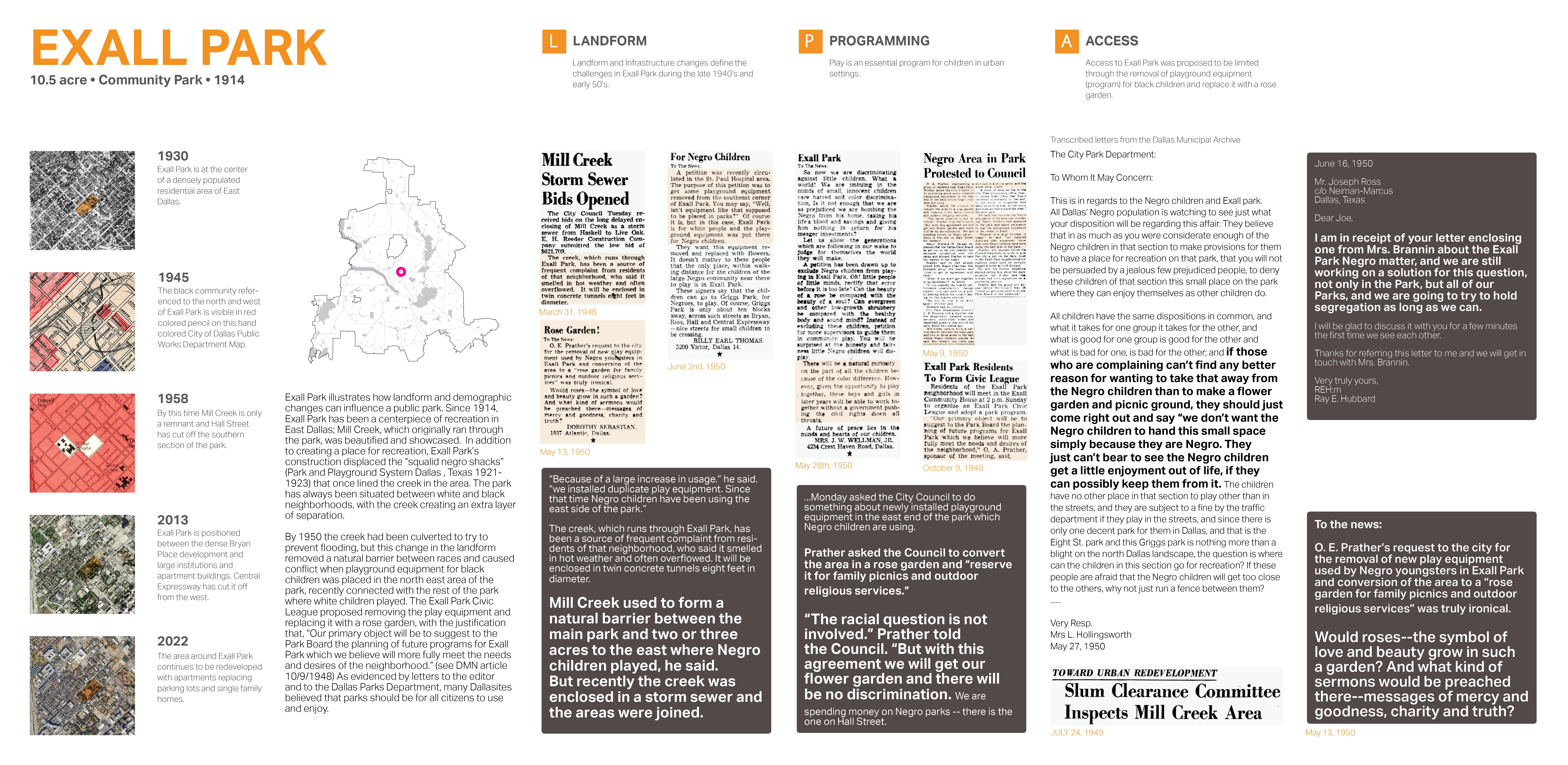 This research uses a century long historical analysis of the public park system in Dallas, Texas, USA to uncover the physical and psychological ways in which public landscapes and the works of landscape architects have segregated urban spaces and how we might fight against these design practices. Through reframing past practice this work seeks to create a method for informing design thought and practices that seek to create a more just built environment. Overlaying the mapping of demographic data with the development of the public park system and incidents of segregation and violence; the research creates a clear link between the social and economic process of racial injustice and the process of park design and urban development.