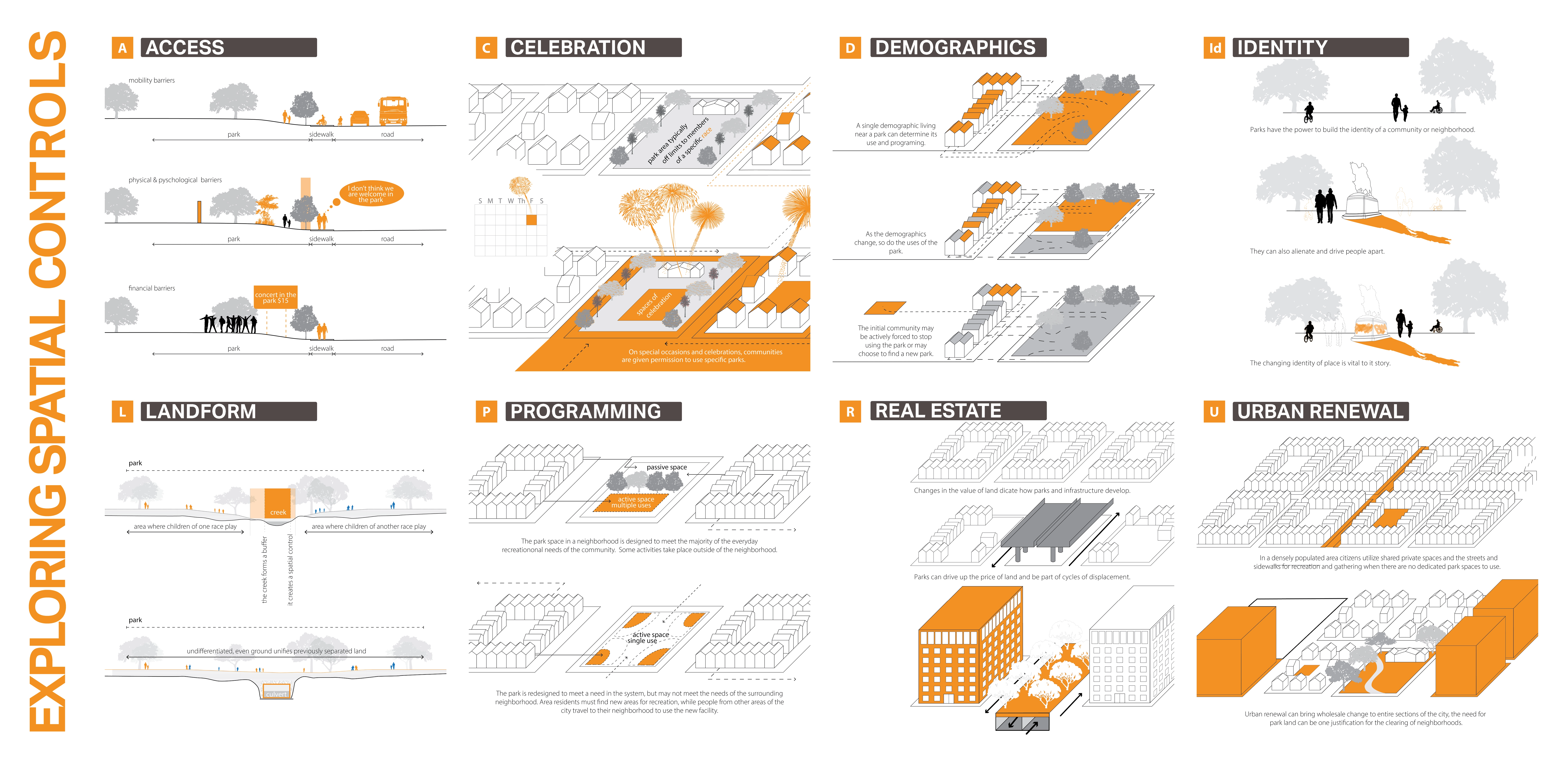 This project overlays the mapping of 110 years of census data and the growth of the public park system, with acts of racialized violence, policy, and design across the city. In addition, an analysis of park planning documents and archives led to the development of seven supporting spatial studies of specific sites of racialized design and violence. Through reframing past and current practice this work is part of informing design that seeks to create a more just built environment.