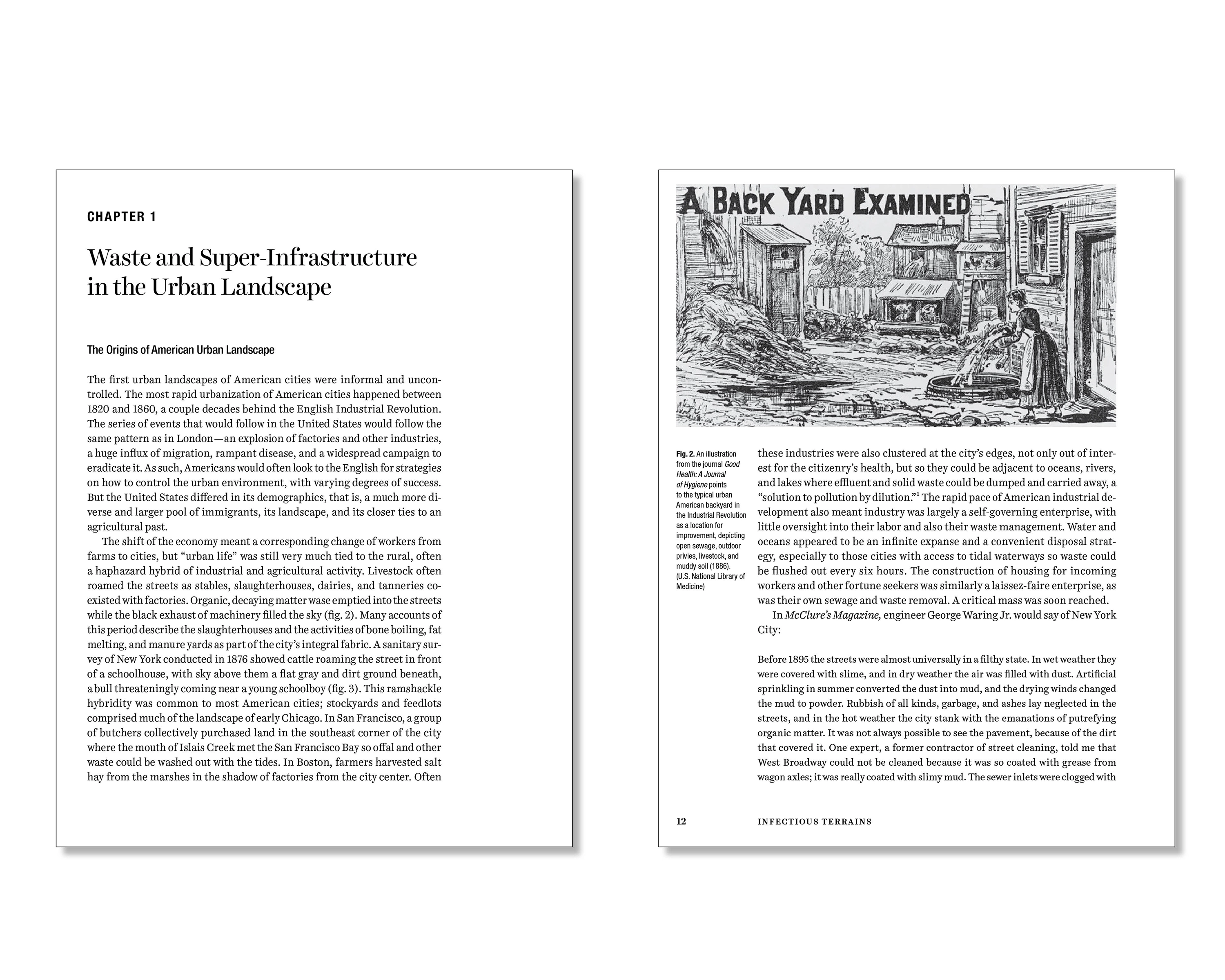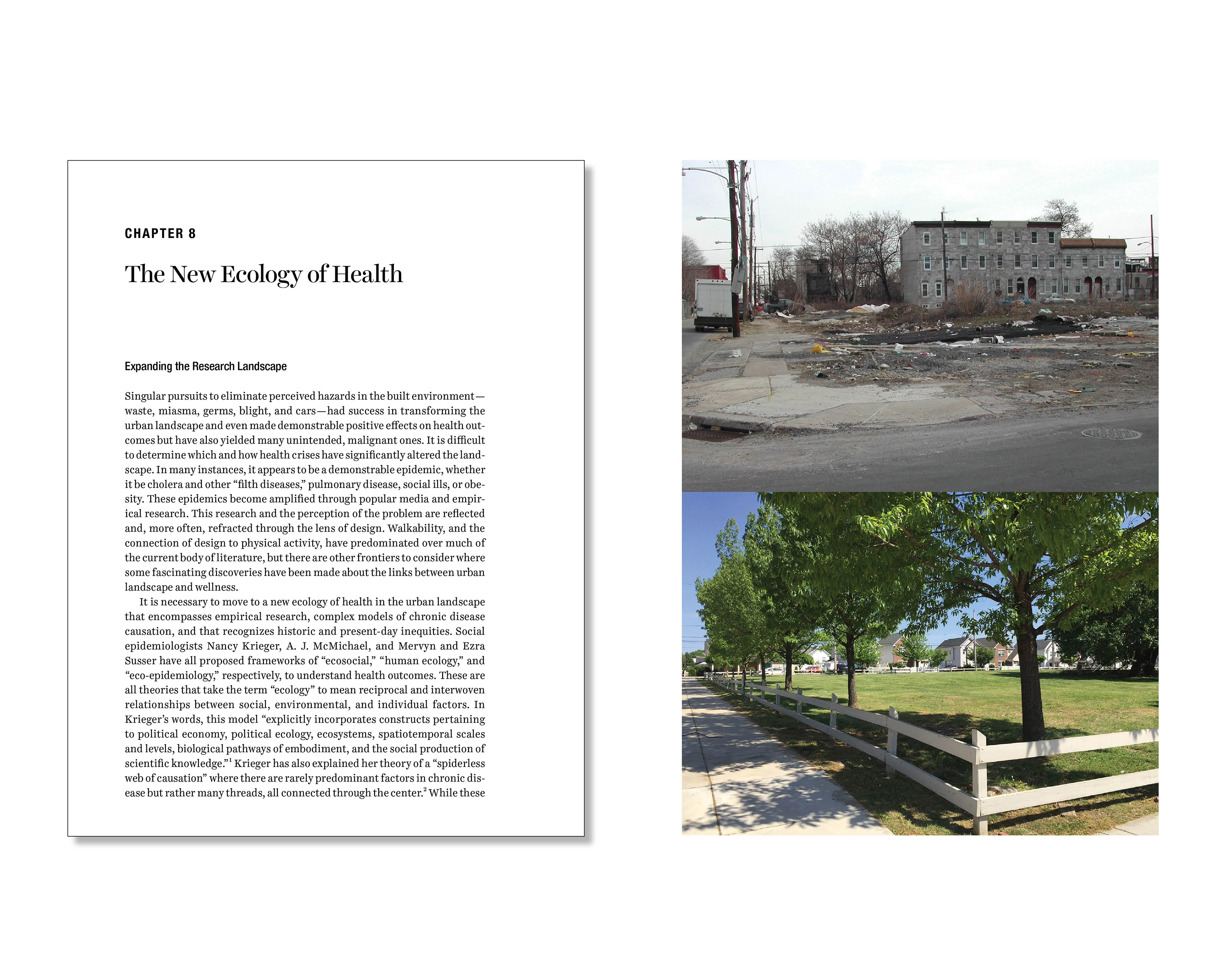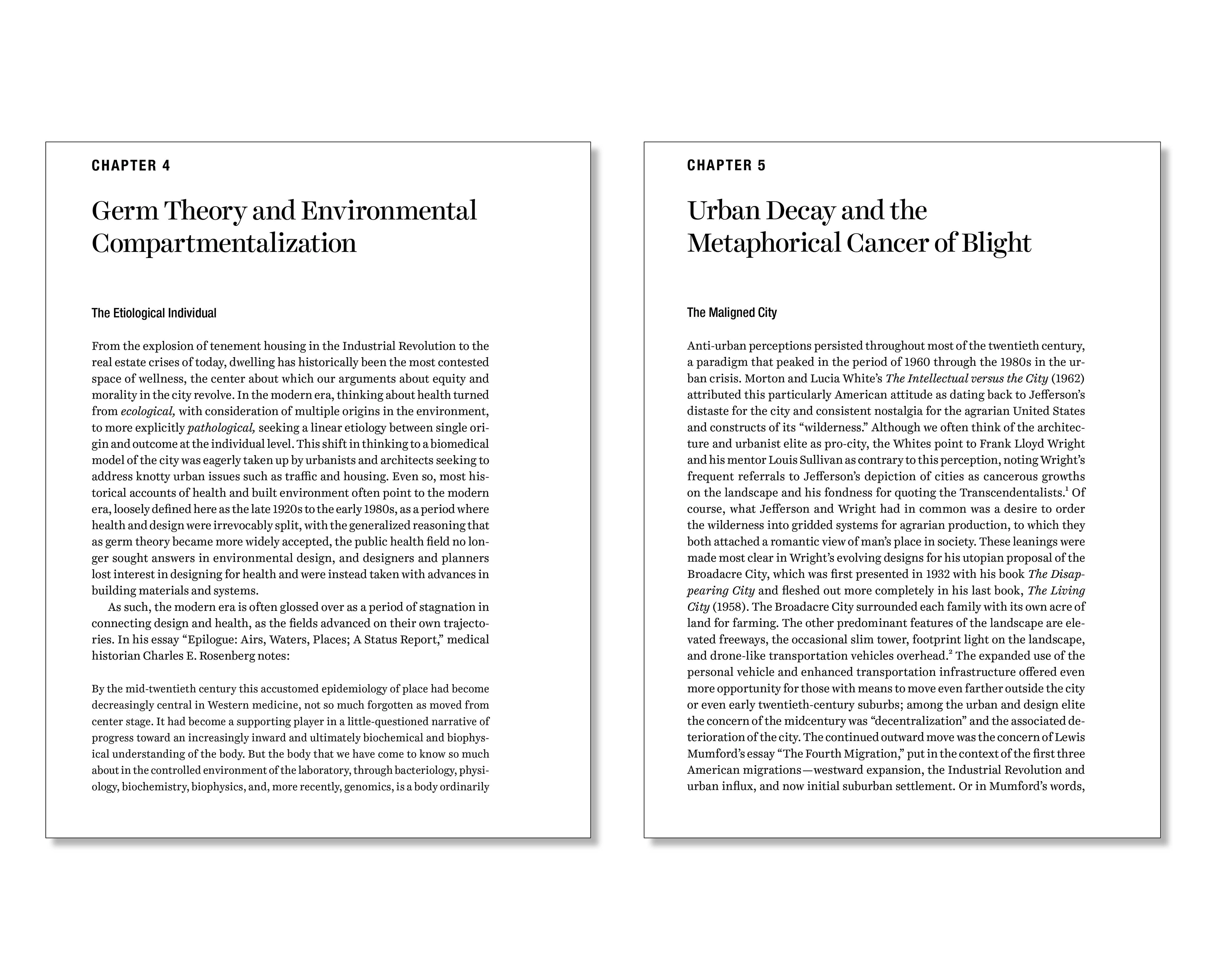 The Topography of Wellness: How Health and Disease Shaped the American Landscape is a chronological narrative of how six historical epidemics had a reciprocal relationship with urban landscapes, reflecting changing views of the power of design, pathologies of disease, and the epidemiology of the environment. From the contagions of cholera and tuberculosis to the more complicated pathways of contemporary chronic illnesses, each disease narrated here, alongside their associated combat strategies of urban quarantine, eradication, and acupuncture has left its mark on the present-day environment. The consideration of this history ends with a call to reframe and reclaim health and equity as central tenets of our profession for the future.