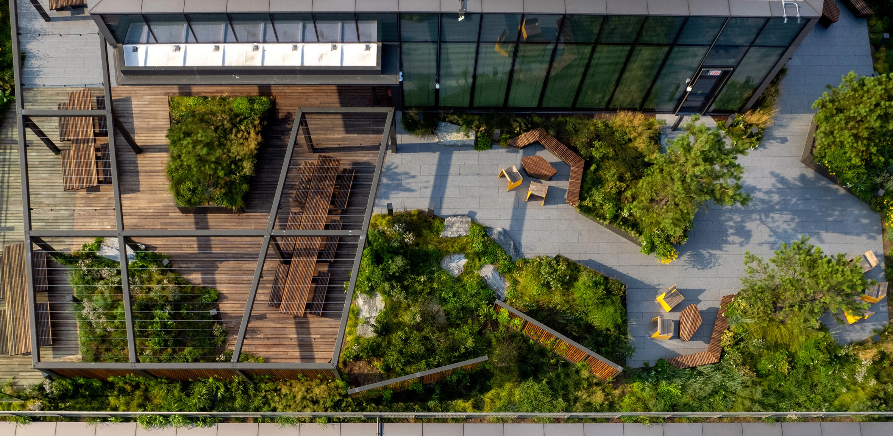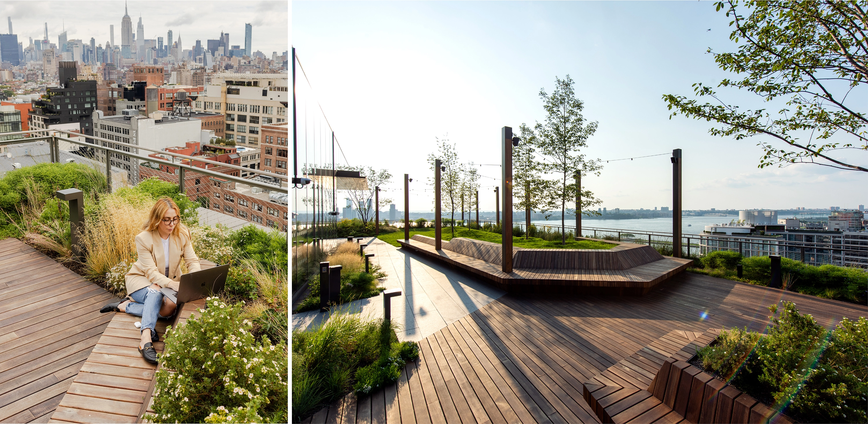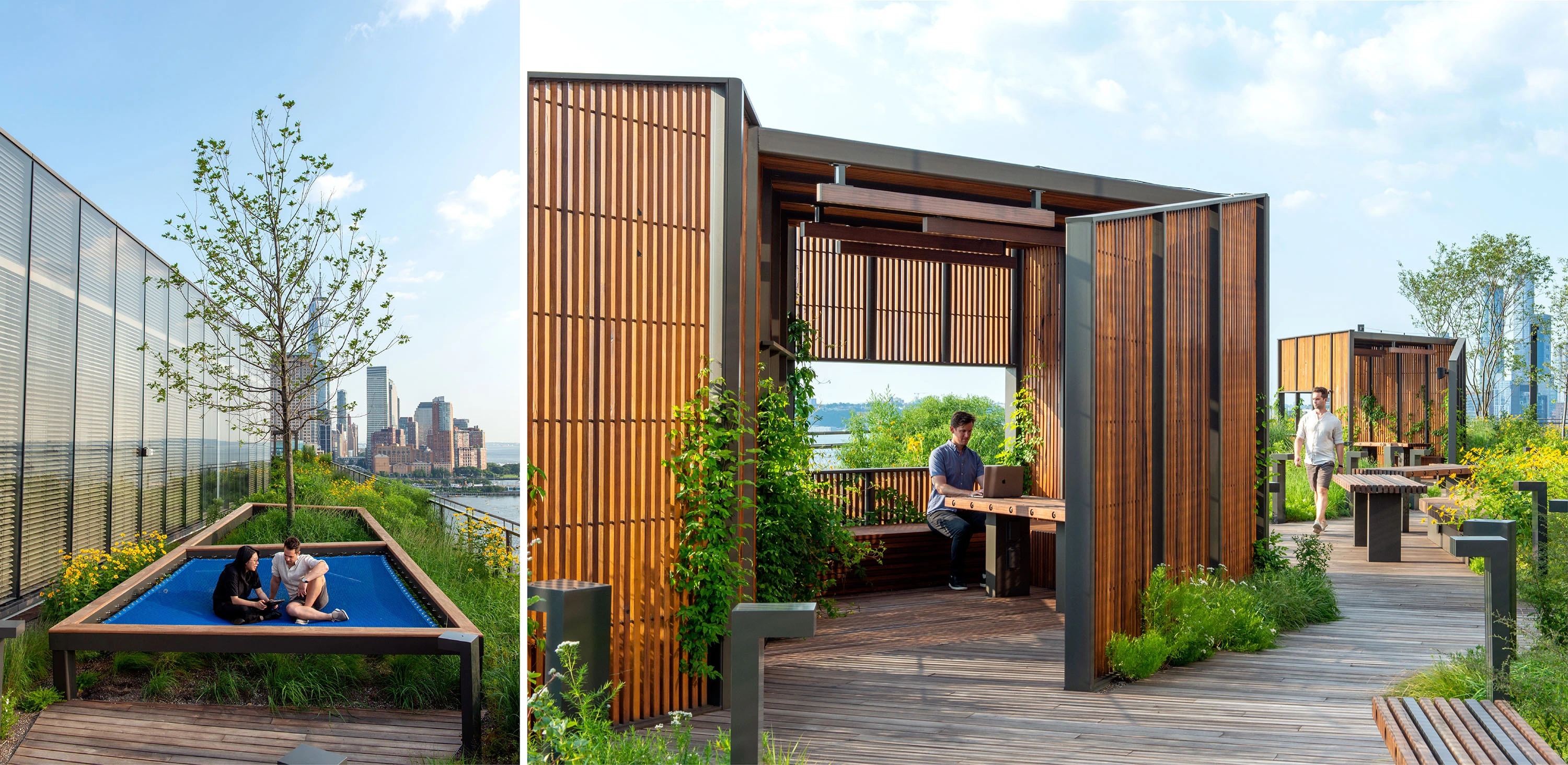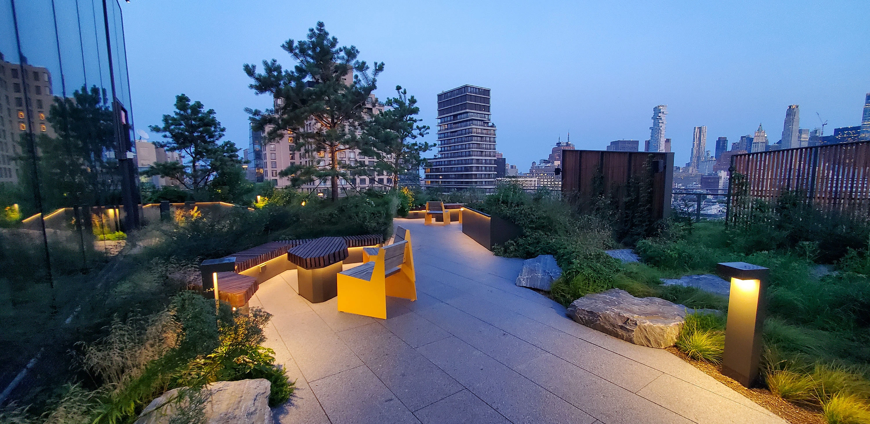 Collectively, the terraces provide a diverse range of work-space environments that inspire collaboration and imagination. The 4th-floor terrace, located on the roof of the existing building, takes cues from its industrial past through distinctive architectural elements, including wind-mitigation screens, pergolas, and seating nooks. The events terrace hosts visitors from the auditorium with a large flexible space, planted islands, fossilized limestone bar counters, and pergolas. The 11th floor is a quarter-mile-long, 360-degree walking path offering a moment of respite, with exceptional views across the water and of the Manhattan skyline. The walking path is framed by plantings inspired by the Dutch term, Bloemendaal – or “Valley of Flowers” – used to characterize the qualities of pre-development Manhattan. The 12th-floor terrace brings employees back to nature with rocky outcroppings and emergent alpine plants at the meditation garden and intimate seating areas nestled in the Pine Grove. A large lawn with rolling topography, a bosque of oak trees, and catenary lights supports flexible use for wellness programming, happy hour events, and lunch hour picnicking.
