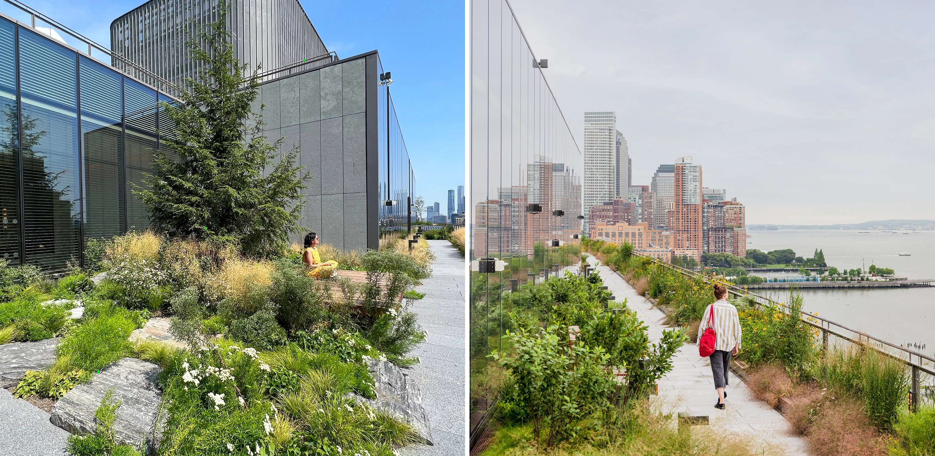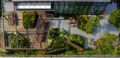Open to the public, the entry plaza provides an immersive garden experience through lush, resilient understory plantings and groves of native trees. The design draws from natural shoreline forms with planted berms and natural boulders complemented by geometric stone seats and paving regionally sourced from upstate New York. The plaza is designed to retain up to 92,000 gallons of rainwater stored in a below-grade cistern and reused for irrigation sitewide. At the 2nd floor, the existing train tracks and platforms emerge from the face of the building and are planted with native trees, shrubs, and groundcover that appear as though they have spontaneously taken root there. Seven stories of window boxes on the north façade provide an ecological ladder for local birds and insects as they traverse from the plaza up to the 12th-floor terrace. NYC Audubon has documented approximatly 40 bird species using the habitat created at St. John's Terminal--including several species never before documented on a green roof.