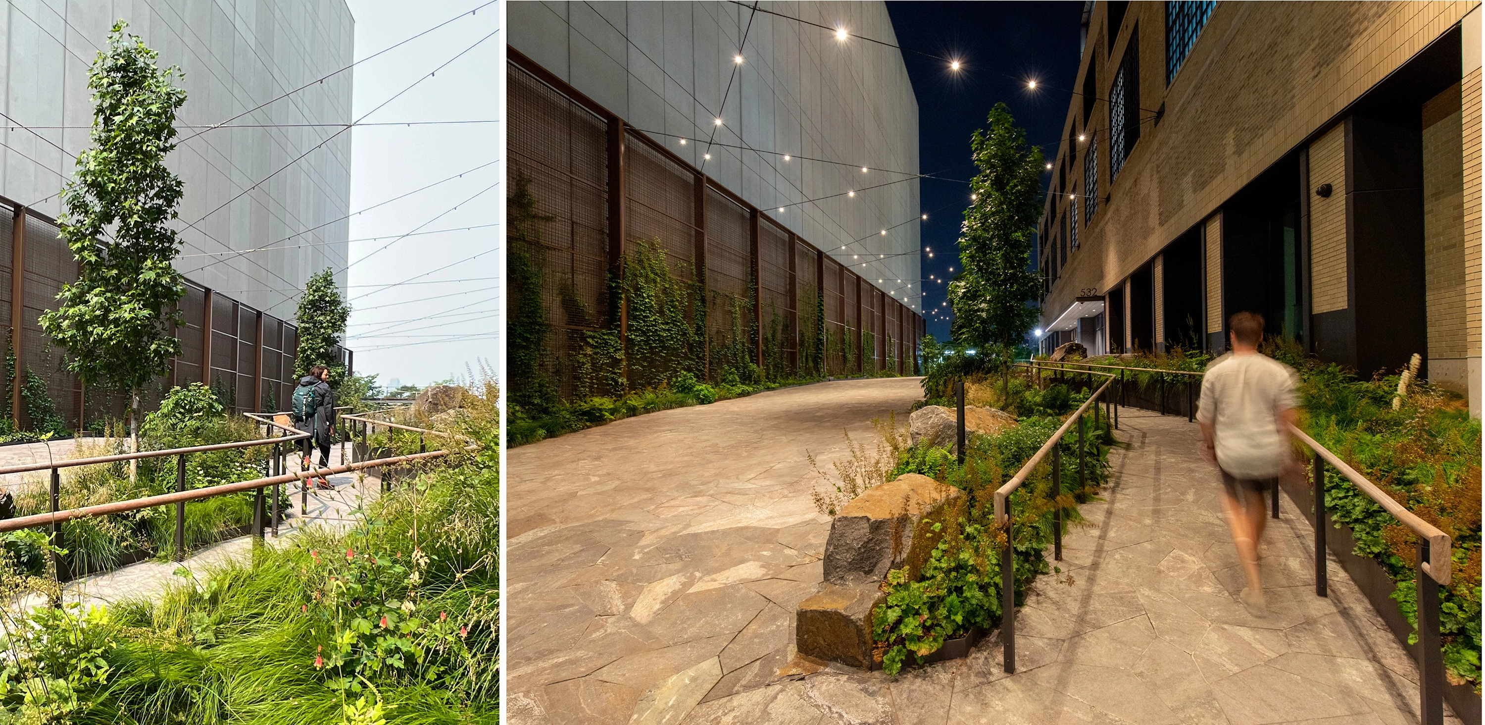 The adaptive reuse of St. John’s Terminal has been skillfully engineered to support roughly 1.5 acres of native habitat across multiple terraces, seven stories of window boxes, planted train tracks in the building’s north façade, and a large public entry plaza. Sustainability, biophilia, and creating meaningful spaces that spark collaboration and imagination were all key to the landscape visioning and design. A journey through the landscape draws you through different moments in the site’s history, expressed through material selections, native planting, and landscape features.