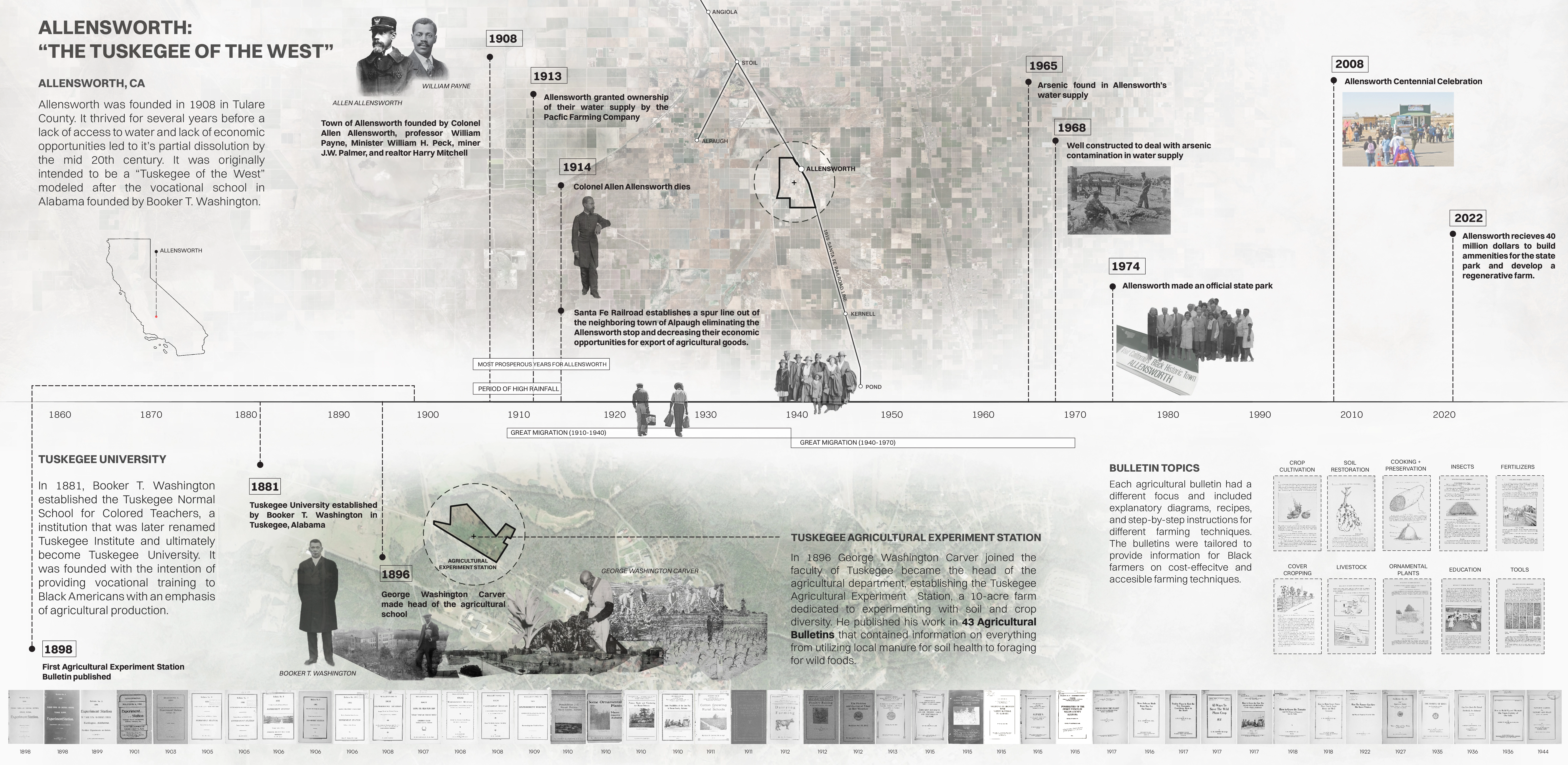In 1908 the all-Black agrarian town of Allensworth was founded in Tulare County, California to serve as a refuge from Jim Crow-era racism. Its founders sought to make it the "Tuskegee of the West," inspired by Booker T. Washington's university in Alabama, which provided vocational training for Black Americans, particularly in agriculture. Agronomist George Washington Carver established the Tuskegee Agricultural Experiment Station, which tested sustainable farming techniques and shared research in 43 Agricultural Bulletins, providing practical, cost-effective methods for Black farmers. Despite its achievements, Allensworth never realized its vision as the "Tuskegee of the West", since water scarcity and limited economic prospects led to its decline by the mid-20th century. The Allensworth Agricultural Experiment Station (AAES) is an ode to Carver’s work and has been developed in collaboration with the non-profit, Allensworth Progressive Association (APA). The AAES aims to test out and determine the most effective methods for soil revitalization, create space for community-based food production, and provide resources and education on agroecology. Agroecology is a holistic agricultural system that considers various ecological elements and attempts to create or strengthen mutualistic relationships between them. In many ways, it is the antithesis of extractive and destructive industrial agriculture systems and can provide the basis for a new system for food production in Allensworth.