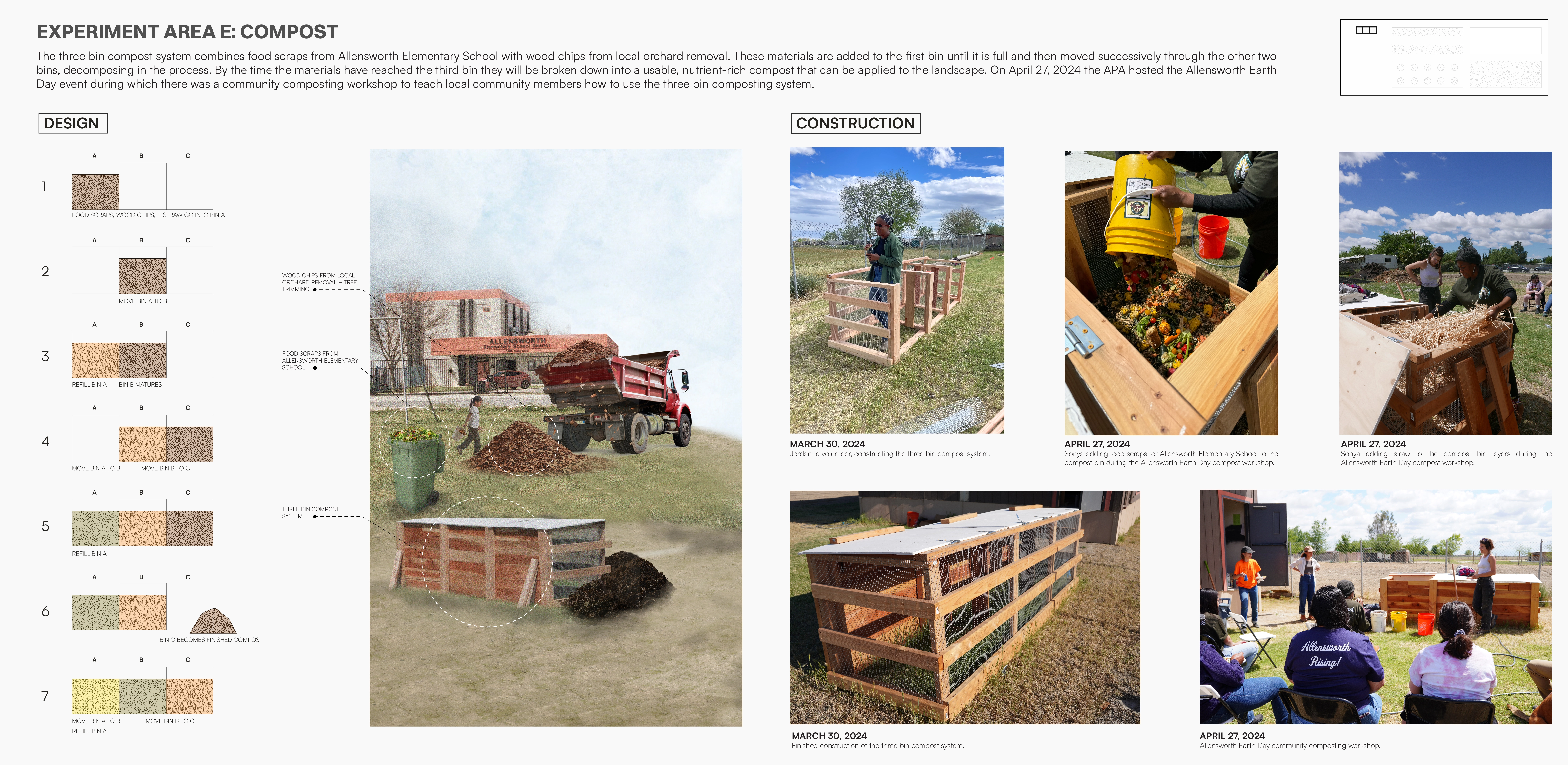 Through existing community relationships, the APA was able to help facilitate local involvement in the development and construction of the AAES. This included organizing the weekly collection of food scraps from the Allensworth Elementary School cafeteria, establishing relationships with local orchard removal services to schedule deliveries of wood chips, and locating other suppliers of organic materials that could be diverted from the organic waste stream and reincorporated on the AAES site for soil building. Additionally, through a series of community visits and volunteer days, local residents and other volunteers were able to gather at the AAES and collaborate on its design and construction. During the largest community event centered around Earth Day, attendees, which consisted of members of the APA and local residents, planted over 50 native species and participated in a compost workshop that included a demo on how compost works and how to use the three-bin compost system at the AAES.