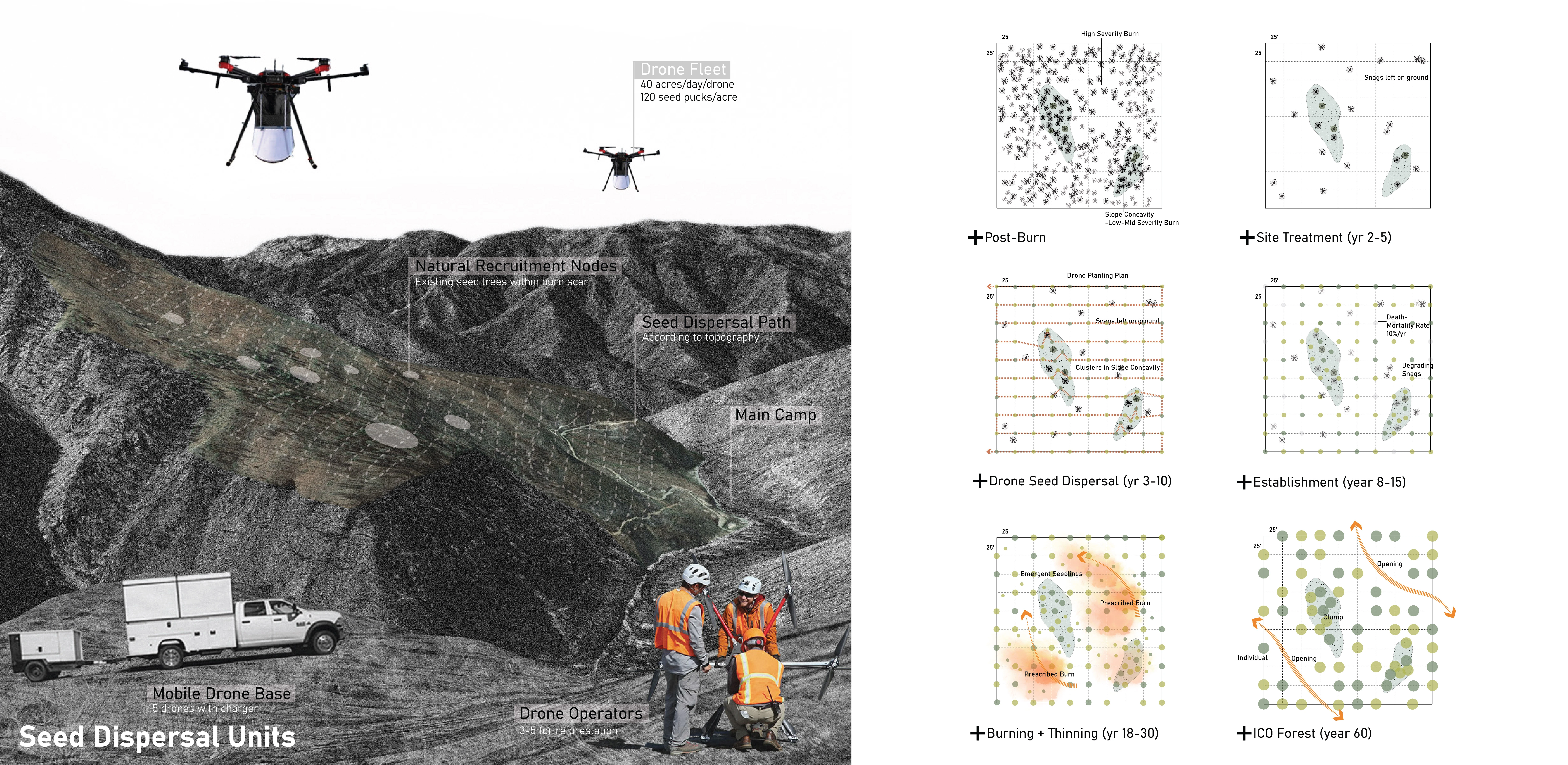 By drone, seedpuck dispersal can happen at a high rate on the treated land. Harnessing the wet depressions of a hillside, often a clump of seed-bearing trees, an ICO reforestation pattern is possible. Making up an ICO, individual trees are influencers, clumps of them bear the seed for natural regeneration, and openings foster new growth and micro-ecotones. Achieving this pattern creates a highly variable fuel load limiting fire spread as well as a strong network helping to reintroduce a diverse ecosystem.