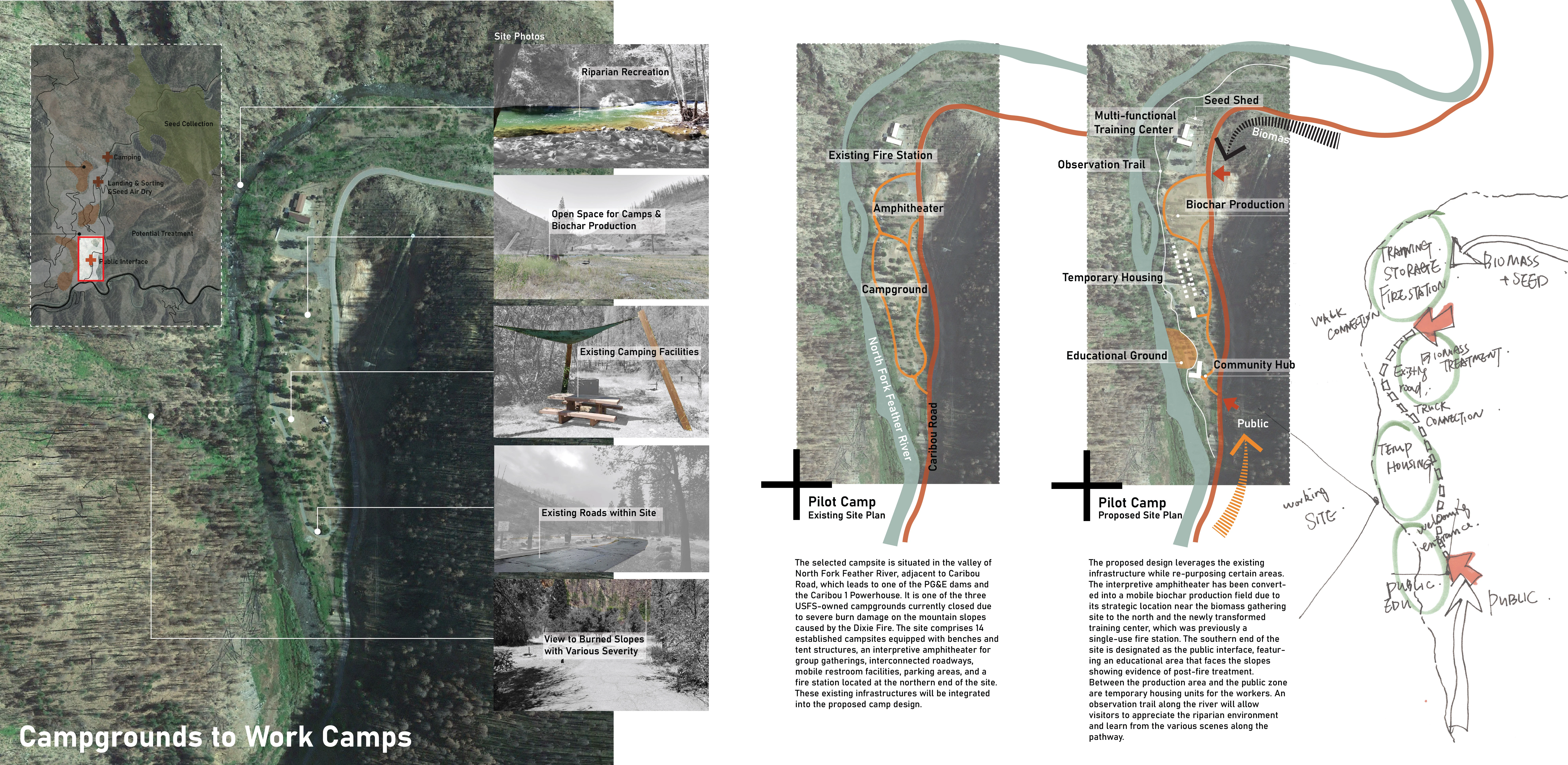 With wildfires in Plumas National Forest increasing, there is an urgent need to reduce forest fuels while reforesting. Removing fuels from burnt and overstocked forests can initiate a small biochar industry, providing funds and planting medium for needed seedstock. Establishing working forests using existing campsites introduces a semi-permanent intervention that offers the opportunity to collect seeds and biomass, reforest, and educate the public. Utilizing natural regeneration and drone seeding, the efforts of these camps can endure for generations, promoting resiliency, community involvement, while at the same time fostering a resilient and healthier forest ecosystem into the future.