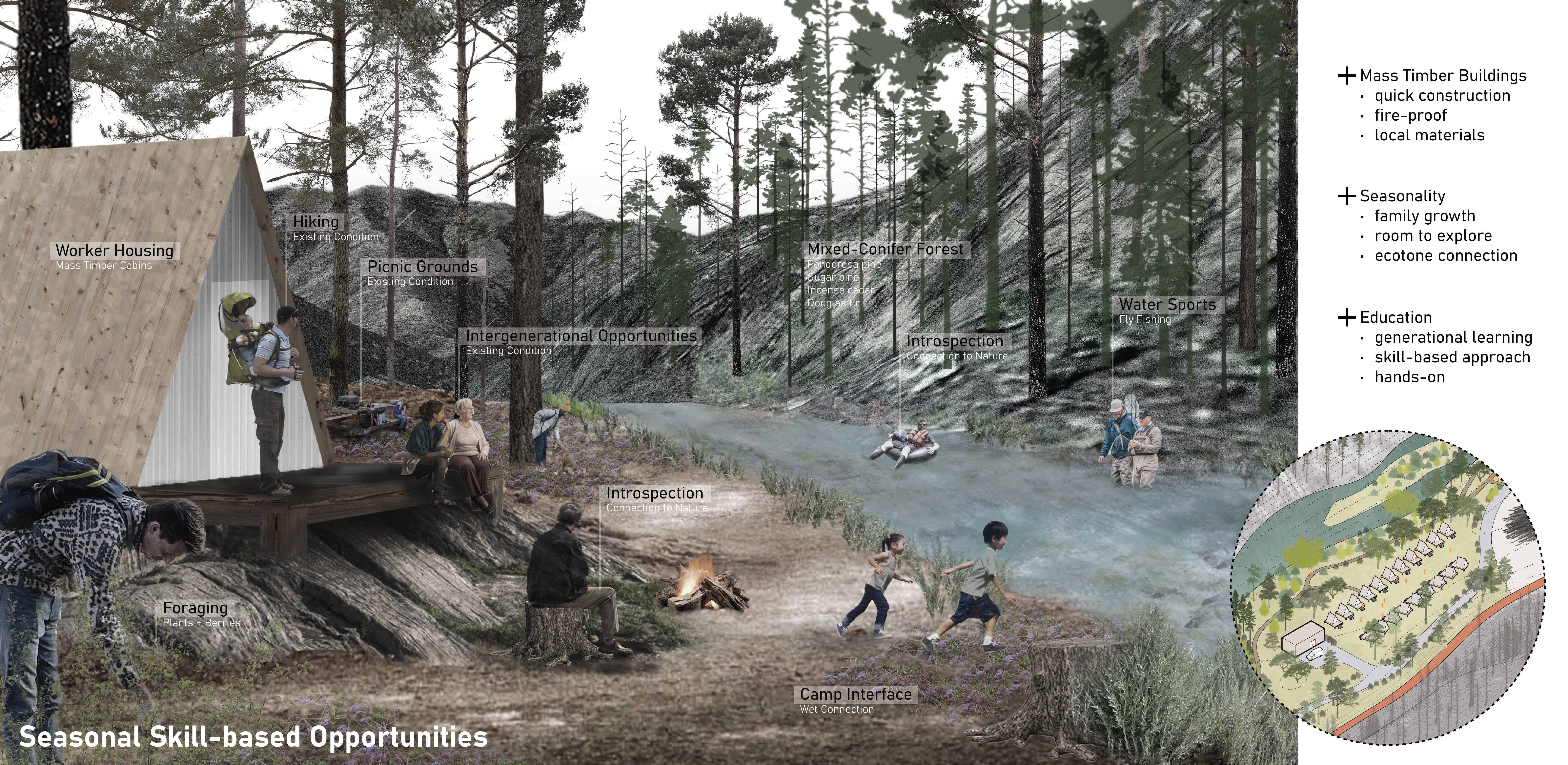 The forest is a living, breathing entity, so in order to address the issues, it was important for us to understand it from an insider’s point-of-view. Speaking to US Forest Service rangers, community members, and the local logging industry taught us how the existing systems are disconnected and often fall short. Issues, though, are interconnected and vary according to site conditions like elevation, fire severity, accessibility, and ecosystem. For example, there aren’t enough seedlings to keep up with reforestation depending on zone and scale of fire. Our site transect, a semi-permanent intervention, revolves around an existing camp that can address issues hyper-locally.