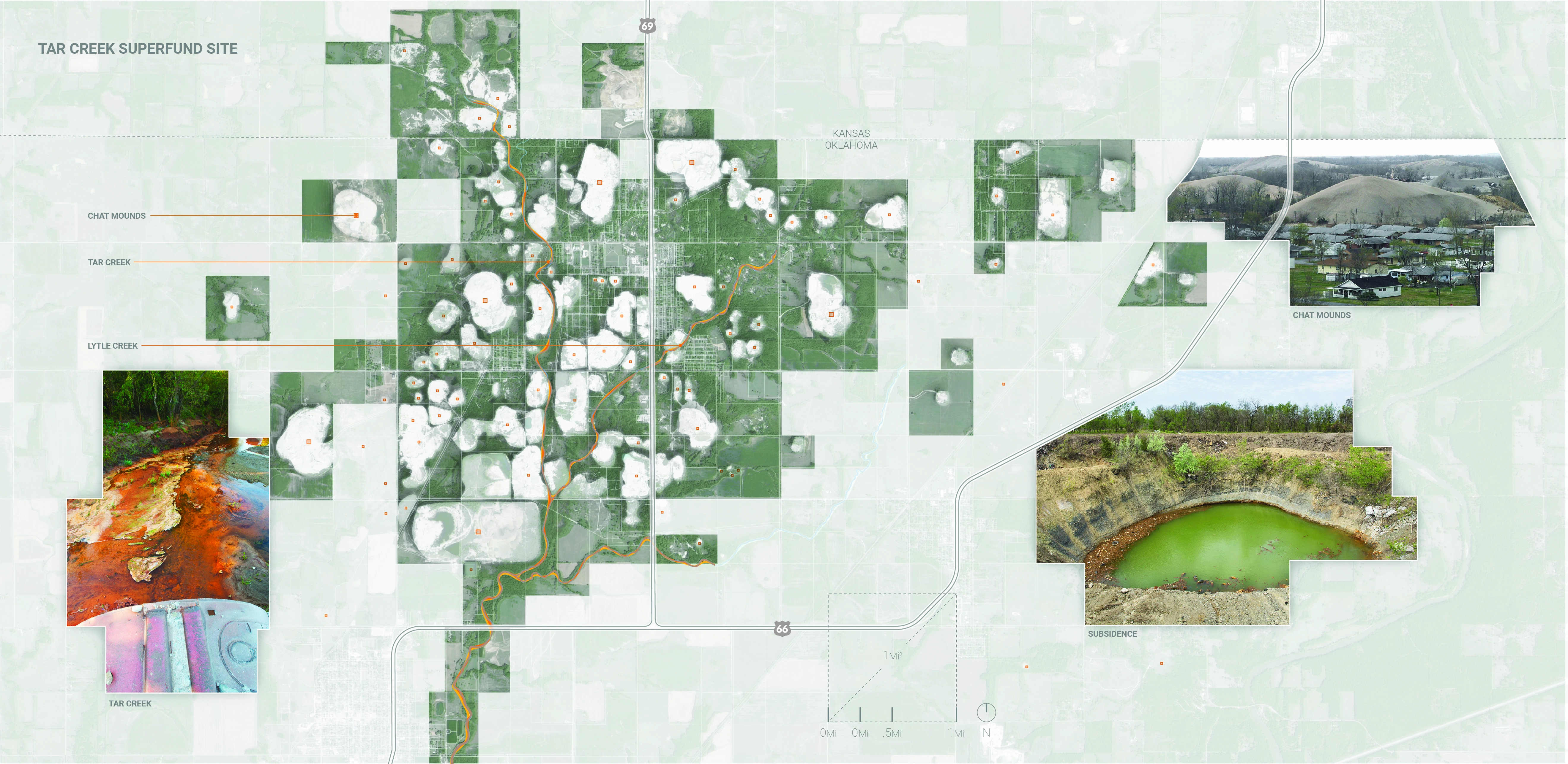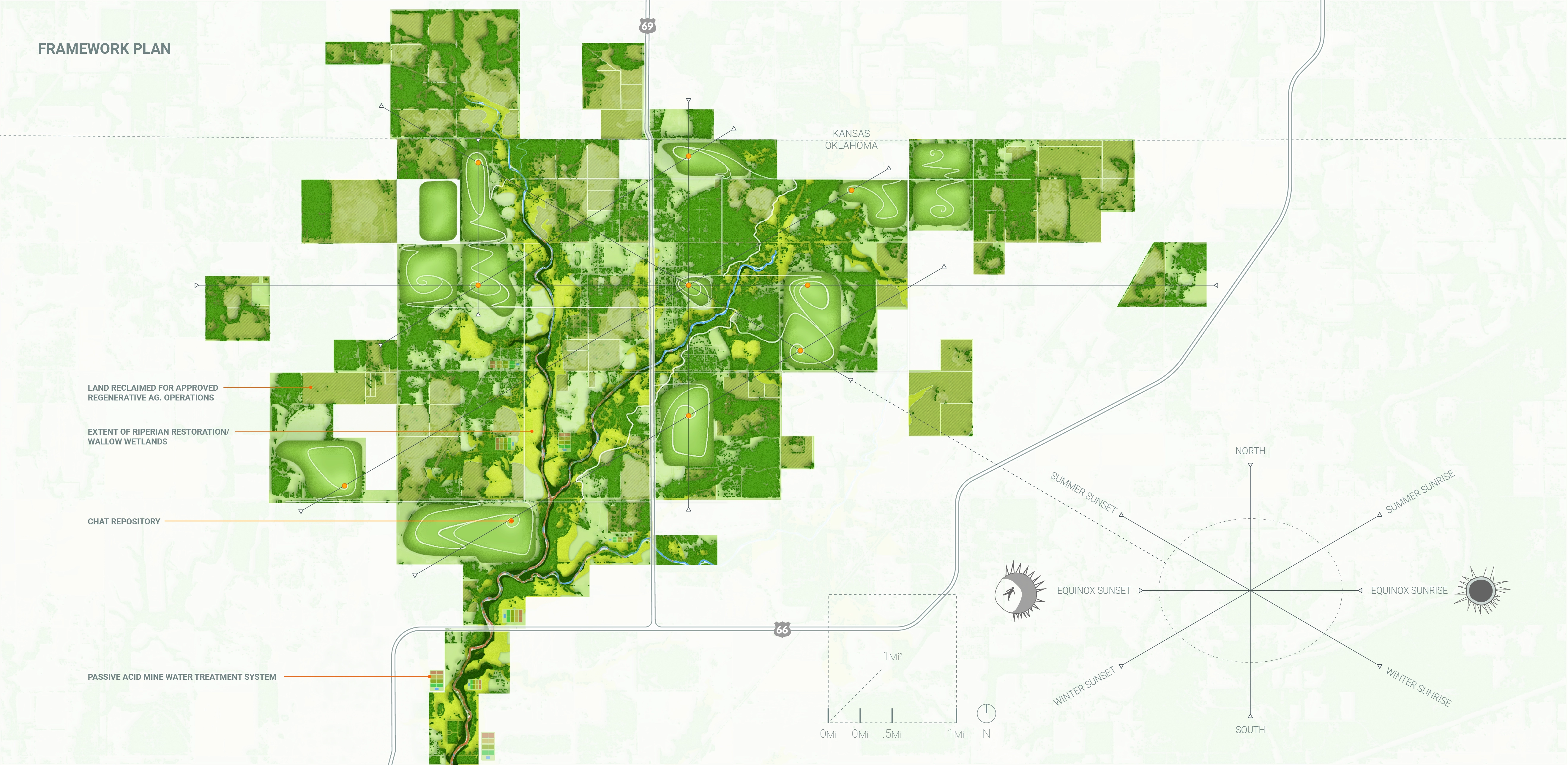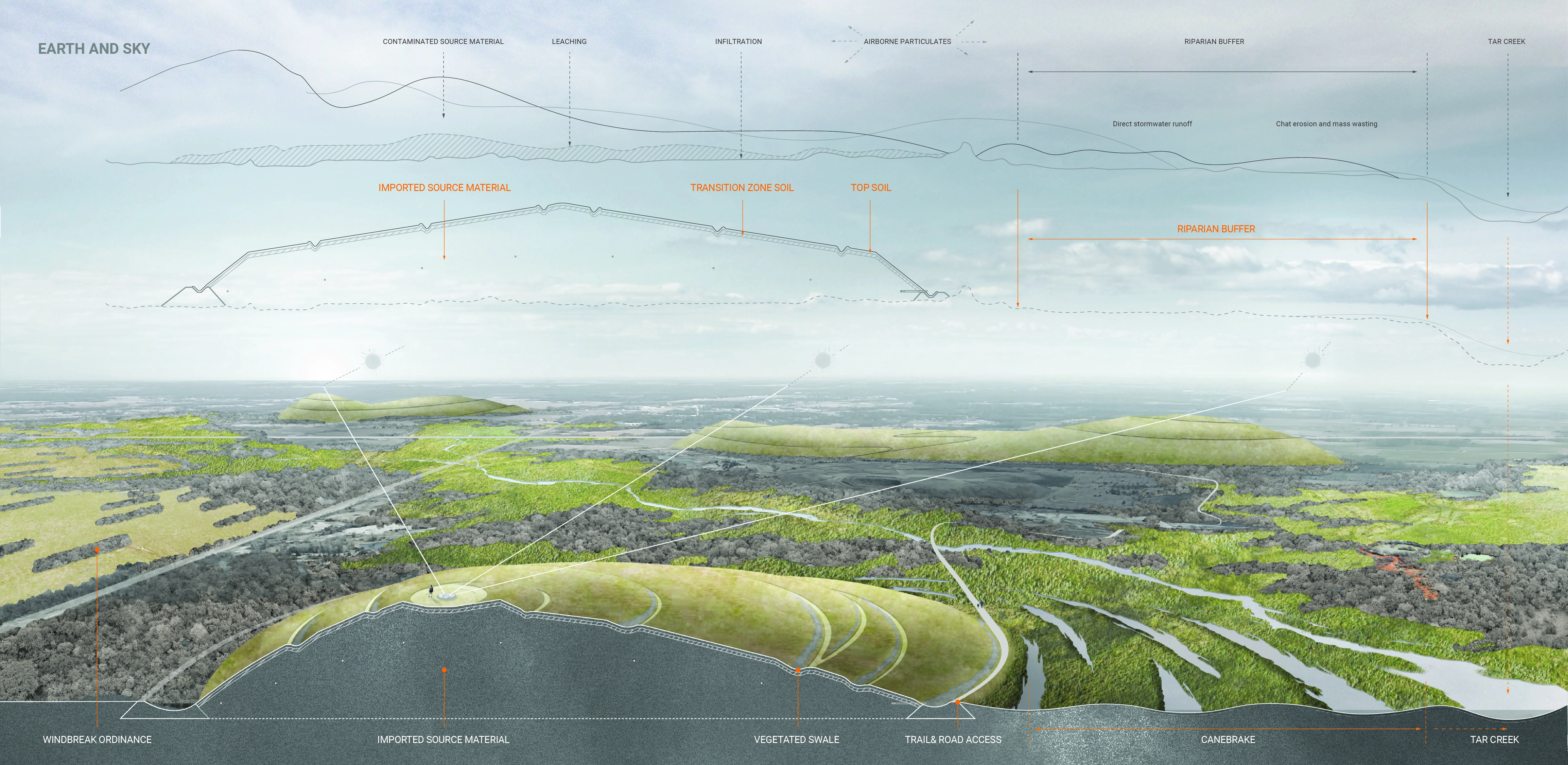 The Tar Creek Superfund Site is among the most polluted landscapes in the country. Just Land repositions ongoing efforts to remediate toxic mining waste into repositories as the foundation for a regional landscape gesture. Taking into consideration areas of cultural significance to Quapaw Nation, the design proposes a careful alignment of future repositories along a specific celestial orientation as well as the reintroduction of a managed native canebrake ecosystem tied together by a trail network. Just Land aims to consider environmental regeneration as a framework for the reclamation of both culture and land with respect to the 10 tribes that call Ottawa County home and provides a model for decolonialization through environmental justice.