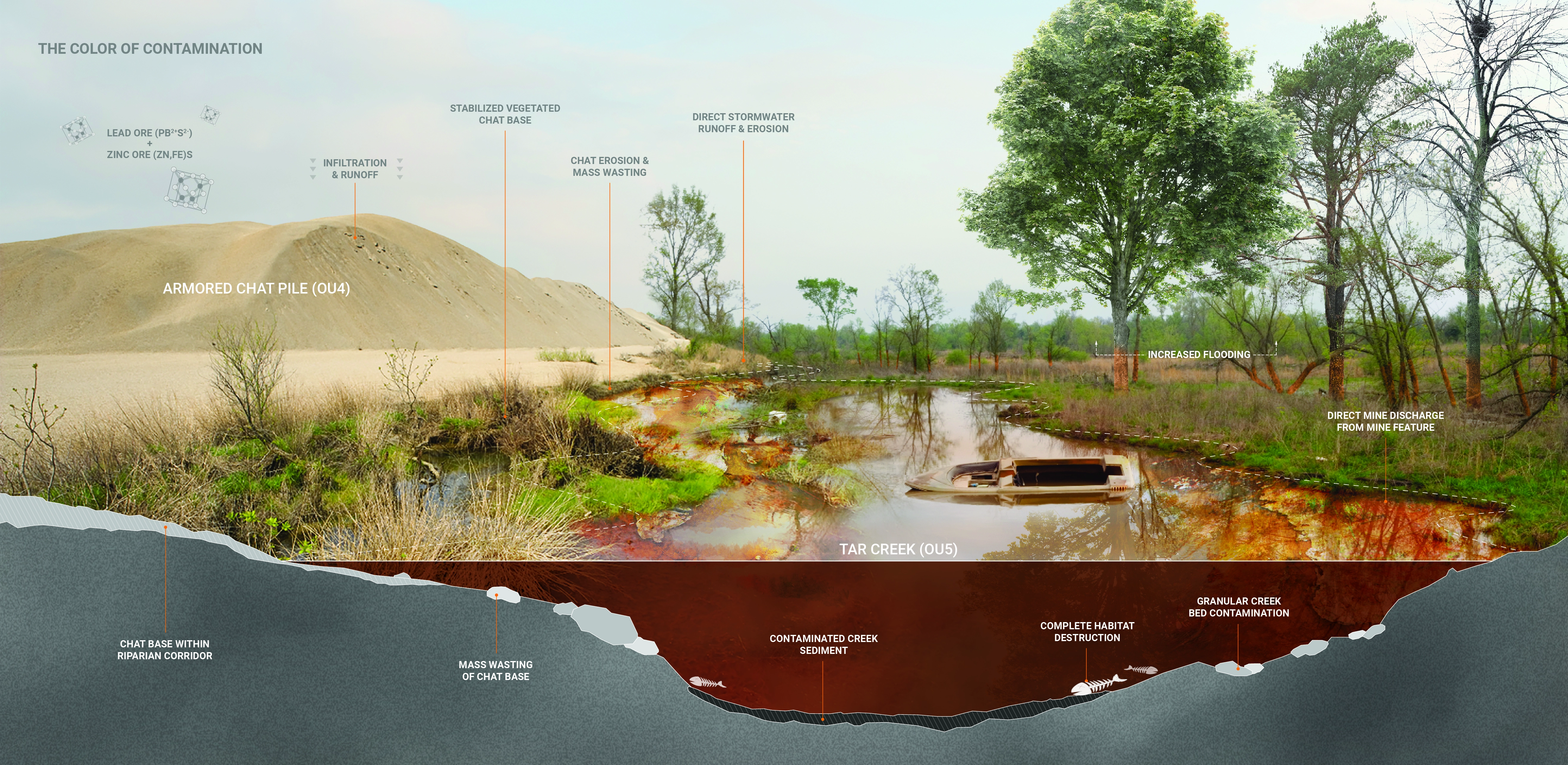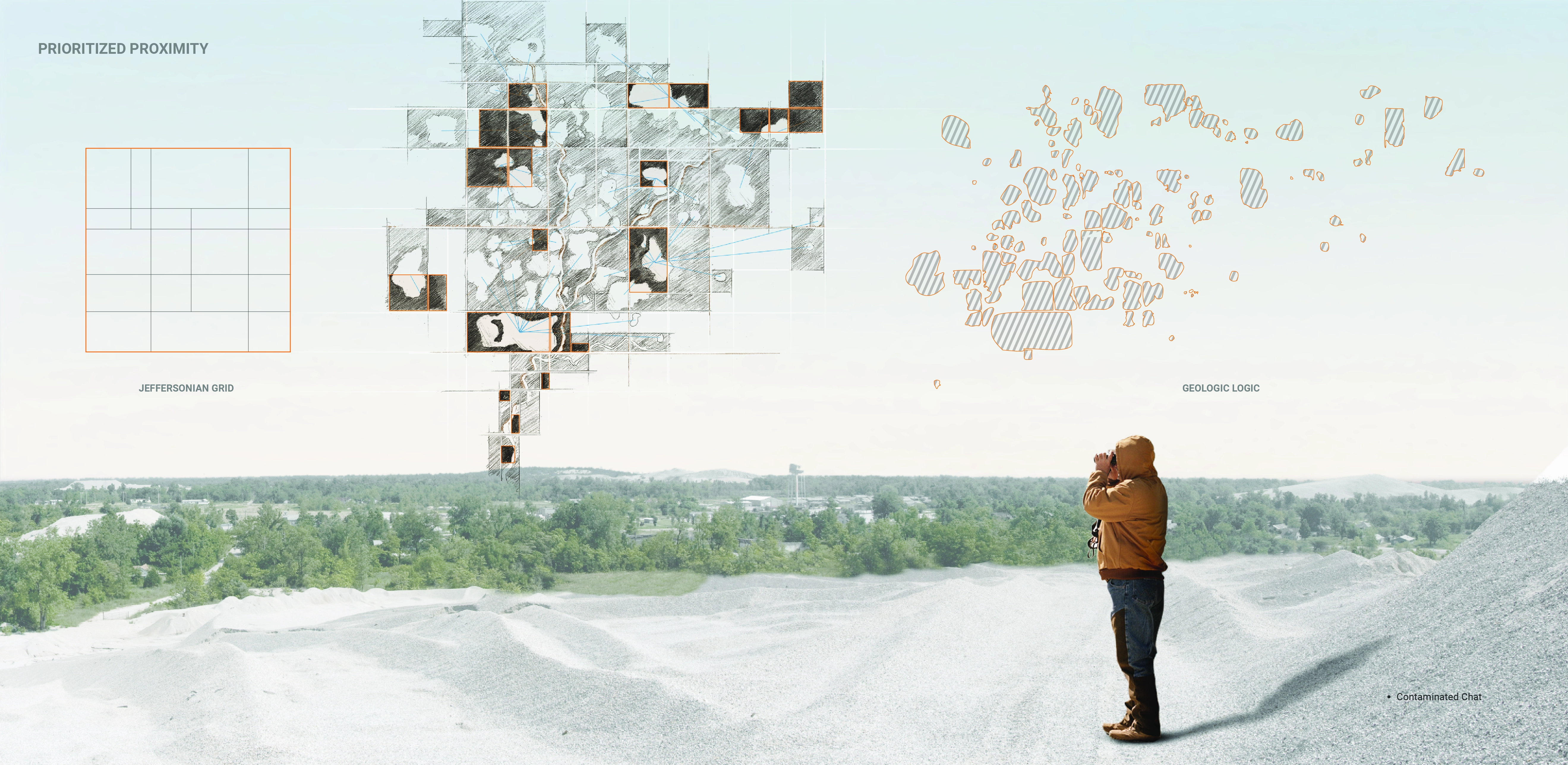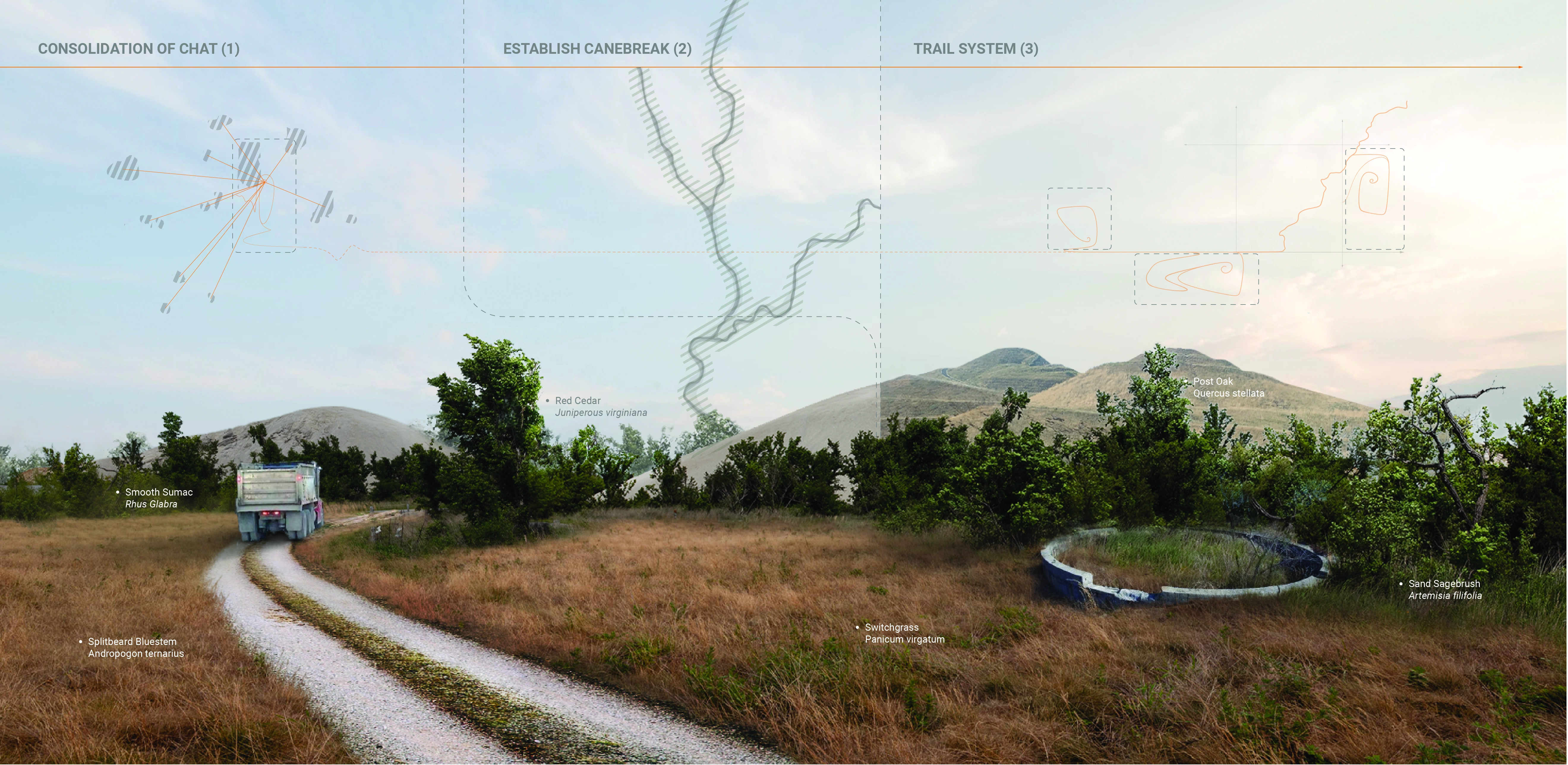 The Tar Creek Superfund Site is among the most polluted landscapes in the country. Just Land repositions ongoing efforts to remediate toxic mining waste into repositories as the foundation for a regional landscape gesture. Taking into consideration areas of cultural significance to Quapaw Nation, the design proposes a careful alignment of future repositories along a specific celestial orientation as well as the reintroduction of a managed native canebrake ecosystem tied together by a trail network. Just Land aims to consider environmental regeneration as a framework for the reclamation of both culture and land with respect to the 10 tribes that call Ottawa County home and provides a model for decolonialization through environmental justice.