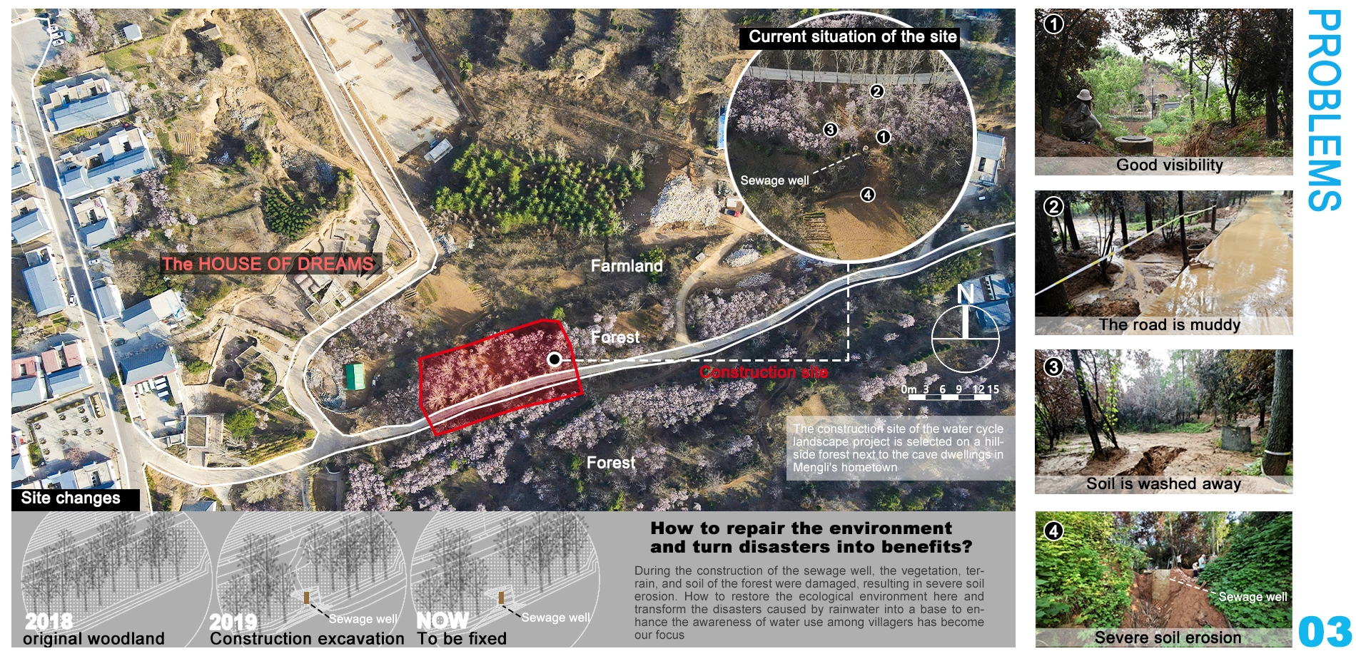 Global warming has increased carbon emissions and natural disasters. Rural areas, lacking drainage systems, face severe flooding and drought. Proper rainwater storage brings significant benefits. Strengthening rural water systems with low-carbon, sustainable solutions is essential. We chose Zhoushan Village, Dengfeng City, Henan Province, as a pilot site.