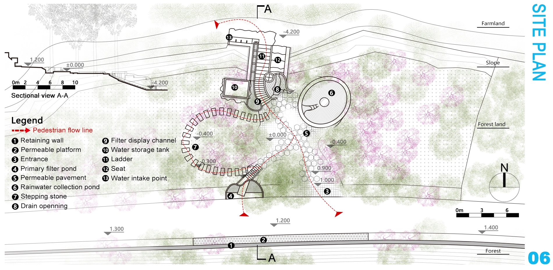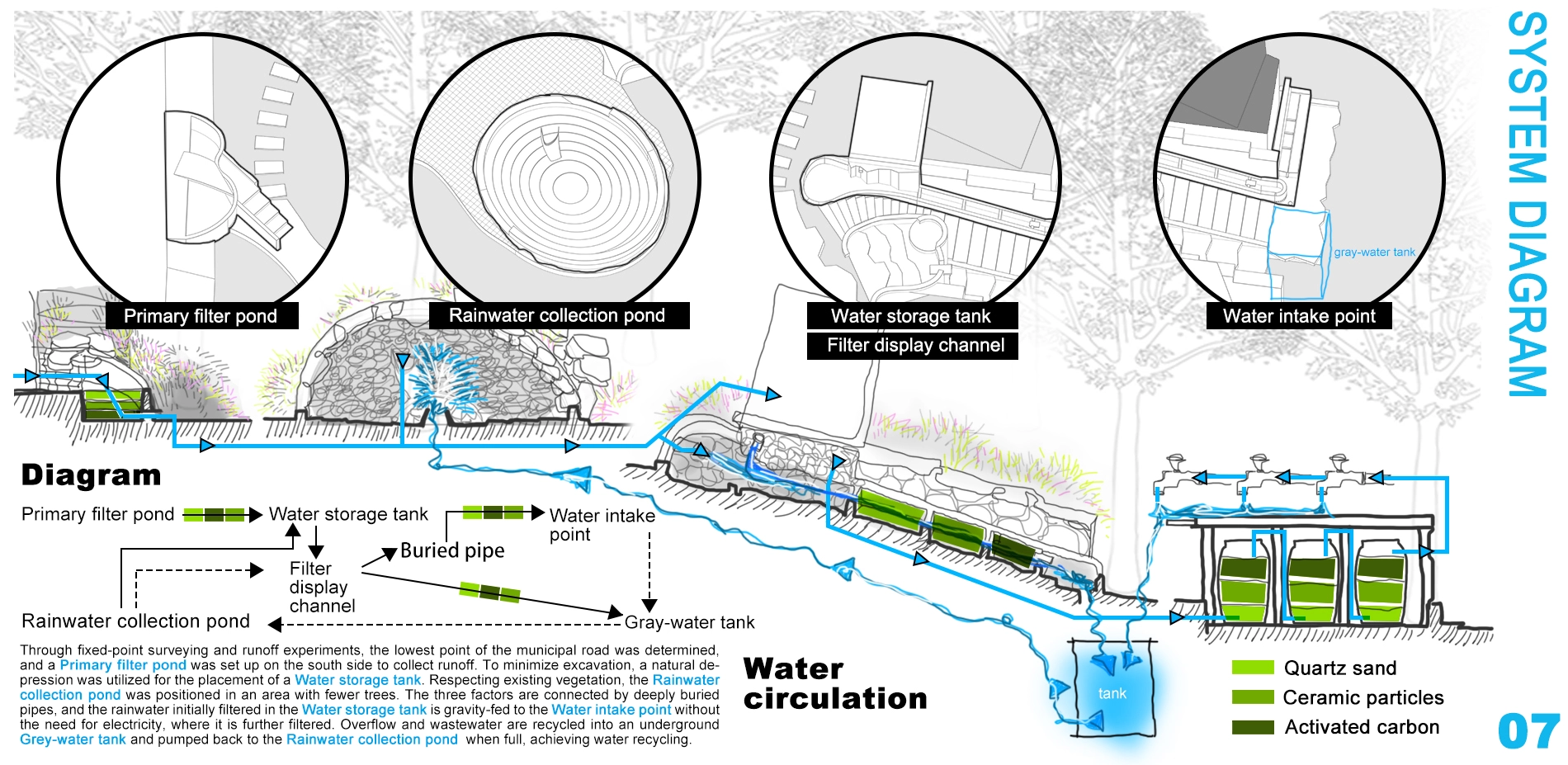 On-site storm tests determined the lowest point of roads. A primary filtration pond on the south side collects runoff. The reservoir's location was determined by natural terrain depression, with rainwater collection pond in open areas. Buried pipes connect them. Terrain elevation creates gravity water pressure, allowing water to flow through a filtration system. Wastewater is collected in an underground gray water tank and pumped back for recycling when full.Ultimately transform soil erosion disasters into water resource benefits.