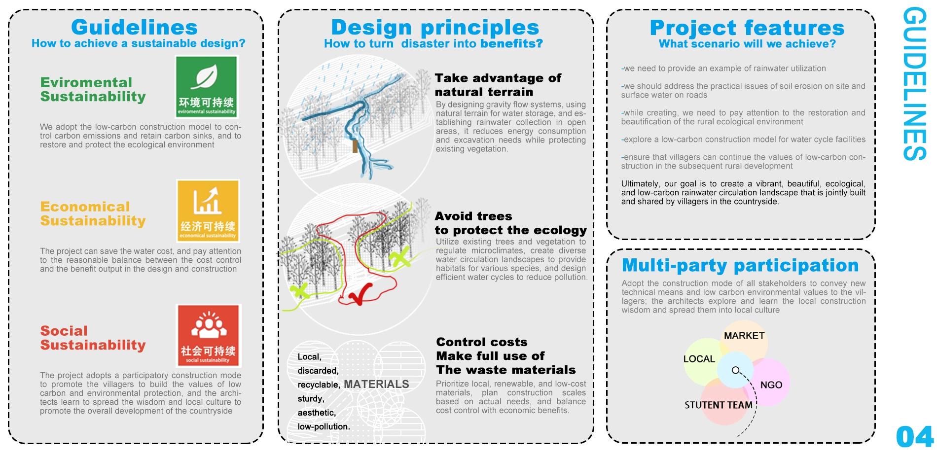 The project follows three principles: environmental, economic, and social sustainability. Design principles include utilizing existing conditions, protecting ecology, controlling costs with recyclable materials, and cooperative construction.