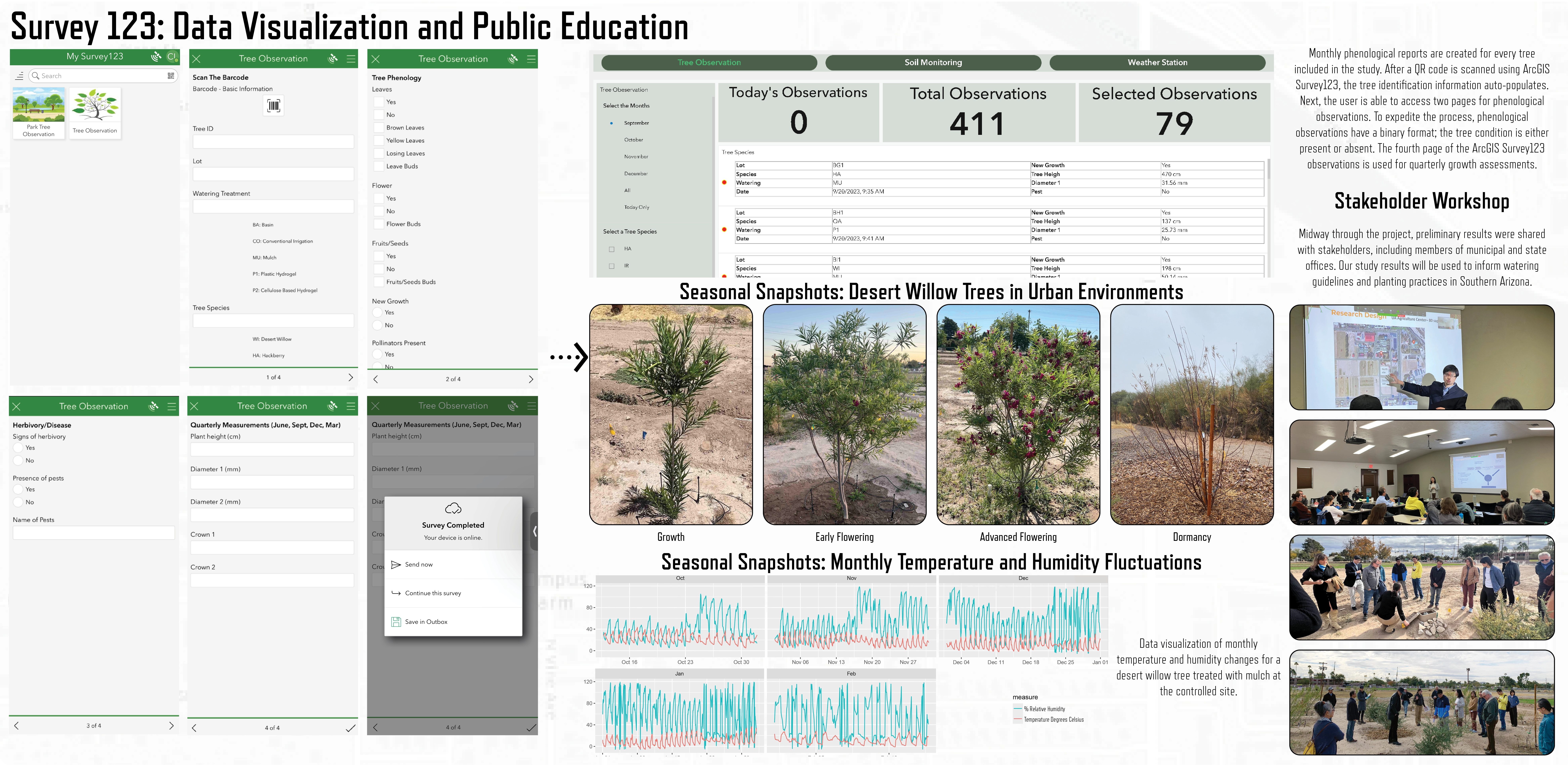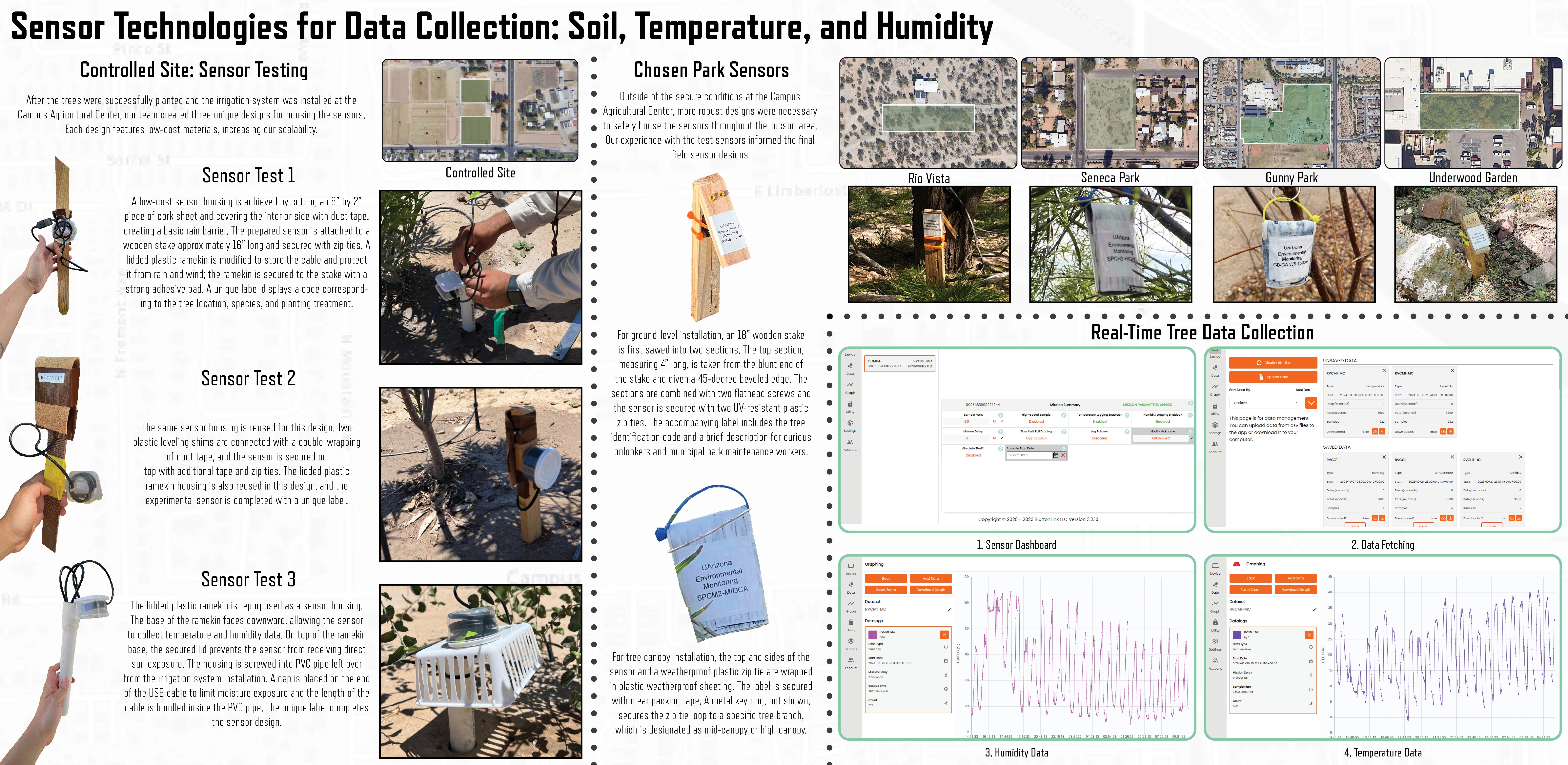 We conducted extensive data collection using above- and below-ground sensors to measure multiple variables: temperature, humidity, soil moisture content, and soil electrical conductivity. Additionally, monthly phenological surveys of each tree were conducted to monitor seasonal changes in appearance.