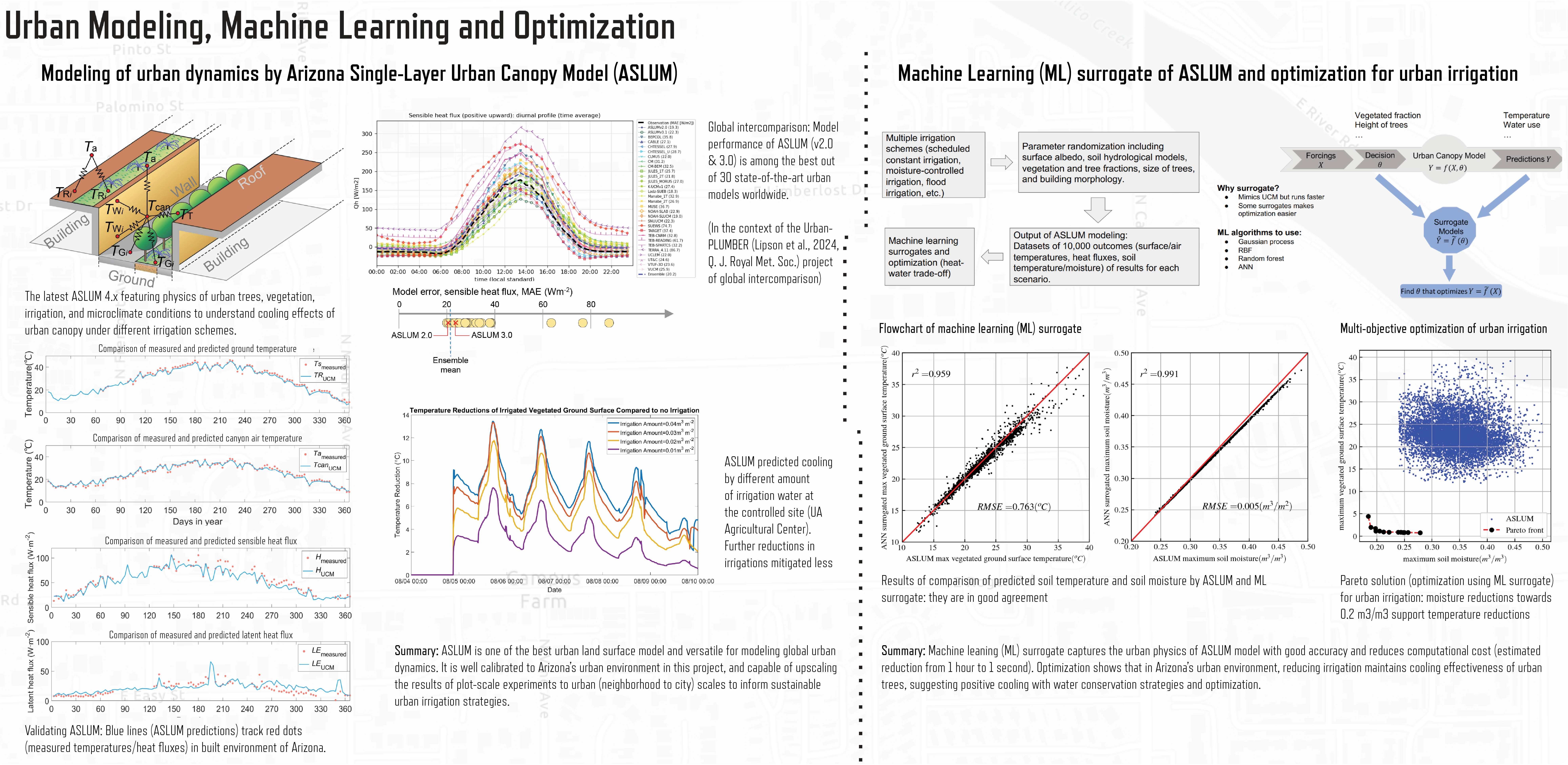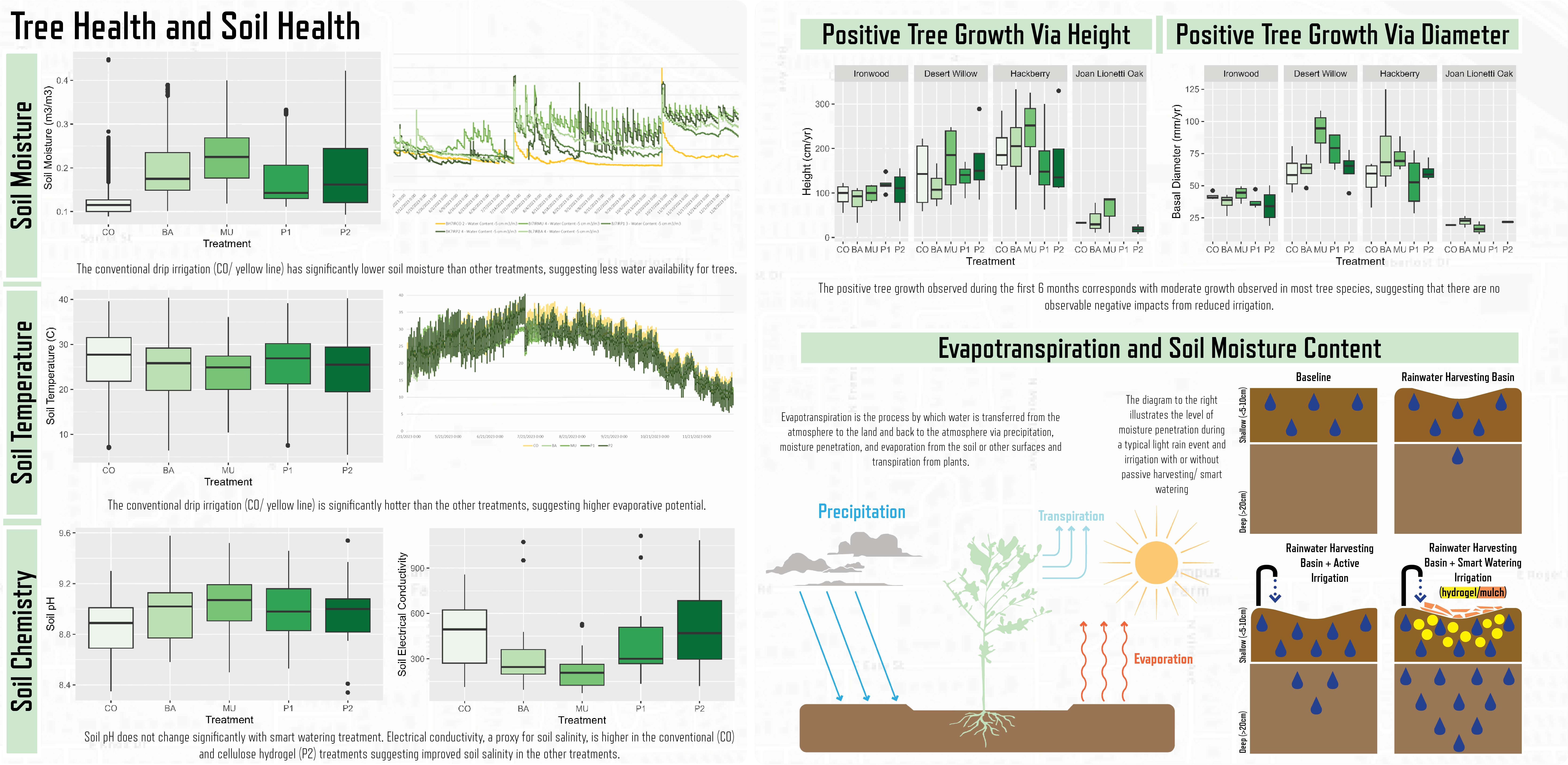 Our project goals were two-fold. First, we identified drought-adapted tree species to test minimal water consumption during establishment. We found that water usage can be reduced by 30-50% during the first year of tree establishment while maintaining positive moderate growth in all species but the Joan Lionetti live oak. Actively working with stakeholders and horticulturalists increased the overall survival rate of trees and resulted in annual savings of 1,700 gallons of water per tree. In addition to correct plant selection for reduced water use, we tested slow water practices to quantify impacts on soil health and tree growth. Our observations show that experimental treatments maintained 22-37% higher soil moisture content compared to conventional drip irrigation planting. While Joan Lionetti live oak had the slowest growth during the 2023 summer growing season, the average growth of the canyon hackberry was 53 cm, which was the most significant change in height of all species. Our results empirically demonstrate that smart watering treatments provide water-saving benefits and mitigate heat within Southern Arizona’s urban environment.