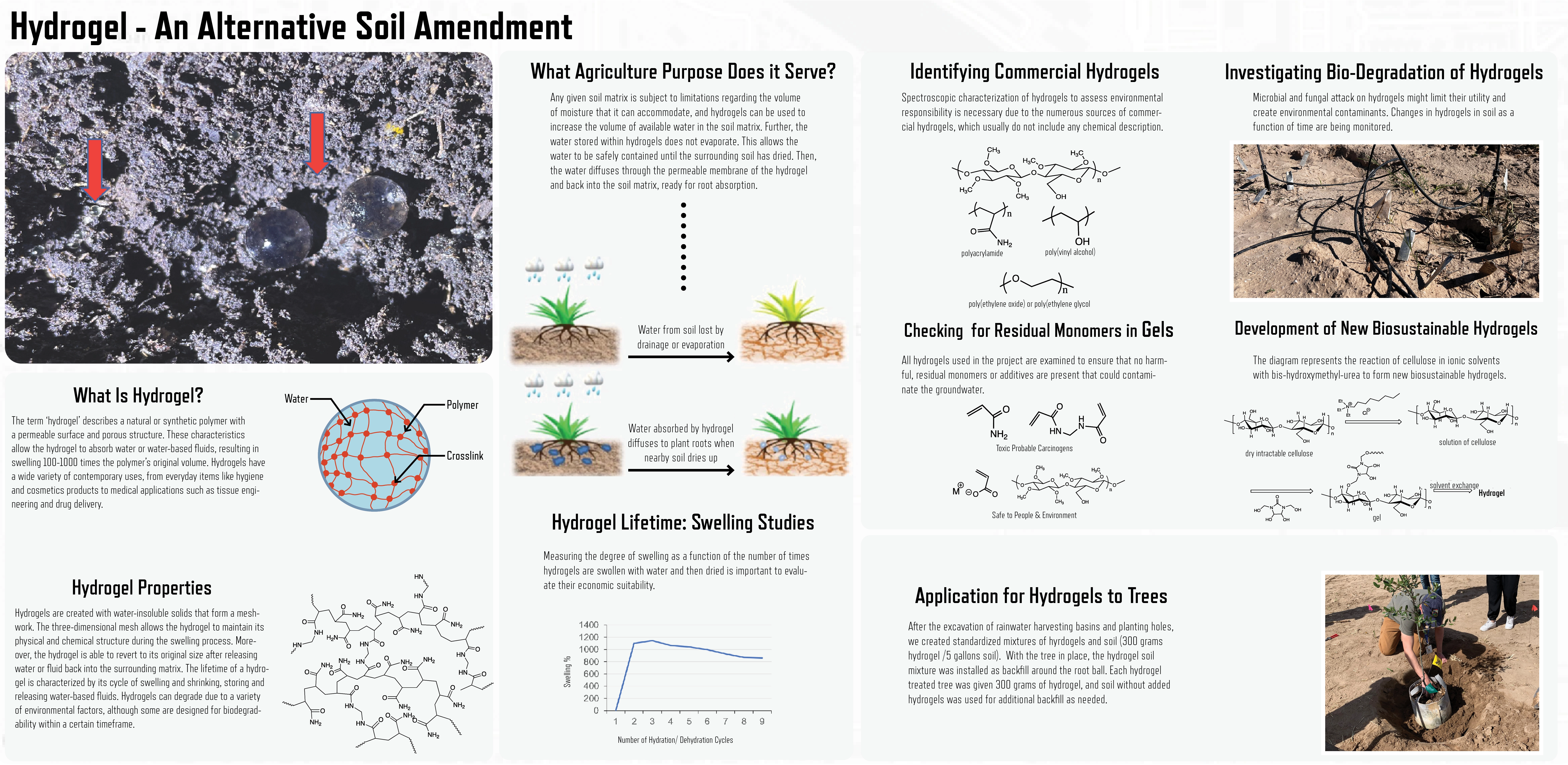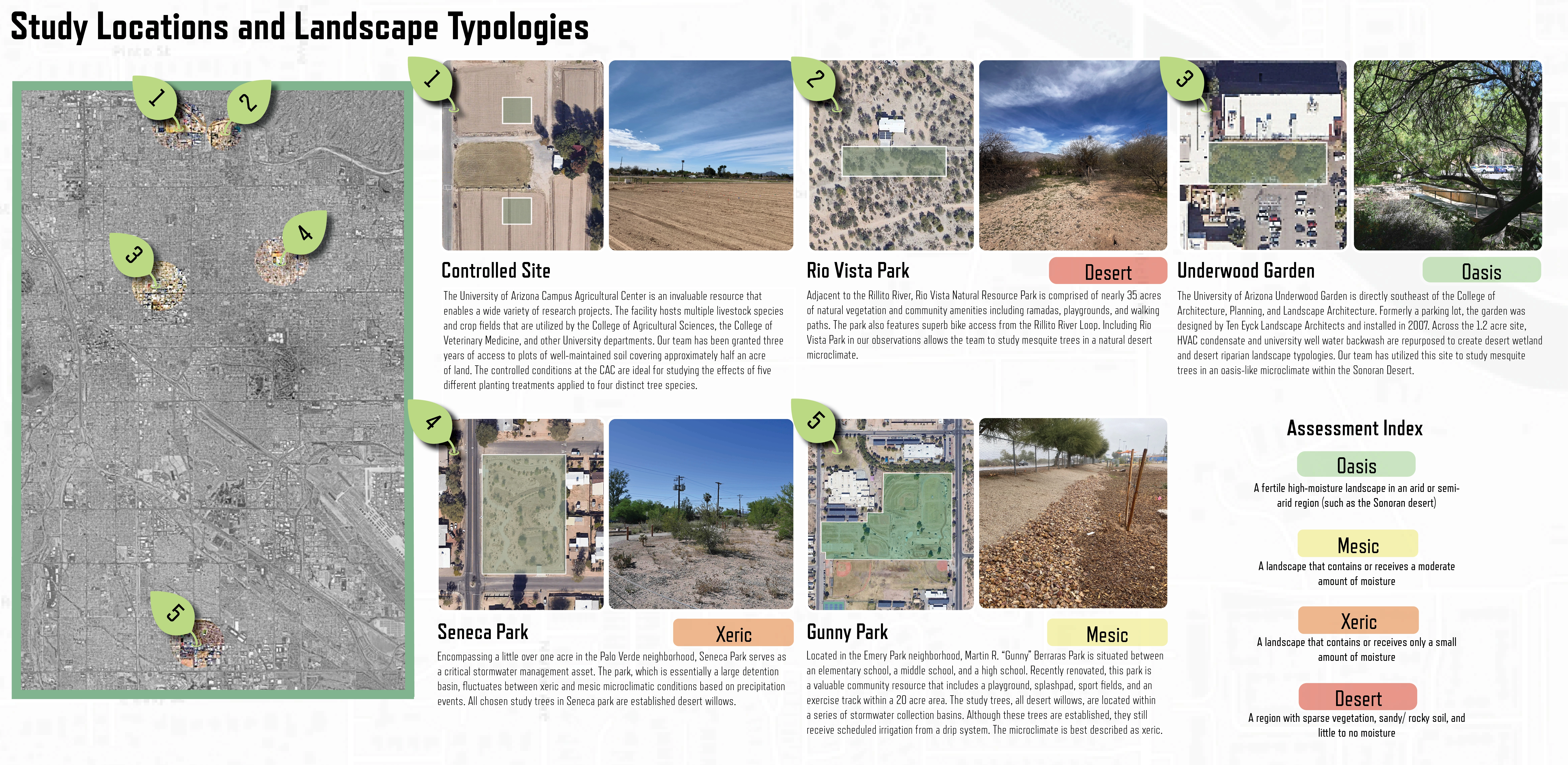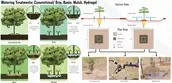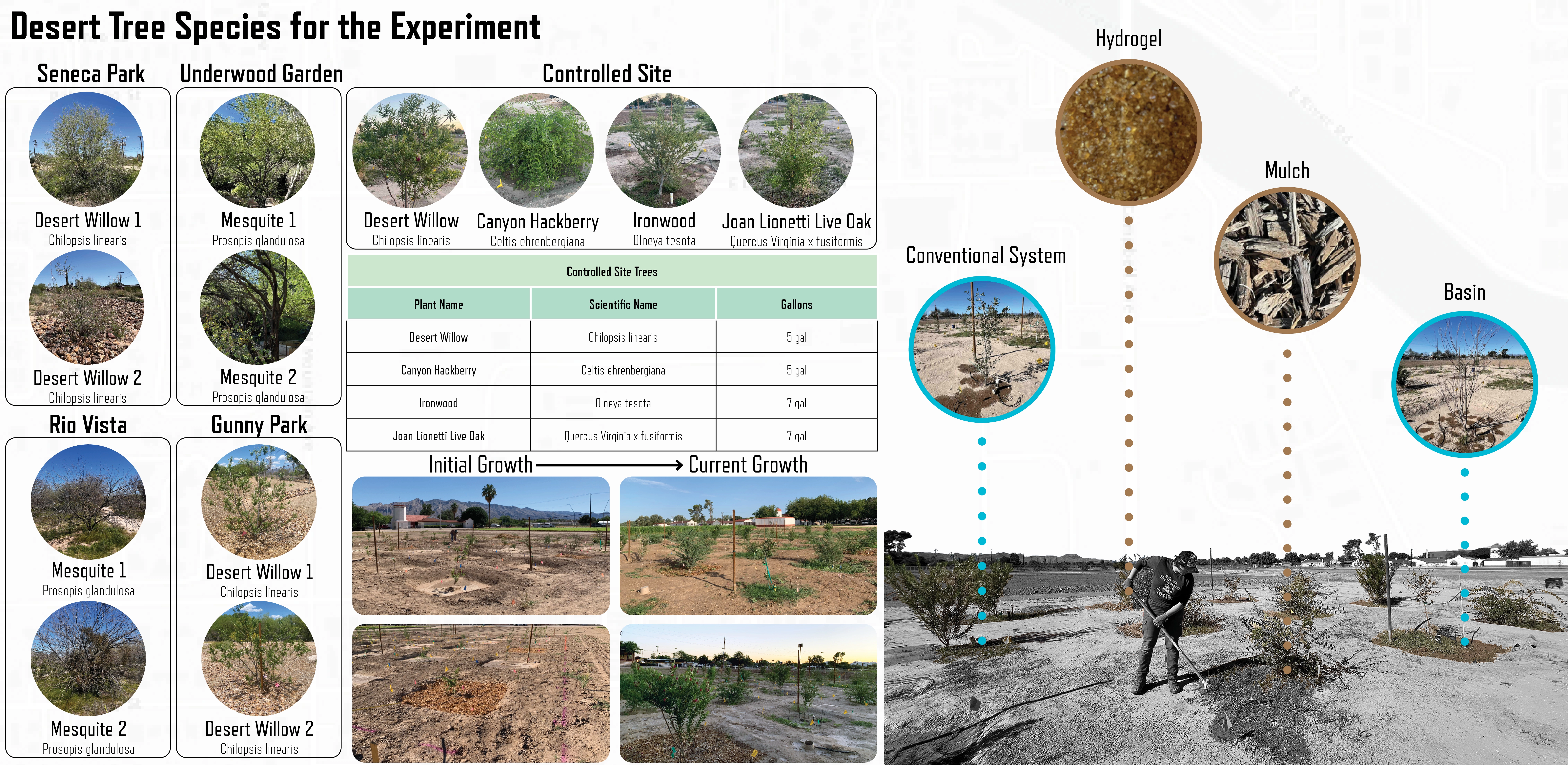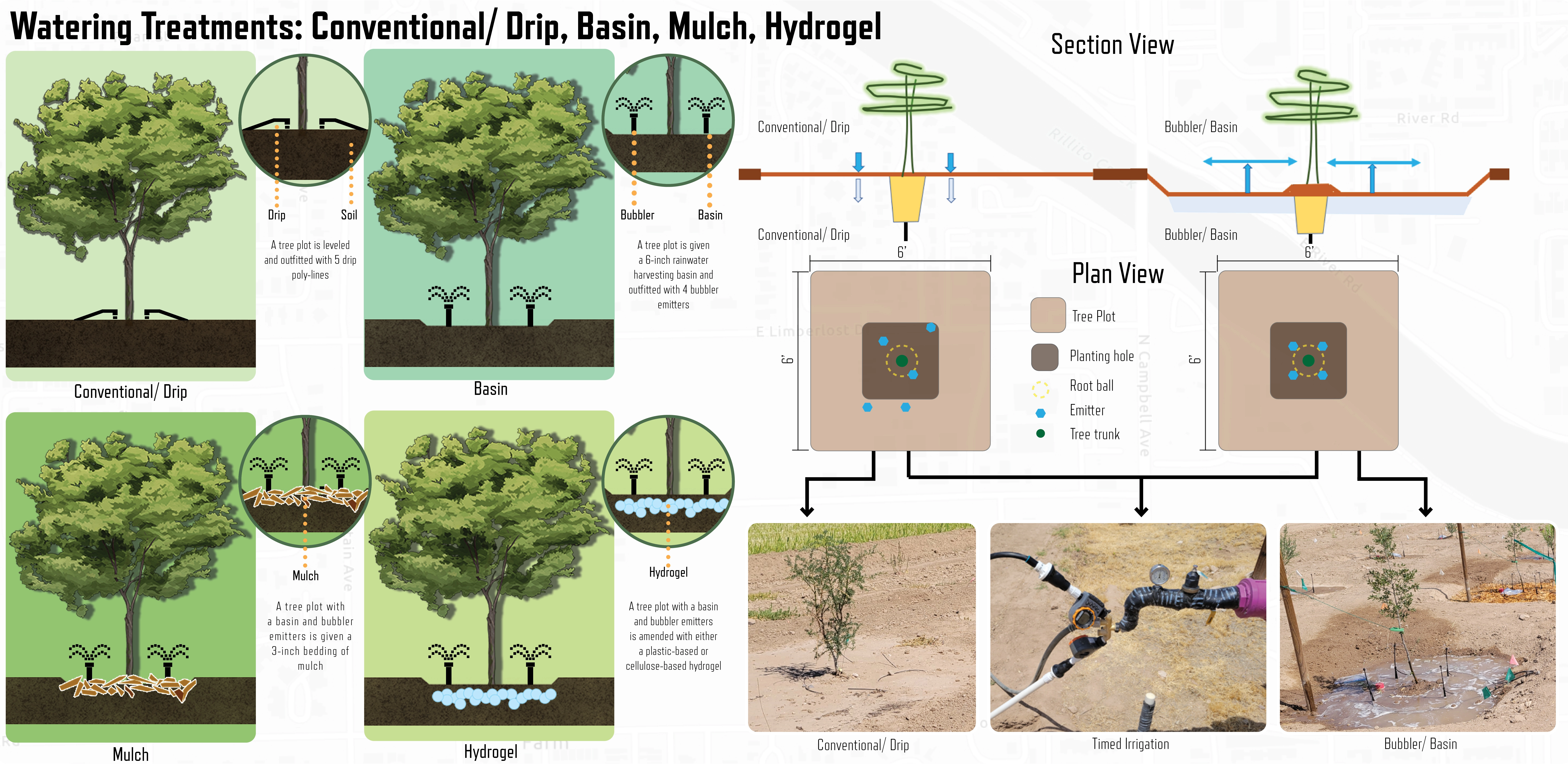 Watering treatments were selected for comparative study against a control (conventional drip irrigation). The selected treatments are 1) rainwater harvesting basin, 2) basin with organic mulch, and 3) basin with plastic-based hydrogel or 4) cellulose-based hydrogel. Experimental treatments received standardized irrigation from bubbler emitters, and five 1-hour drip emitters are used for conventional irrigation. All trees received a total of 5 gallons per irrigation event. The planting treatments represent a range of intensiveness and installation costs, reinforcing the need for scalable strategies applied throughout Southern Arizona.