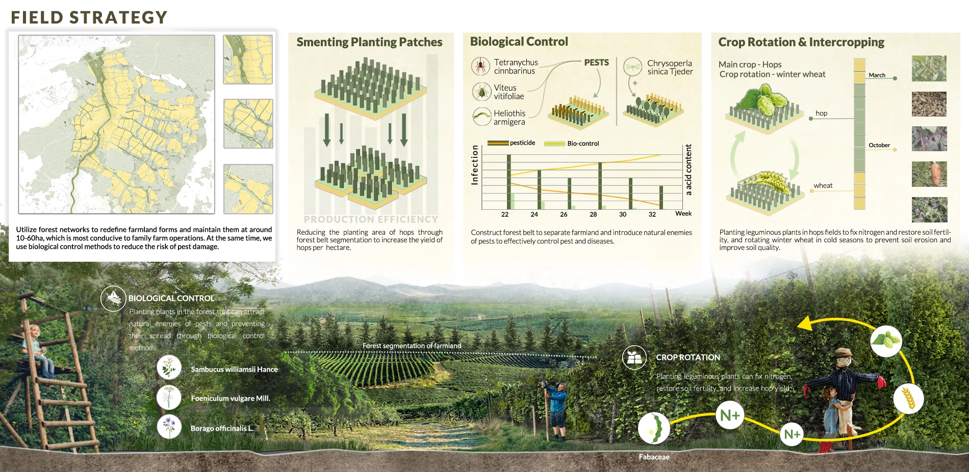 In the Halde region, the predominant model for hop cultivation is family farms, but the vast expanse of hop fields has become burdensome for numerous farmers. Therefore, based on literature research and practical reports, we have utilized forest networks to reconfigure the layout of agricultural land, keeping it within the range of 10-60 hectares, which is most conducive to the operation of family farms. Additionally, employing biological control methods, we have introduced predators of the red spider mite, such as lacewings, and planted food source plants like Chinese wolfberry and blue lettuce at the boundaries of the fields. This will effectively block the spread of pests, thereby reducing the risk of infestation.