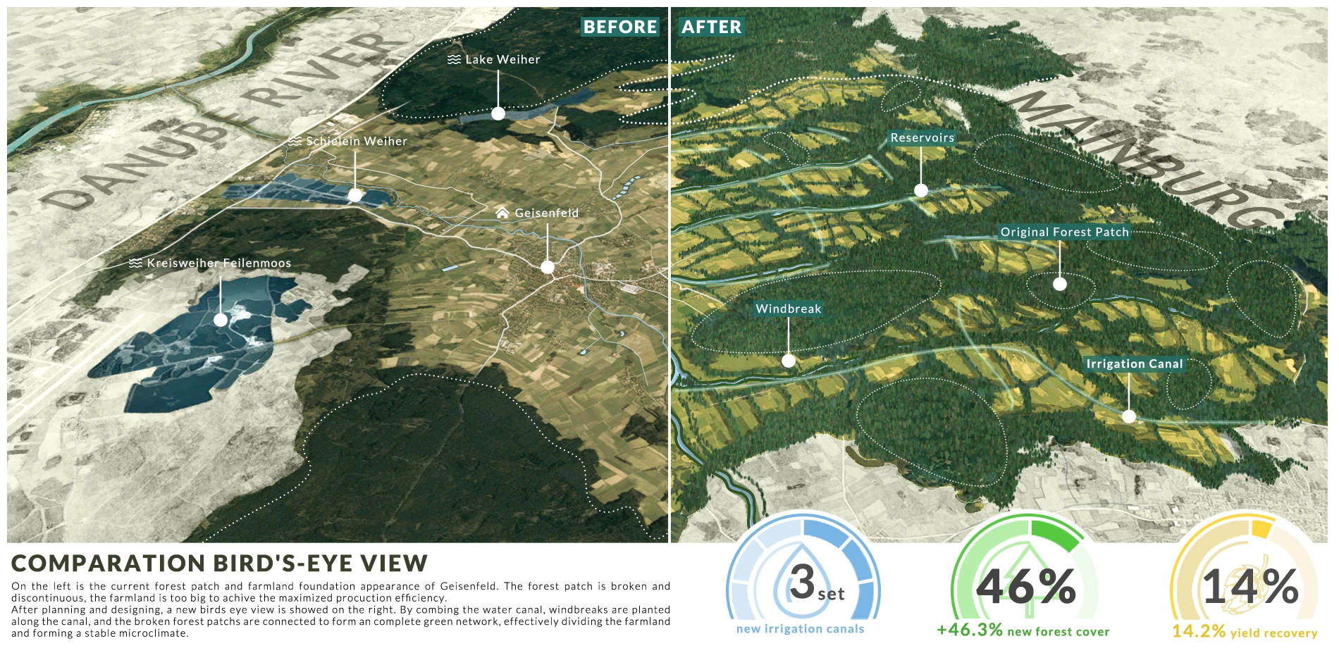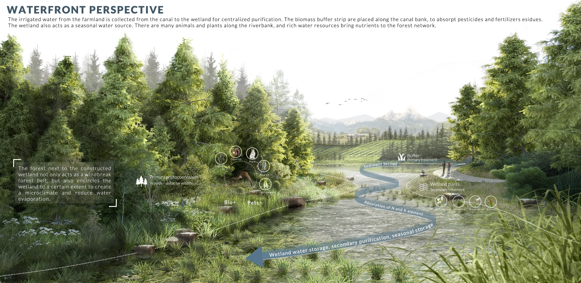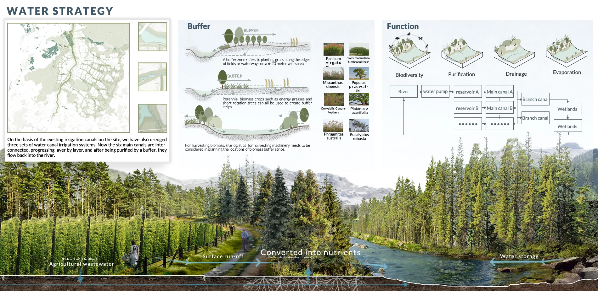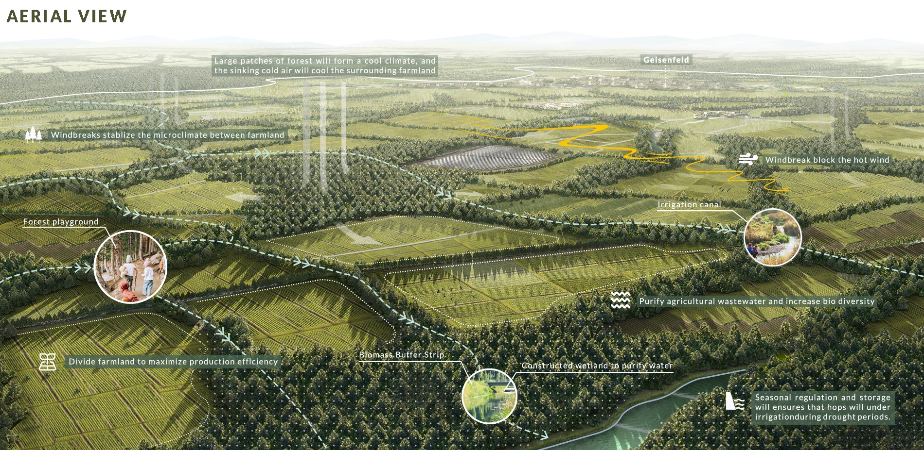 Hops have high irrigation requirements, and climate change-induced factors like uneven summer rainfall and reduced winter snowfall, leading to decreased meltwater, make hops irrigation a significant challenge. The existing six simple irrigation channels around Geisenfeld have very low coverage, making it difficult to manage water resources and posing a high risk of drought and flooding for hops production. The project aims to plan a comprehensive water network that meets the needs of hops production while reducing agricultural pollution and improving the living environment. The water network includes main channels, branch channels, and storage ponds. Ecological buffer zones and purification wetlands are set up along the network to remove residues from agricultural wastewater, ensuring a mutually beneficial coexistence between agricultural production and the ecological environment.