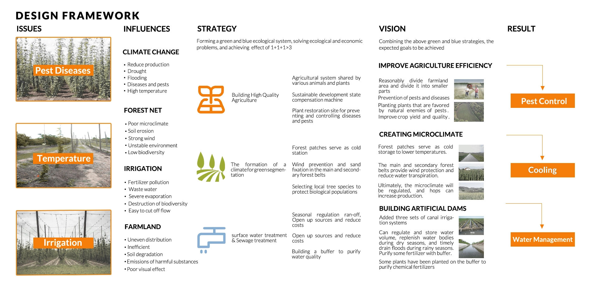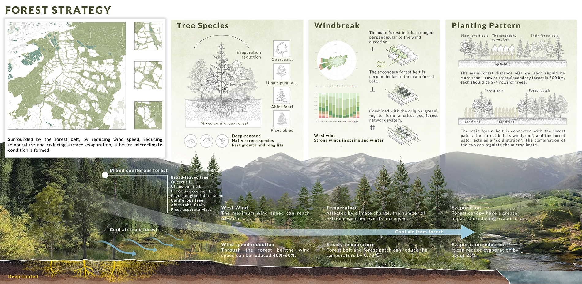 Guided by principles of sustainability, we propose landscape strategies aimed at preserving the hops industry chain. This involves restructuring forest and windbreak systems, establishing more extensive irrigation systems, redesigning farmland for increased production efficiency, and fostering a virtuous cycle of hops production and ecological restoration.G