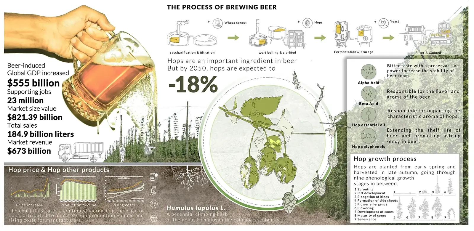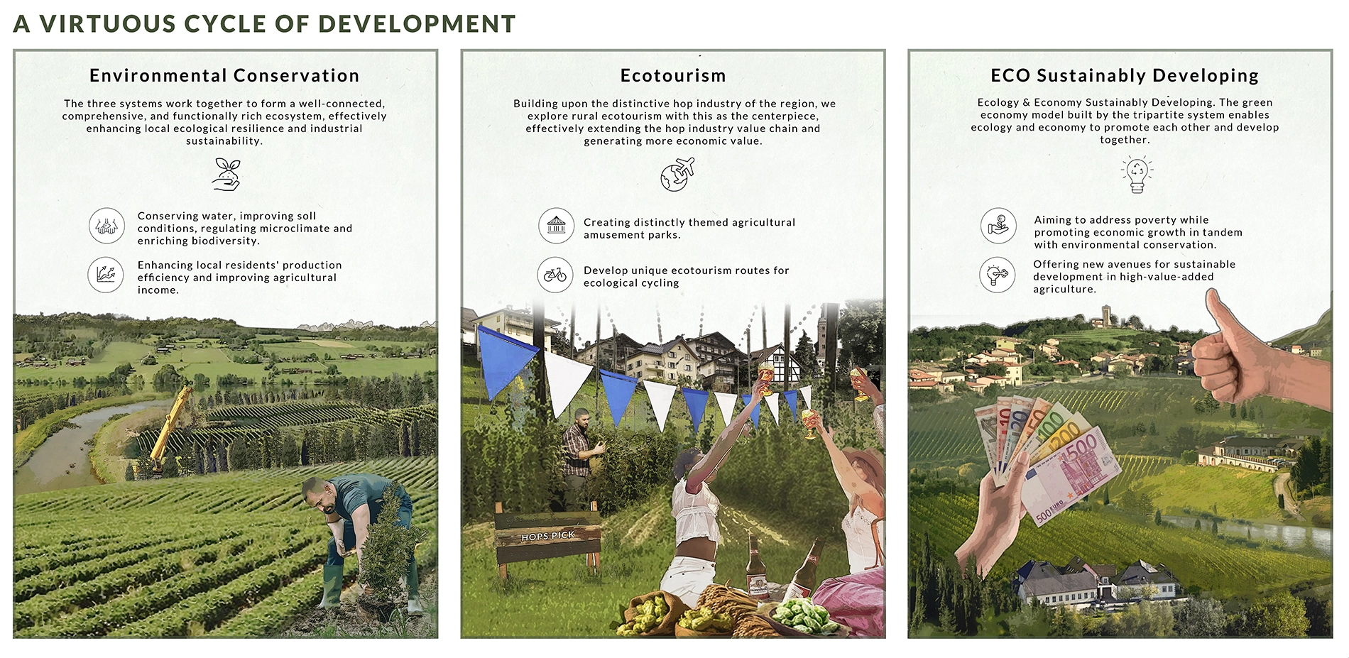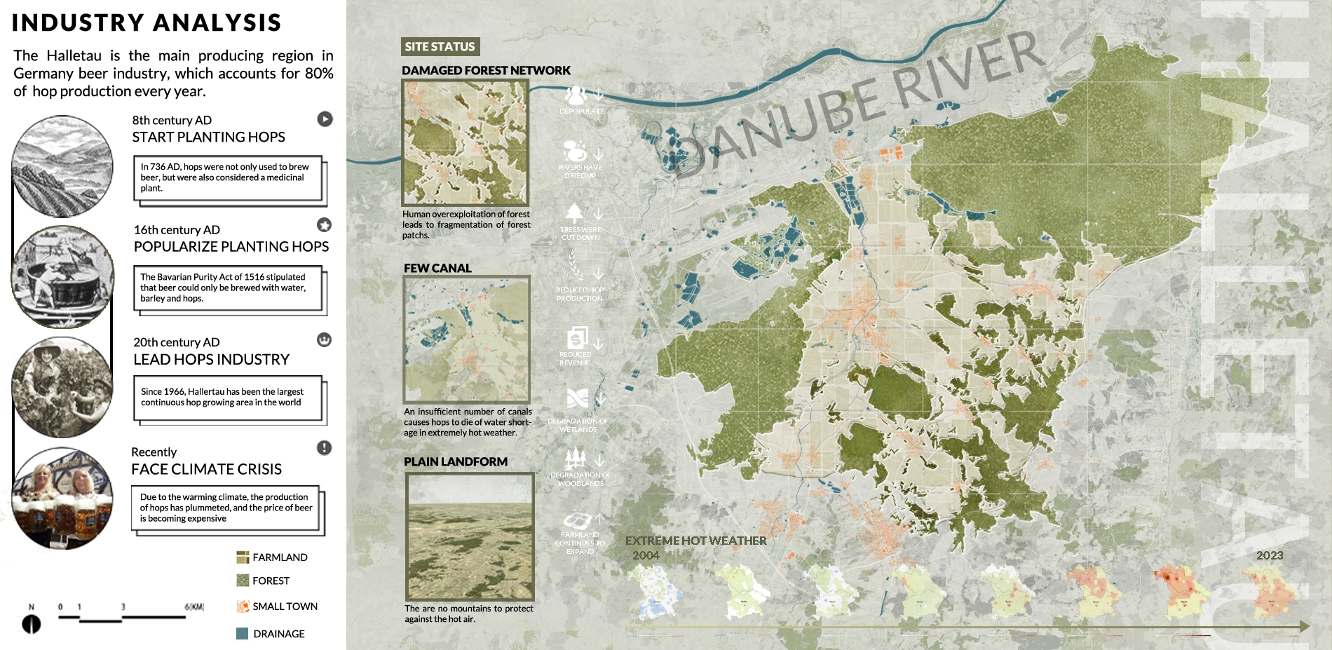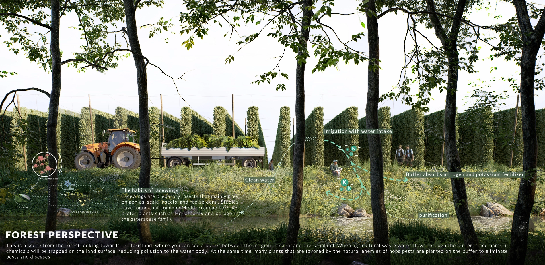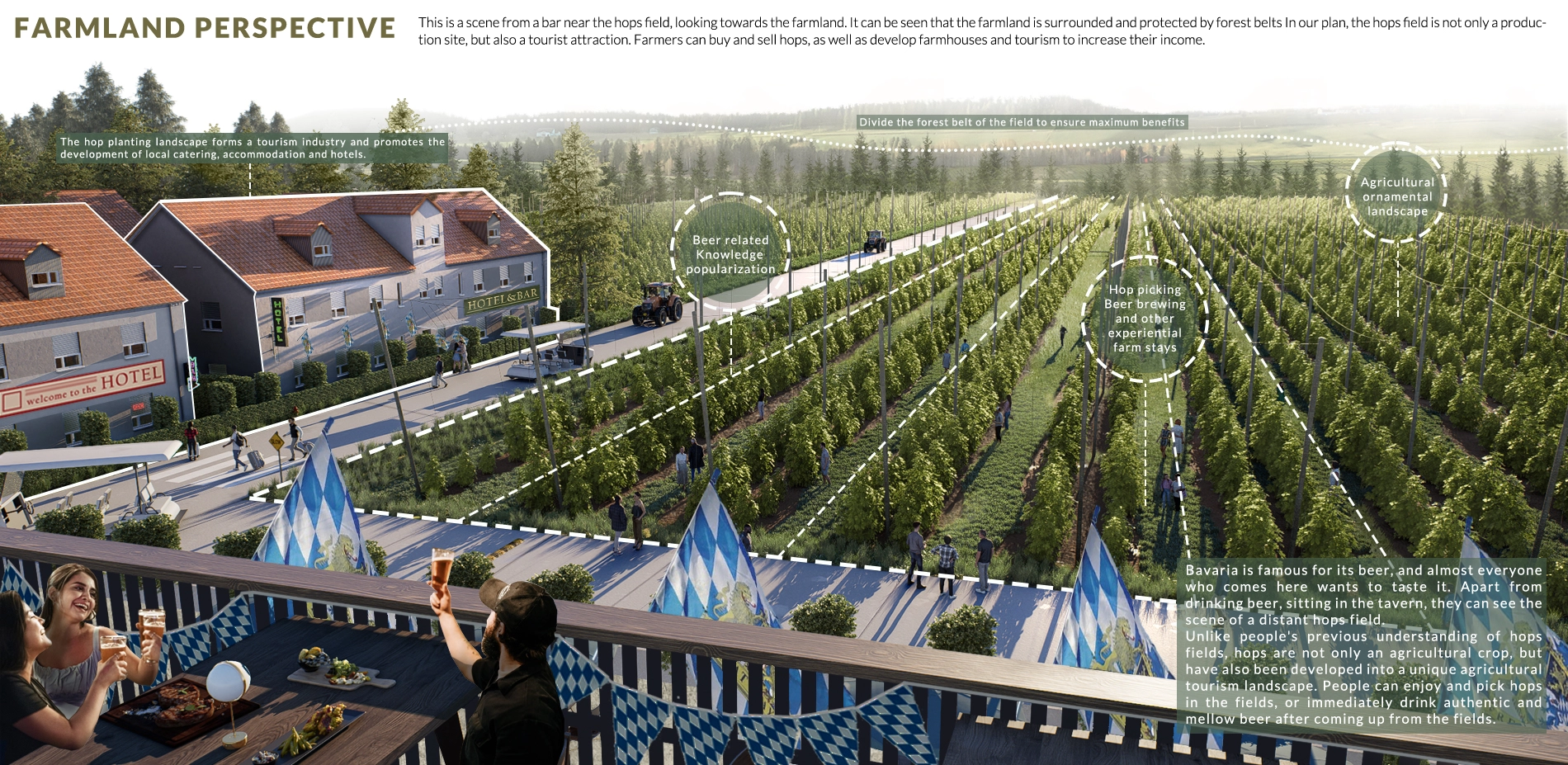 We have selected the Gaizenfeld region within the production area as the project site and proposed landscape strategies aimed at preserving the hops industry chain to foster a virtuous cycle of hops production and ecological restoration.
