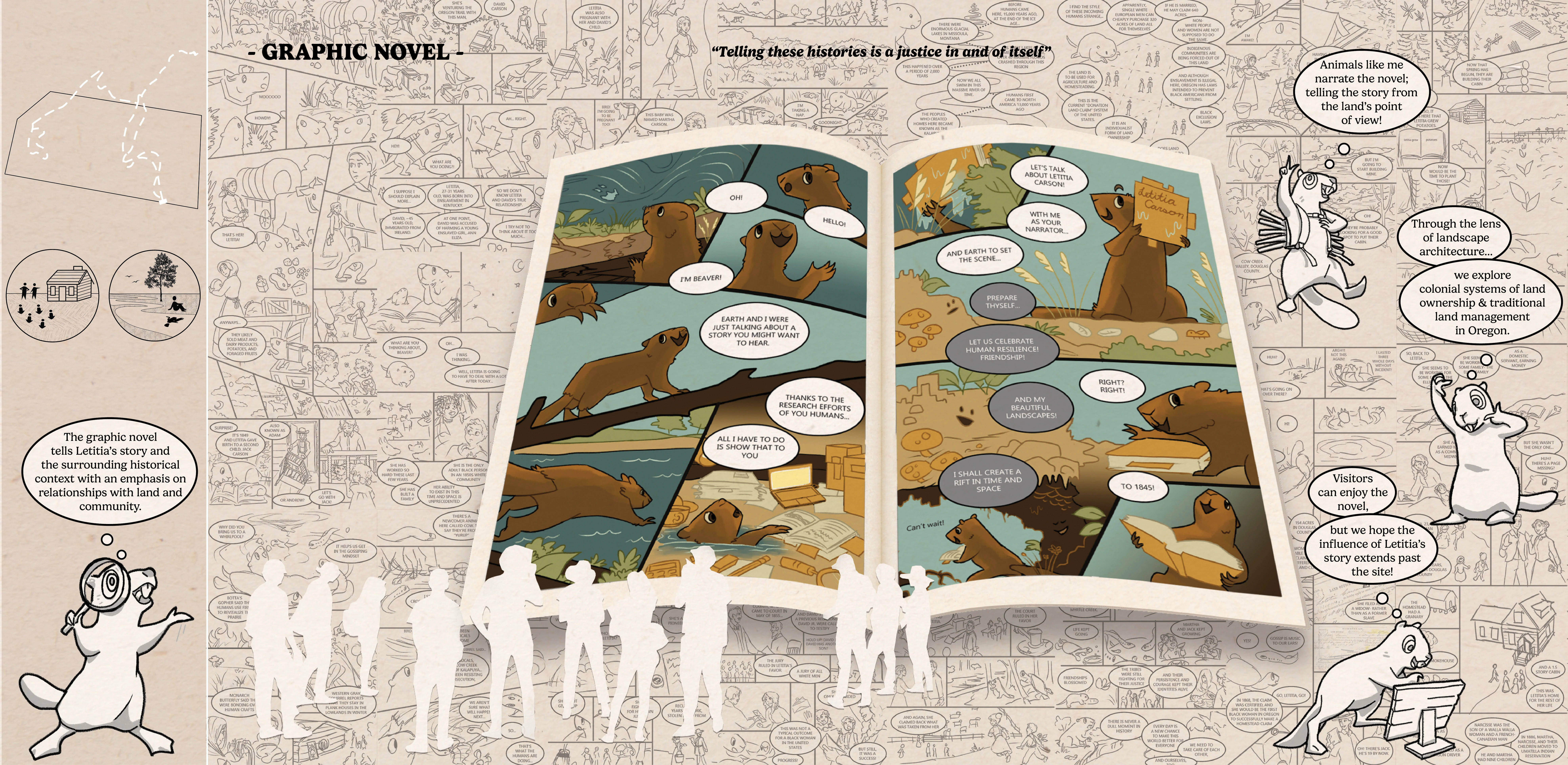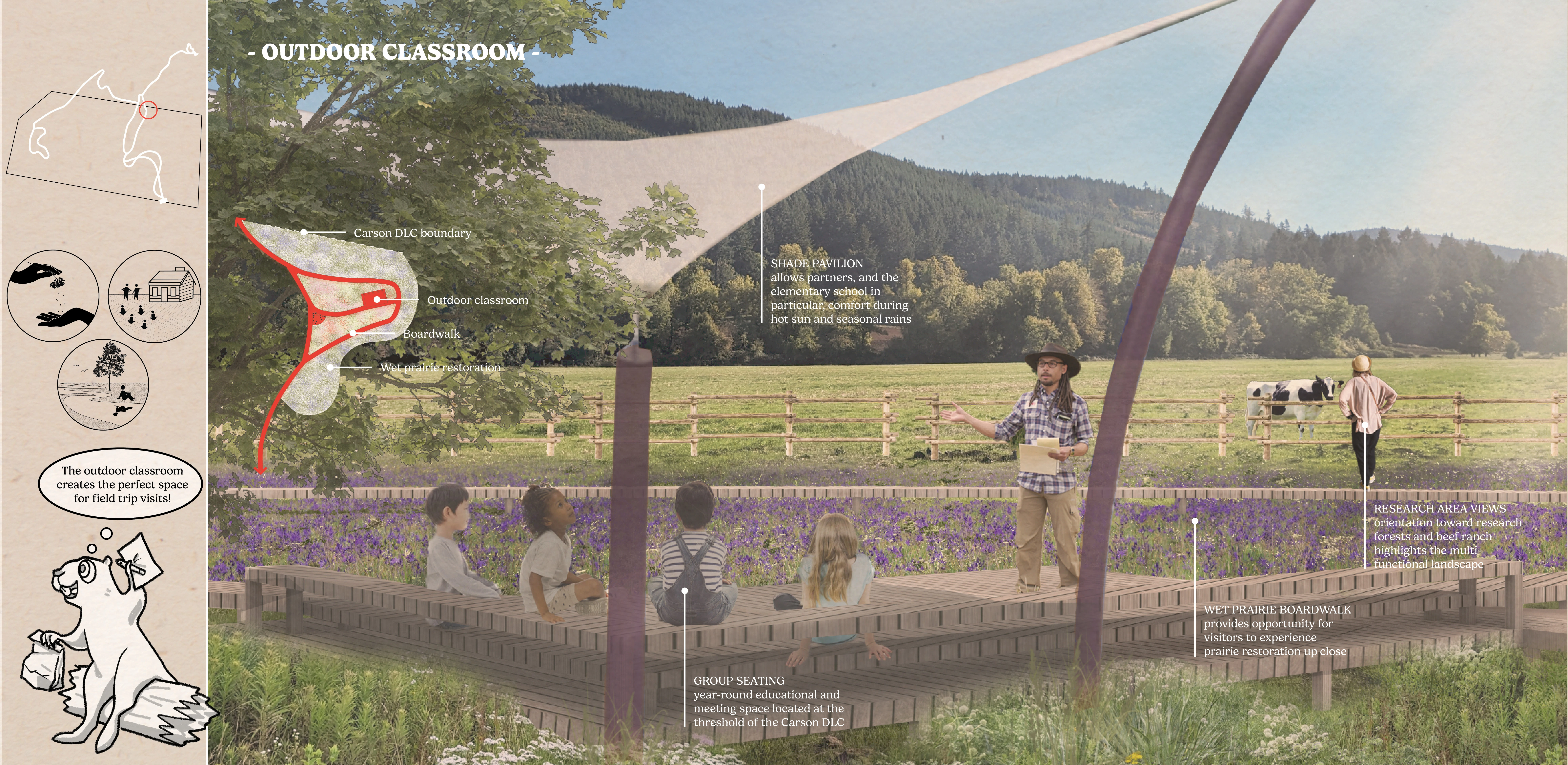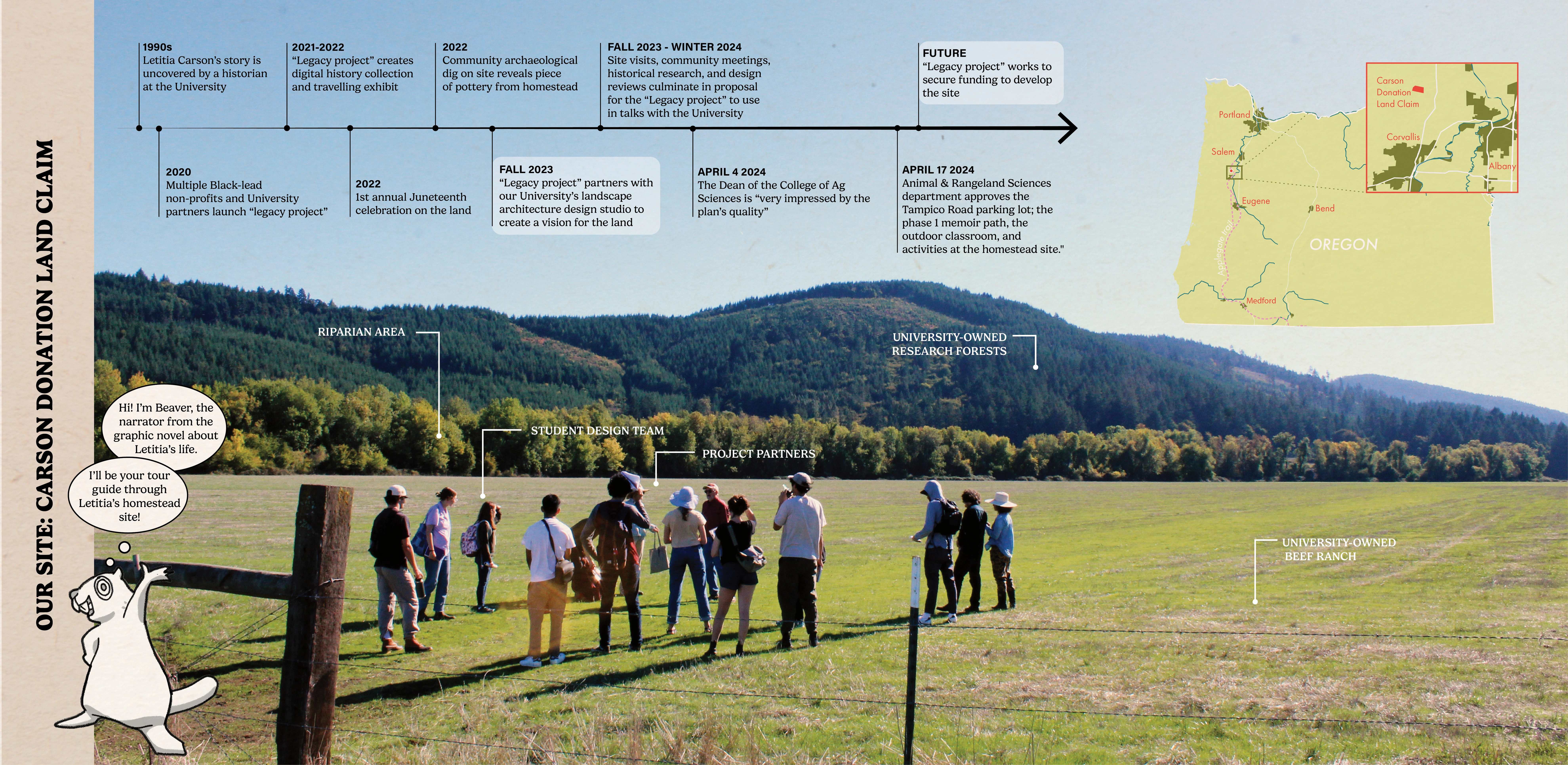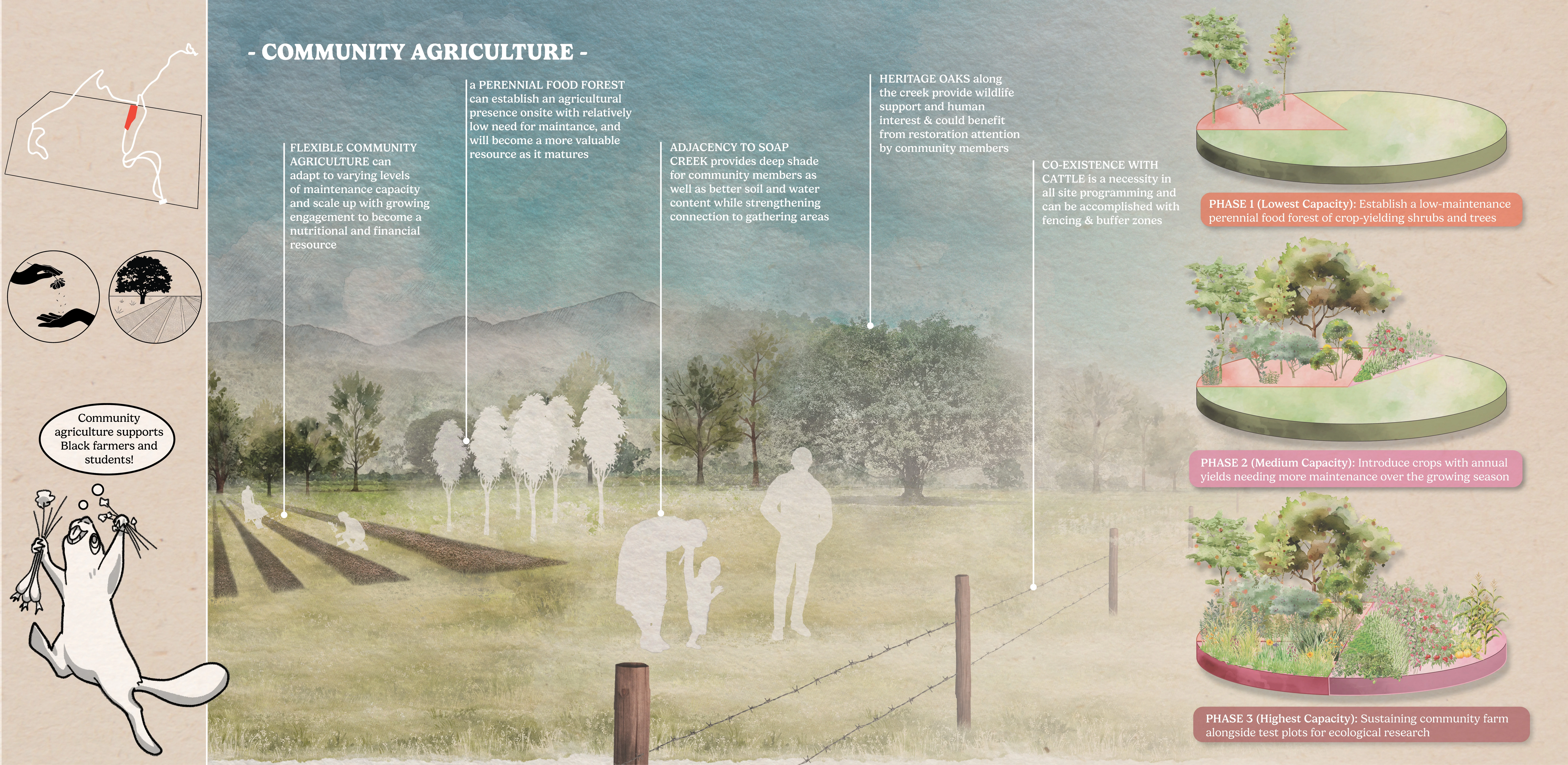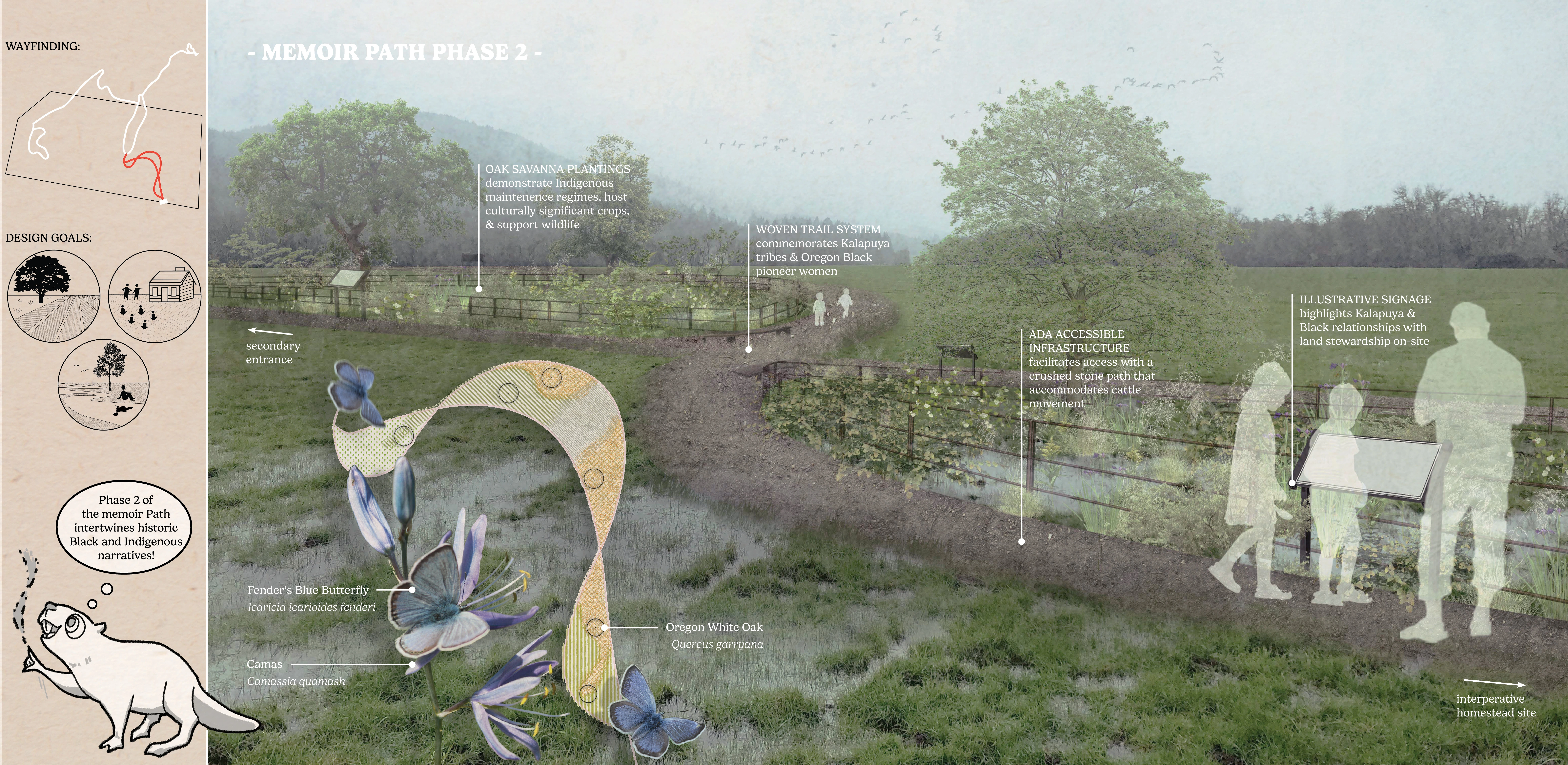 Letitia Carson’s Legacy utilizes the skills of landscape design to uplift several community organizations dedicated to honoring Letitia Carson, one of the first Black homesteaders in Oregon. This conceptual design made tangible the visions of our partners through the process of building authentic relationships and finding common ground through land stewardship. The final booklet has already been used to begin fundraising efforts, support grant applications, and gain approval to begin construction on Phase One. This studio addresses many challenging concepts, including the delicacy of telling a history embedded in narratives of race, gender, displacement, and colonialism, all while supporting current agricultural land use.