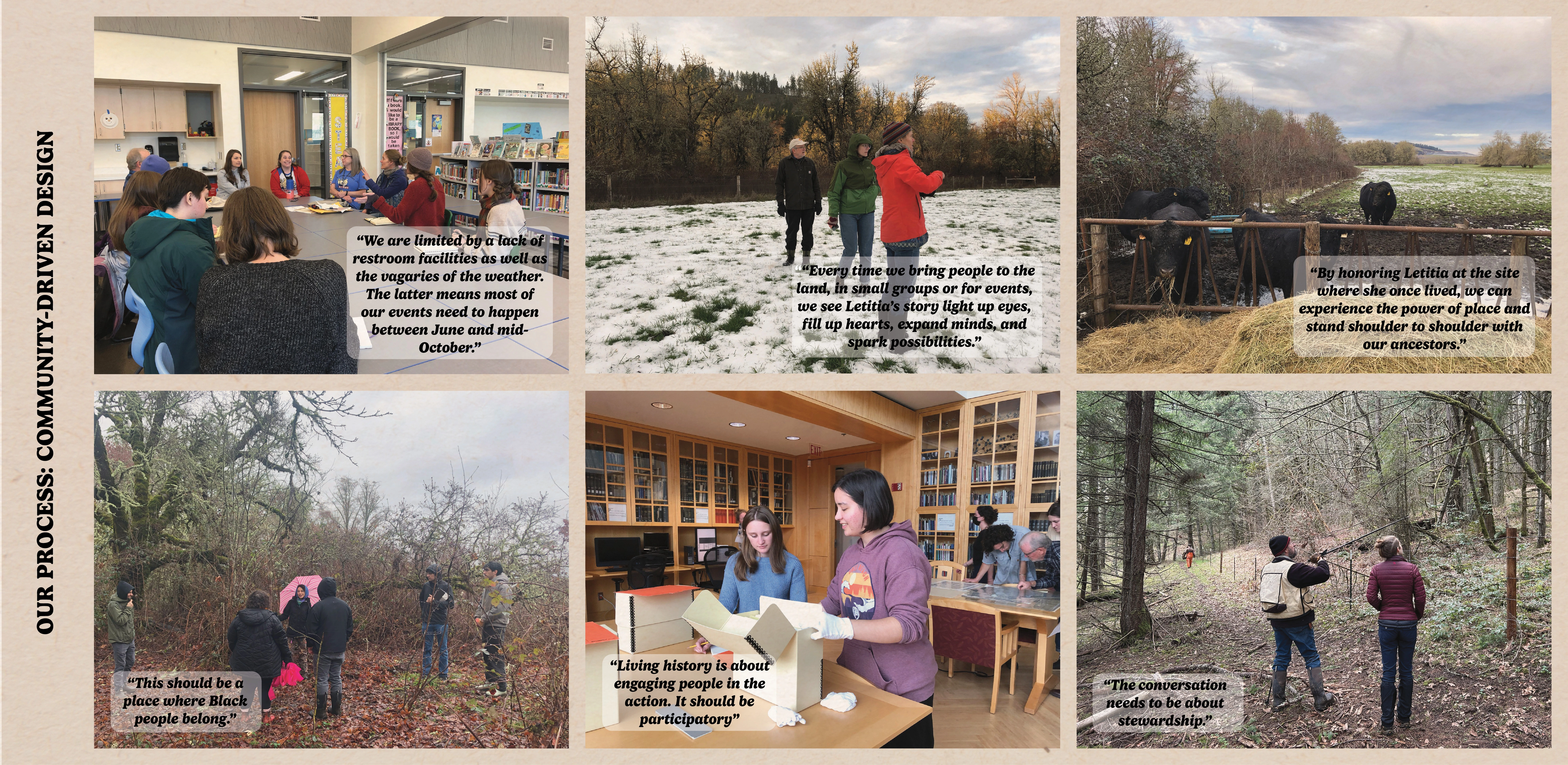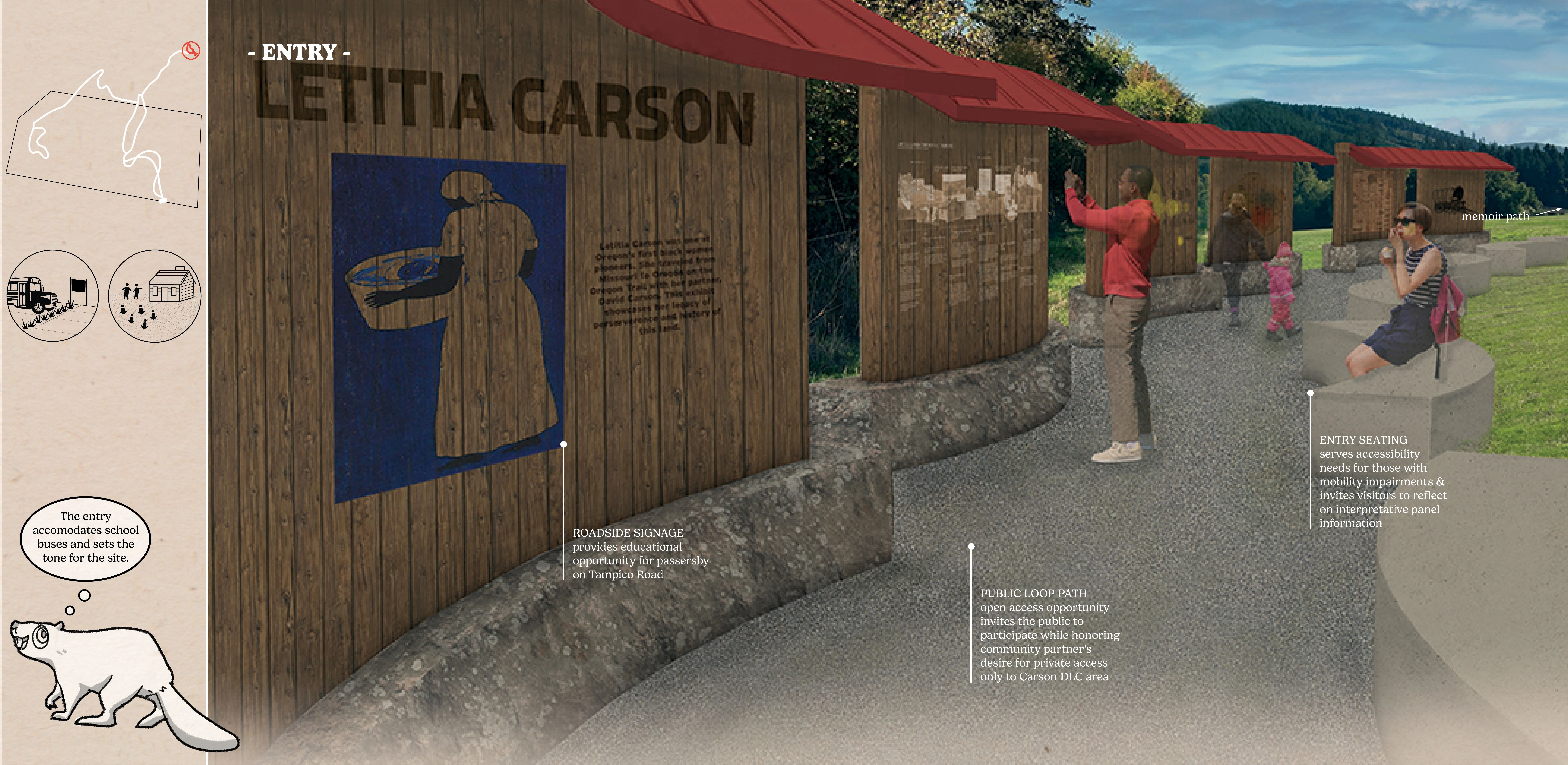 Our design proposal seeks to provide opportunities for Black and Indigenous community members, students, and allies to engage with Letitia’s land. This site could be the only place in the rural West for people to learn about Black pioneer history on the same land it happened on. This flexible space aims to provide opportunities for reflection, connect Black and Indigenous community members across generations, and raise awareness about Letitia’s story through place-based historical education.