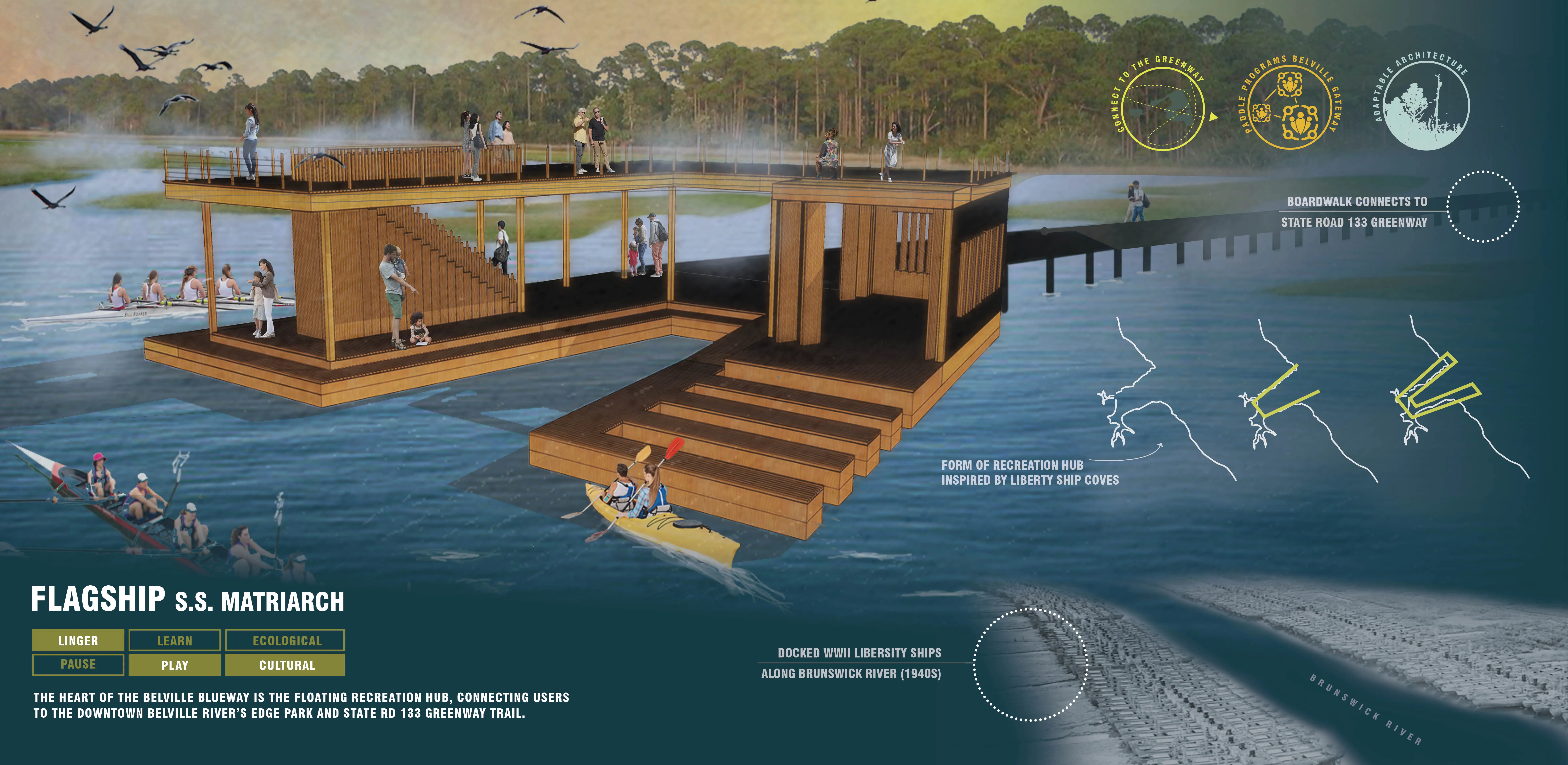 Located at the edge of the Brunswick River Channel, the Flagship Mobility Hub serves as an offshore gateway into downtown Belville’s River’s Edge Park. Connected to the town by the park’s boardwalk, this hub offers panoramic views of downtown Belville, the marshland, and the river. The Flagship hosts paddle programs, provides docking and storage, and creates waterfront spaces for community events.
