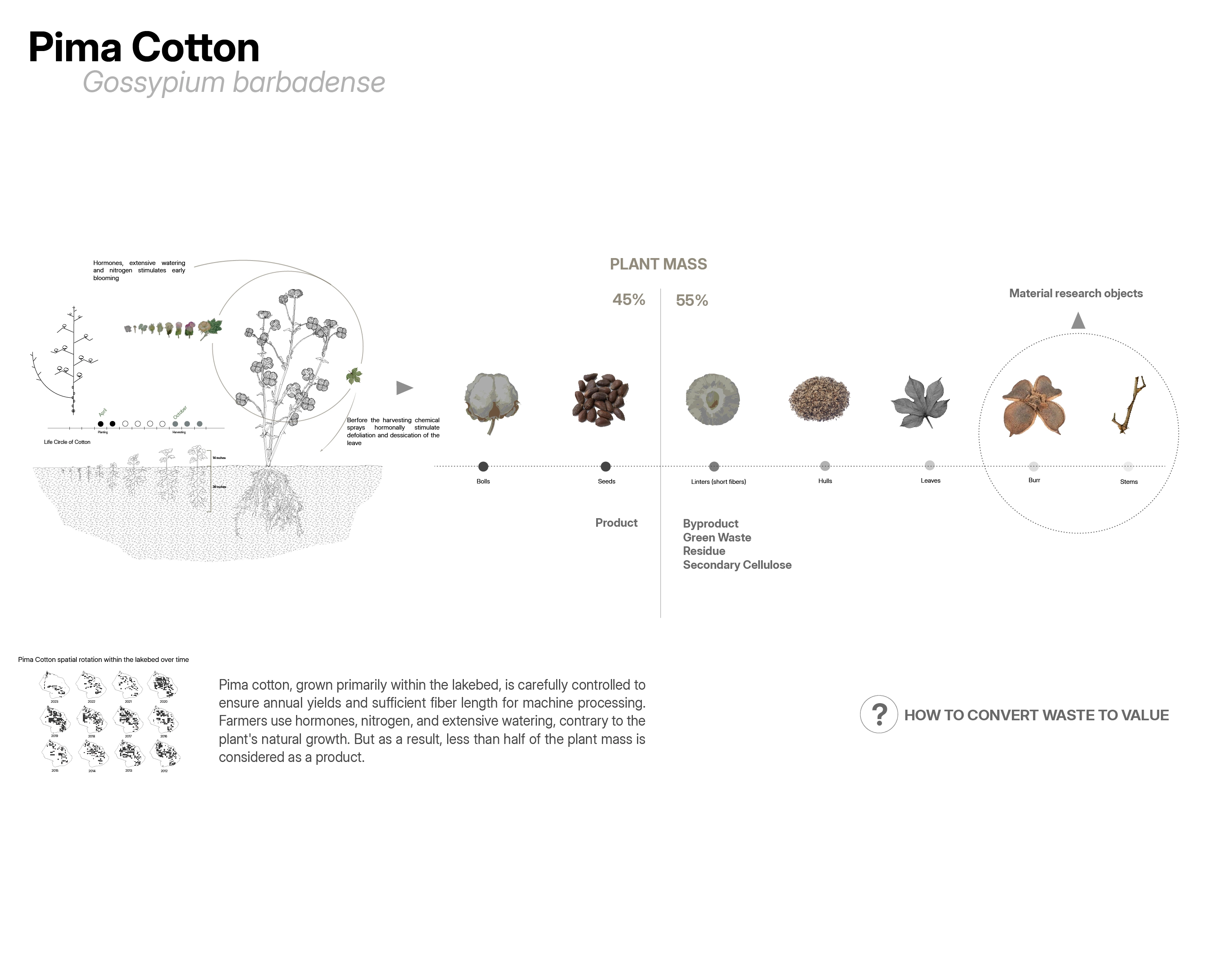 Pima Cotton, mostly grown within the lakebed, is under strict control to ensure annual yields and long fibers essential for machine processing. However, this process results in less than half of the plant mass being usable, with the rest considered as byproducts or green waste.