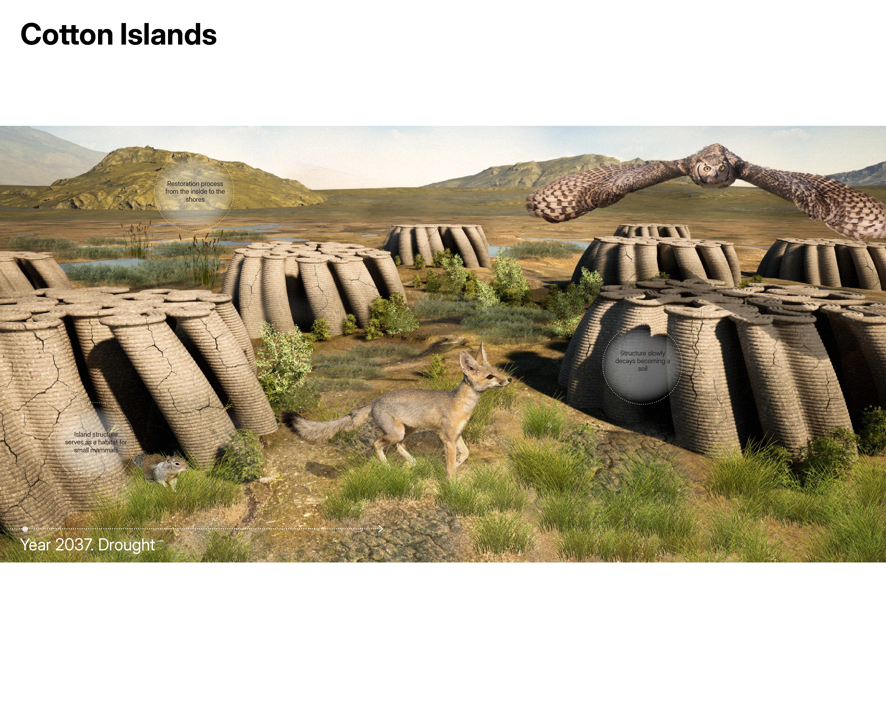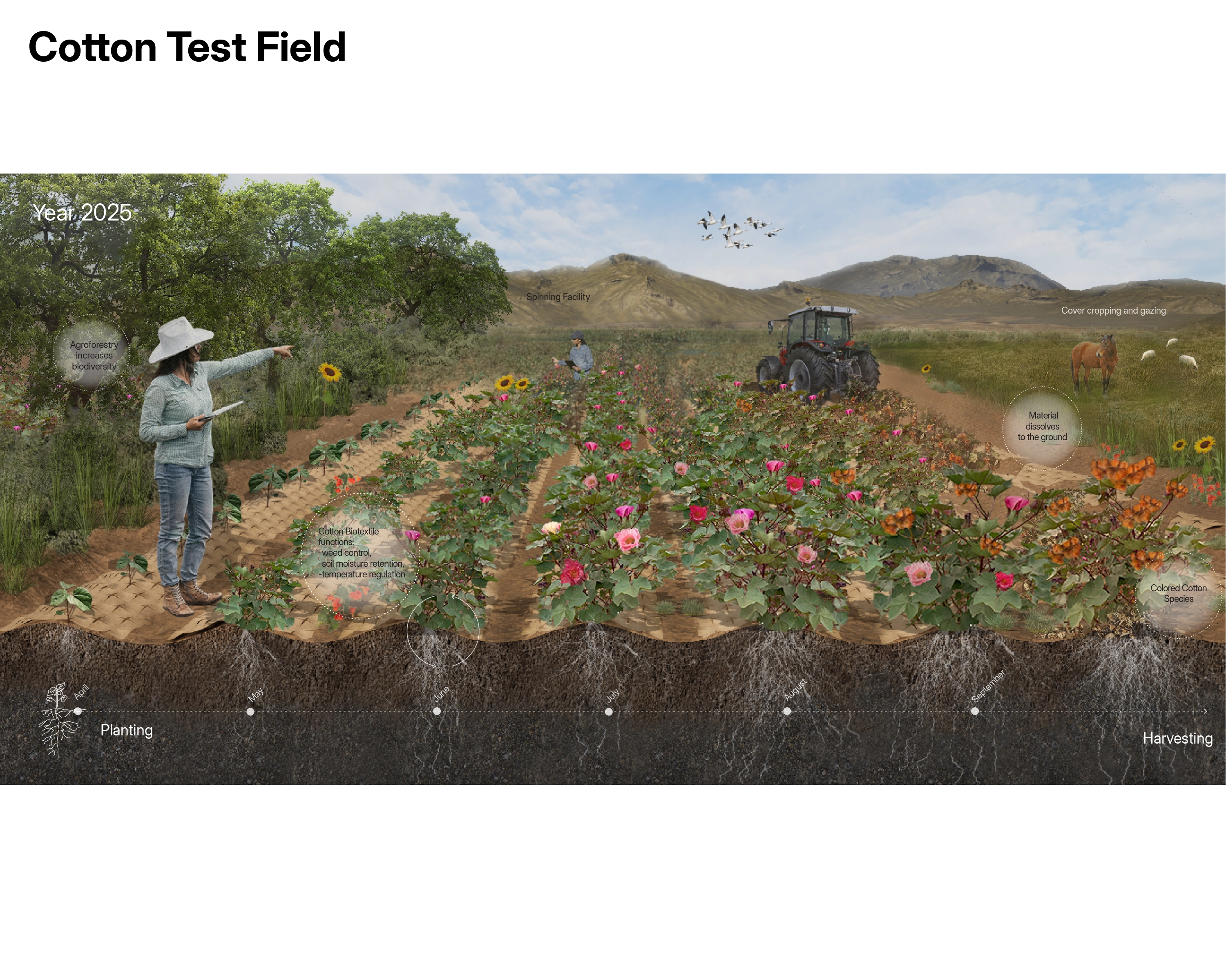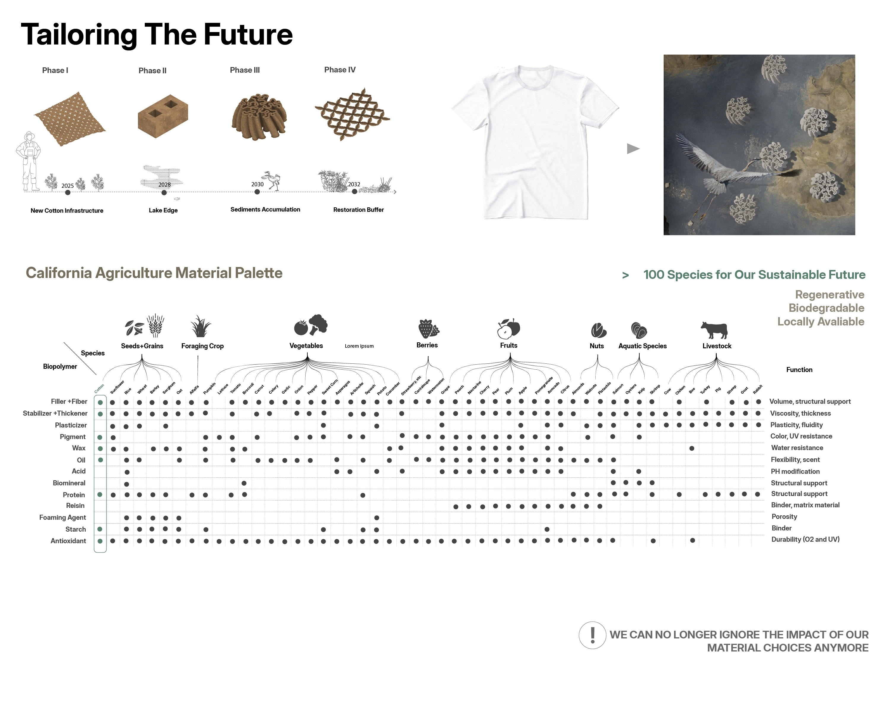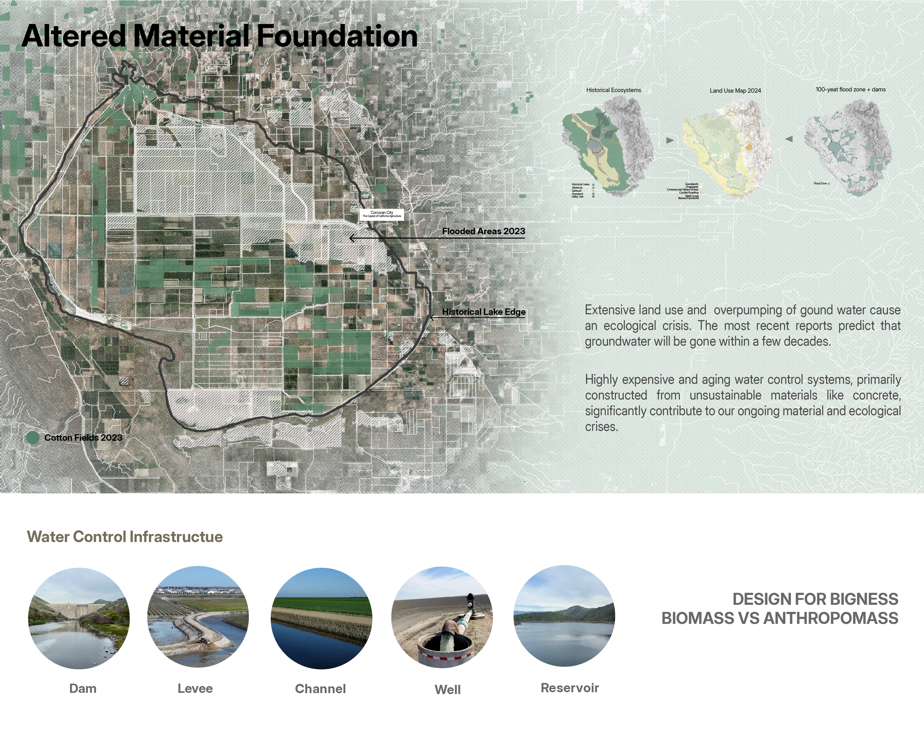 The project investigates the material characteristics of cotton, a key non-food crop with historical significance in the Tulare Lake basin. It addresses environmental imbalances caused by conventional farming and unsustainable water management and seeks sustainable approaches to restore the lake's ecosystem by focusing on material considerations and advocating for a material ecology approach.