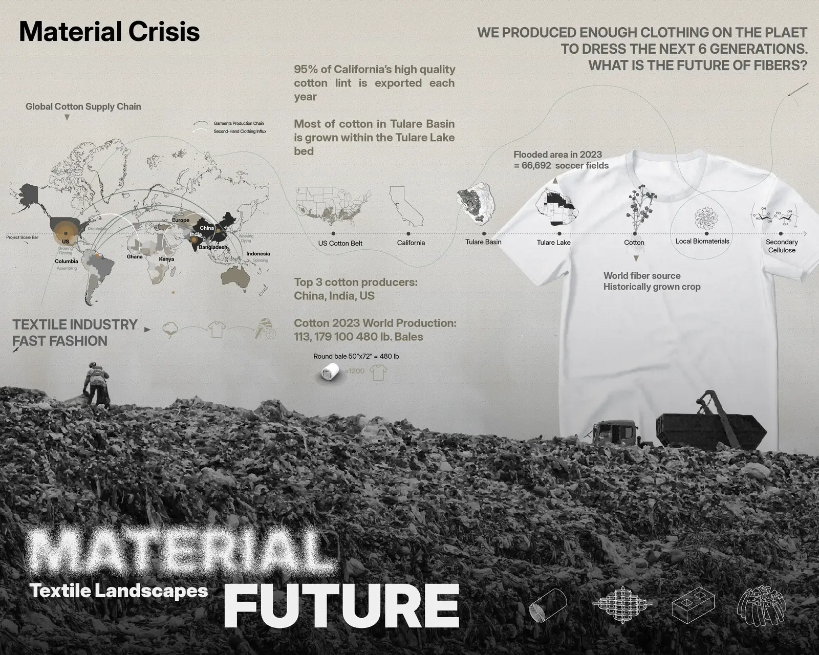 “Textile Landscapes” explores the material characteristics and historical significance of cotton in the Central Valley, focusing on the environmental impacts of large-scale unsustainable farming and water management. It advocates for a material ecology approach that utilizes cotton waste in biocomposites to enhance lake restoration practices and integrate regenerative agriculture for a sustainable future. The project examines cotton's symbolic meaning and impact as a fiber crop, from a global perspective to local materials, within the Tulare Lakebed, once the largest lake west of the Mississippi, now drained for farming. The supply chain of cotton, from boll to garment, highlights its global impact and significant role in textile production and fast fashion.
